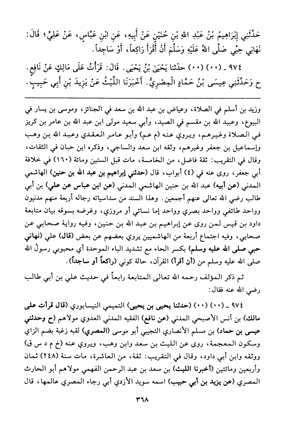 حَدَّثَنِي إِبْرَاهِيمُ بْنُ عَبْدِ اللهِ بْنِ حُنَينٍ عَنْ أَبِيهِ، عَنِ ابْنِ عَبَّاسٍ، عَنْ عَلِيٍّ؛ قَال: نَهَانِي حِبِّي صَلَّى اللهُ عَلَيهِ وَسَلَّمَ أَنْ أَقْرَأَ رَاكِعًا، أَوْ سَاجِدًا.