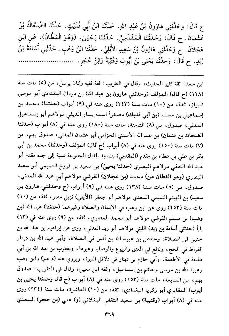 ابن سعد: ثقة كثير الحديث، وقال في التقريب: ثقة فقيه وكان يرسل، من (٥) مات سنة (١٢٨) (ح قال) المؤلف (وحدثني هارون بن عبد الله) بن مروان البغدادي أبو موسى البزاز، ثقة، من (١٠) مات سنة (٢٤٣) روى عنه في (٩) أبواب (حدثنا) محمد بن إسماعيل بن مسلم (بن أبي فديك) مصغرًا اسمه يسار الديلي مولاهم أبو إسماعيل المدني، صدوق، من (٨) الثامنة، مات سنة (١٨٠) روى عنه في (٨) أبواب (حدثنا الضحاك بن عثمان) بن عبد الله الأسدي الحزامي أبو عثمان المدني، صدوق يهم، من (٧) مات سنة (١٥٠) روى عنه في (٨) أبواب (ح قال) المؤلف (وحدثنا) محمد بن أبي بكر بن علي بن عطاء بن مقدم (المقدمي) بتشديد الدال المفتوحة نسبة إلى جده مقدم أبو عبد الله الثقفي مولاهم البصري (حدثنا يحيى) بن سعيد بن فروخ التميمي أبو سعيد البصري (وهو القطان عن) محمد (بن عجلان) القرشي مولاهم أبي عبد الله المدني، صدوق، من (٥) مات سنة (١٣٨) روى عنه في (٩) أبواب (ح وحدثني هارون بن سعيد) بن الهيثم التميمي السعدي مولاهم أبو جعفر (الأيلي) نزيل مصر، ثقة، من (١٠) مات سنة (٢٥٣) روى عن ابن وهب في الإيمان والصلاة وغيرهما (حدثنا) عبد الله (بن وهب) بن مسلم القرشي مولاهم أبو محمد المصري، ثقة، من (٩) روى عنه في (١٣) بابا (حدثني أسامة بن زيد) الليثي مولاهم أبو زيد المدني، روى عن إبراهيم بن عبد الله بن حنين في الصلاة، وحفص بن عبيد الله بن أنس في الصلاة، وأبي عبد الله بن دينار القراظ في الحج، ونافع في العتق والبيوع والوصايا وغيرها، ويعقوب بن عبد الله بن أبي طلحة في الأطعمة، وأبي حازم بن دينار في دلائل النبوة، ويروي عنه (م عم) وابن وهب وعبيد الله بن موسى وحاتم بن إسماعيل، وثقه ابن معين، وقال في التقريب: صدوق يهم، من السابعة، مات سنة (١٥٣) روى عنه في (٨) أبواب (ح قال وحدثنا يحيى بن أيوب (المقابري أبو زكريا البغدادي، ثقة، من (١٠) العاشرة، مات سنة (٢٣٤) روى عنه في (٨) أبواب (وقتيبة) بن سعيد الثقفي البغلاني (و) علي (بن حجر) السعدي