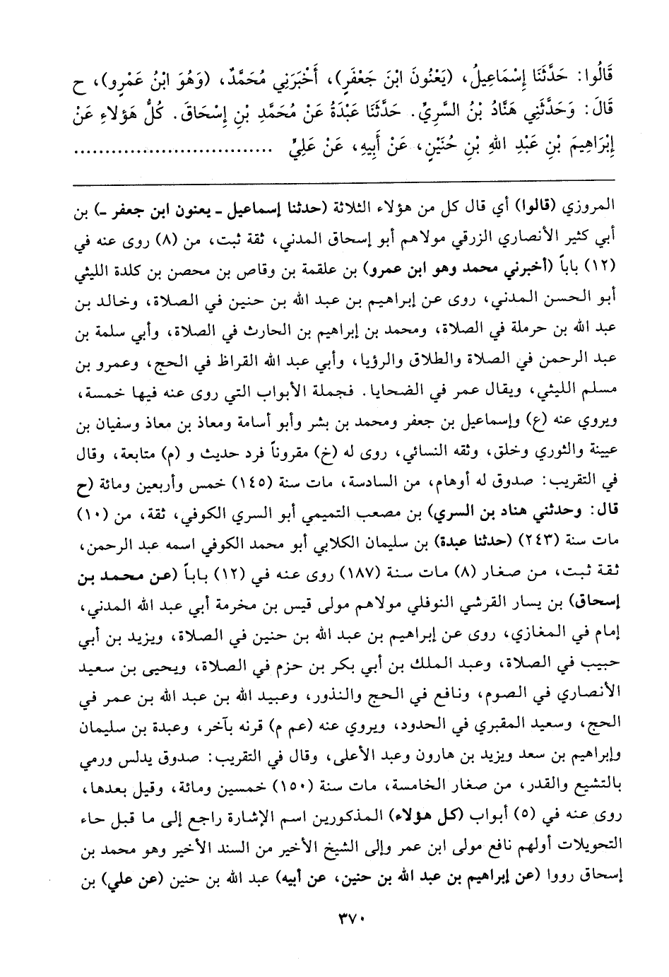 المروزي (قالوا) أي قال كل من هؤلاء الثلاثة (حدثنا إسماعيل -يعنون ابن جعفر-) بن أبي كثير الأنصاري الزرقي مولاهم أبو إسحاق المدني، ثقة ثبت، من (٨) روى عنه في (١٢) بابا (أخبرني محمد وهو ابن عمرو) بن علقمة بن وقاص بن محصن بن كلدة الليثي أبو الحسن المدني، روى عن إبراهيم بن عبد الله بن حنين في الصلاة، وخالد بن عبد الله بن حرملة في الصلاة، ومحمد بن إبراهيم بن الحارث في الصلاة، وأبي سلمة بن عبد الرحمن في الصلاة والطلاق والرؤيا، وأبي عبد الله القراظ في الحج، وعمرو بن مسلم الليثي، ويقال عمر في الضحايا. فجملة الأبواب التي روى عنه فيها خمسة، ويروي عنه (ع) وإسماعيل بن جعفر ومحمد بن بشر وأبو أسامة ومعاذ بن معاذ وسفيان بن عيينة والثوري وخلق، وثقه النسائي، روى له (خ) مقرونًا فرد حديث و (م) متابعة، وقال في التقريب: صدوق له أوهام، من السادسة، مات سنة (١٤٥) خمس وأربعين ومائة (ح قال: وحدثني هناد بن السري) بن مصعب التميمي أبو السري الكوفي، ثقة، من (١٠) مات سنة (٢٤٣) (حدثنا عبدة) بن سليمان الكلابي أبو محمد الكوفي اسمه عبد الرحمن، ثقة ثبت، من صغار (٨) مات سنة (١٨٧) روى عنه في (١٢) بابا (عن محمد بن إسحاق) بن يسار القرشي النوفلي مولاهم مولى قيس بن مخرمة أبي عبد الله المدني، إمام في المغازي، روى عن إبراهيم بن عبد الله بن حنين في الصلاة، ويزيد بن أبي حبيب في الصلاة، وعبد الملك بن أبي بكر بن حزم في الصلاة، ويحيى بن سعيد الأنصاري في الصوم، ونافع في الحج والنذور، وعبيد الله بن عبد الله بن عمر في الحج، وسعيد المقبري في الحدود، ويروي عنه (عم م) قرنه بآخر، وعبدة بن سليمان وإبراهيم بن سعد ويزيد بن هارون وعبد الأعلى، وقال في التقريب: صدوق يدلس ورمي بالتشيع والقدر، من صغار الخامسة، مات سنة (١٥٠) خمسين ومائة، وقيل بعدها، روى عنه في (٥) أبواب كل هؤلاء) المذكورين اسم الإشارة راجع إلى ما قبل حاء التحويلات أولهم نافع مولى ابن عمر وإلى الشيخ الأخير من السند الأخير وهو محمد بن إسحاق رووا (عن إبراهيم بن عبد الله بن حنين، عن أبيه) عبد الله بن حنين (عن علي) بن