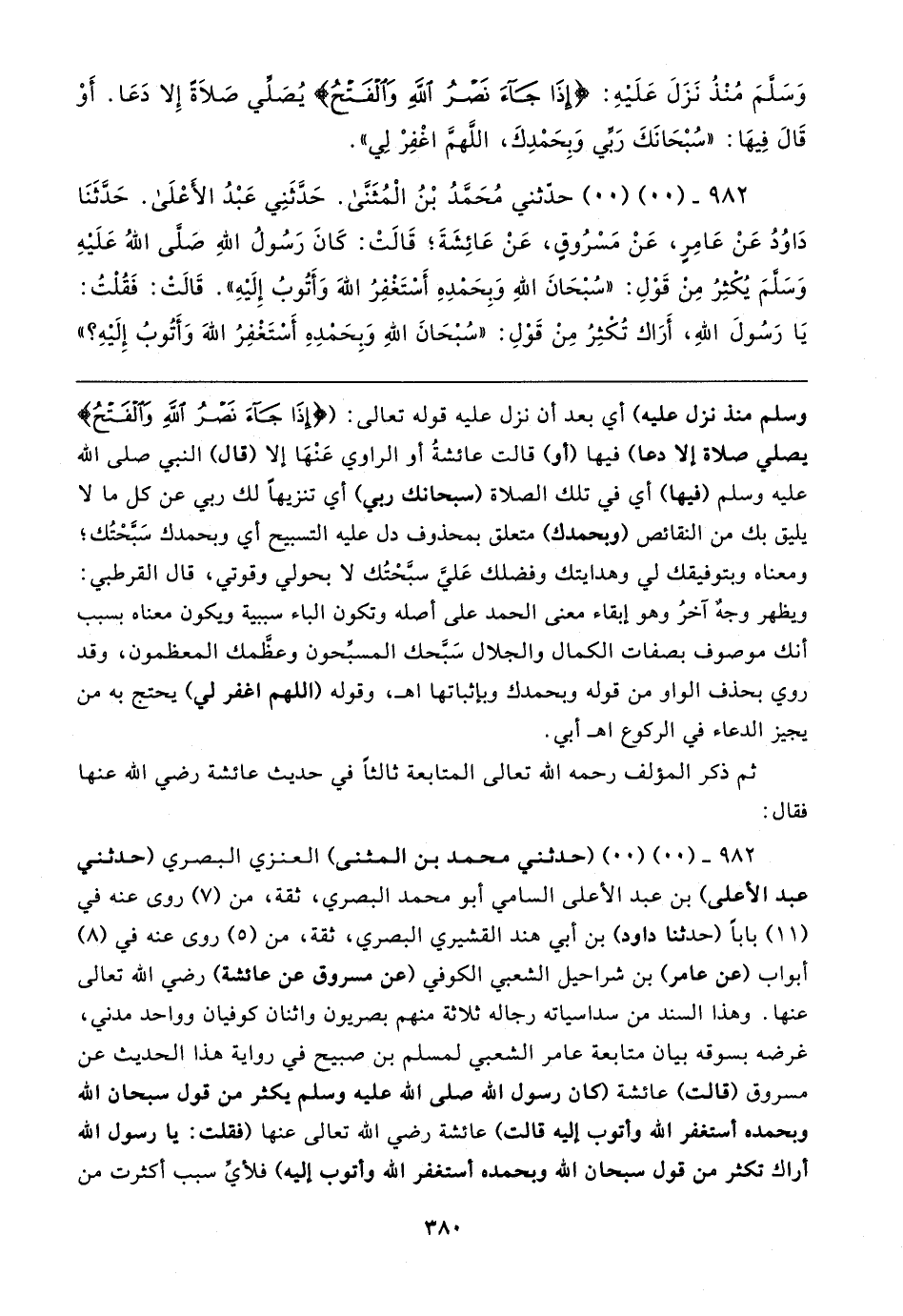 ٩٨٢ - (٠٠) (٠٠) (حدثني محمد بن المثنى) العنزي البصري (حدثني عبد الأعلى) بن عبد الأعلى السامي أبو محمد البصري، ثقة، من (٧) روى عنه في (١١) بابا (حدثنا داود) بن أبي هند القشيري البصري، ثقة، من (٥) روى عنه في (٨) أبواب (عن عامر) بن شراحيل الشعبي الكوفي (عن مسروق عن عائشة) رضي الله تعالى عنها. وهذا السند من سداسياته رجاله ثلاثة منهم بصريون واثنان كوفيان وواحد مدني، غرضه بسوقه بيان متابعة عامر الشعبي لمسلم بن صبيح في رواية هذا الحديث عن مسروق (قالت) عائشة (كان رسول الله صلى الله عليه وسلم يكثر من قول سبحان الله وبحمده أستغفر الله وأتوب إليه قالت) عائشة رضي الله تعالى عنها (فقلت: يا رسول الله أراك تكثر من قول سبحان الله وبحمده أستغفر الله وأتوب إليه) فلأيِّ سبب أكثرت من