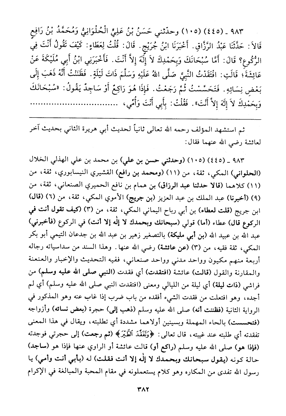 ٩٨٣ - (٤٤٥) (١٠٥) (وحدثني حسن بن علي) بن محمد بن علي الهذلي الخلال (الحلواني) المكي، ثقة، من (١١) (ومحمد بن رافع) القشيري النيسابوري، ثقة، من (١١) كلاهما (قالا حدثنا عبد الرزاق) بن همام بن نافع الحميري الصنعاني، ثقة، من (٩) (أخبرنا) عبد الملك بن عبد العزيز (بن جريج) الأموي المكي، ثقة، من (٦) (قال) ابن جريج (قلت لعطاء) بن أبي رباح اليماني المكي، ثقة، من (٣) (كيف تقول أنت في الركوع قال) عطاء (أما) قولي (سبحانك وبحمدك لا إله إلا أنت) في الركوع (فأخبرني) عبد الله بن عبيد الله (بن أبي مليكة) بالتصغير زهير بن عبد الله بن جدعان التيمي أبو بكر المكي، ثقة فقيه، من (٣) (عن عائشة) رضي الله عنها. وهذا السند من سداسياته رجاله أربعة منهم مكيون وواحد مدني وواحد صنعاني، ففيه التحديث والإخبار والعنعنة والمقارنة والقول (قالت) عائشة (افتقدت) أي فقدت (النبي صلى الله عليه وسلم) من فراشي (ذات ليلة) أي ليلة من الليالي ومعنى (افتقدت النبي صلى الله عليه وسلم) أي لم أجده، وهو افتعلت من فقدت الشيء أفقده من باب ضرب إذا غاب عنه وهو المذكور في الرواية الثانية (فظننت أنه) صلى الله عليه وسلم (ذهب إلى) حجرة (بعض نسائه) وأزواجه (فتحسست) بالحاء المهملة وبسينين أولاهما مشددة أي تطلبته، ويقال في هذا المعنى تفقدته أي طلبته عند غيبته، قال تعالى: {وَتَفَقَّدَ الطَّيرَ} (ثم رجعت) إلى حجرتي فوجدته (فإذا هو) صلى الله عليه وسلم (راكع أو) قالت عائشة أو الراوي عنها فإذا هو (ساجد) حالة كونه (يقول سبحانك وبحمدك لا إله إلا أنت فقلت) له (بأبي أنت وأمي) يا رسول الله تفدى من المكاره وهو كلام يستعملونه في مقام المحبة والمبالغة في الإكرام