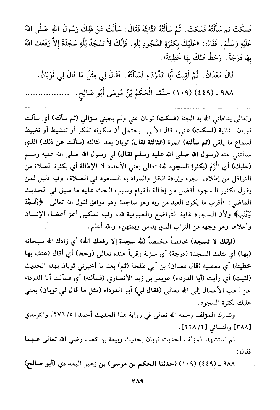 فَسَكَتَ ثم سَأَلْتُهُ فَسَكَتَ. ثُمَّ سَأَلْتُهُ الثَّالِثَةَ فَقَال: سَألْتُ عَنْ ذَلِكَ رَسُولَ اللهِ صَلَّى اللهُ عَلَيهِ وَسَلَّمَ. فَقَال: "عَلَيكَ بِكَثْرَةِ السُّجُودِ للهِ. فَإِنَّكَ لَا تَسْجُدُ لِلهِ سَجْدَةً إلا رَفَعَكَ اللهُ بِهَا دَرَجَةً. وَحَطَّ عَنْكَ بِهَا خَطِيئَةً".