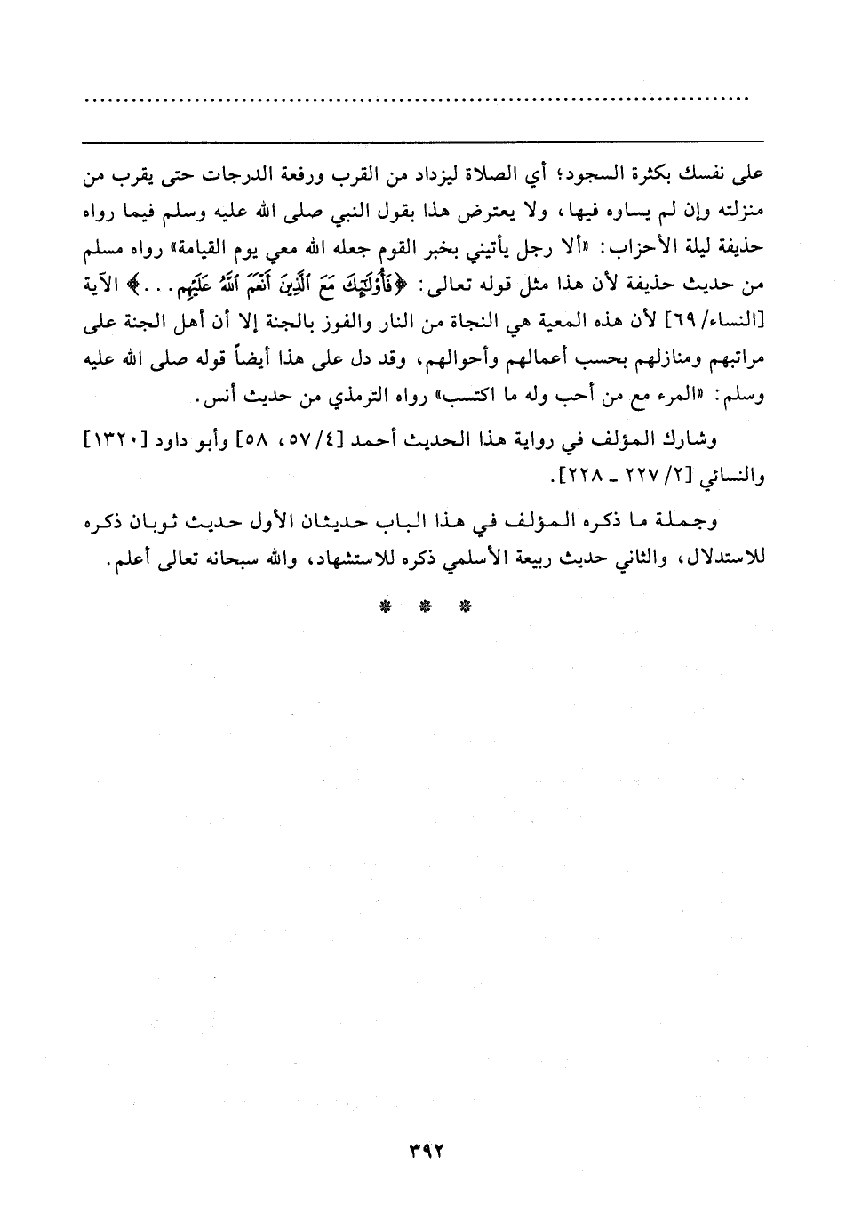 وجملة ما ذكره المؤلف في هذا الباب حديثان الأول حديث ثوبان ذكره للاستدلال، والثاني حديث ربيعة الأسلمي ذكره للاستشهاد، والله سبحانه تعالى أعلم.
