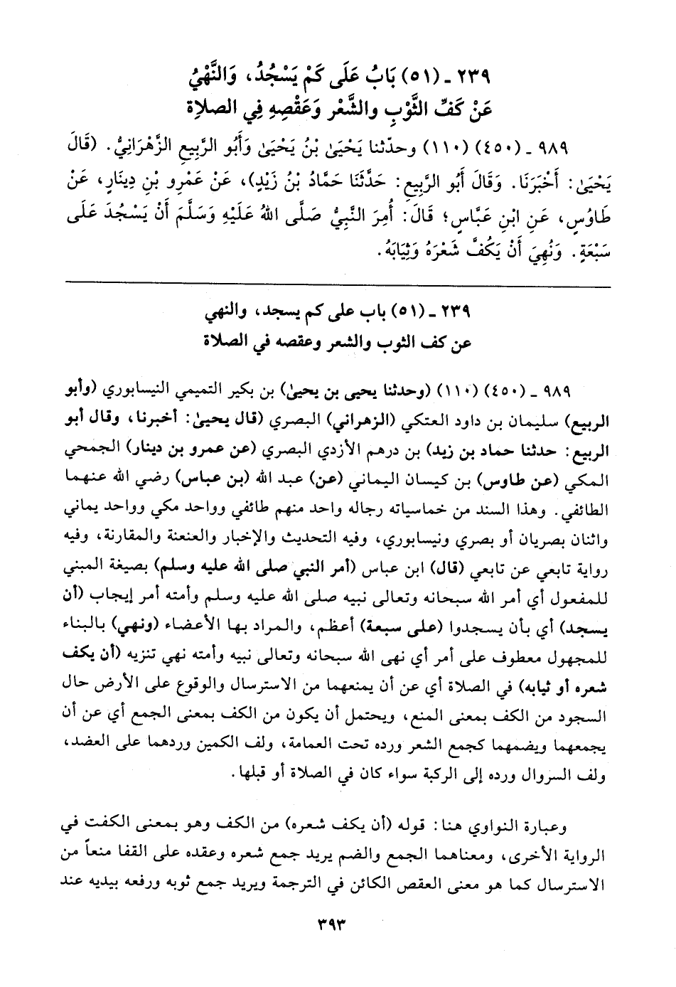 ٩٨٩ - (٤٥٠) (١١٠) وحدّثنا يَحْيَى بْنُ يَحْيَى وَأَبُو الرَّبِيعِ الزَّهْرَانِيُّ. (قَال يَحْيَى: أَخْبَرَنَا. وَقَال أَبُو الرَّبِيعِ: حَدَّثَنَا حَمادُ بْنُ زَيدٍ)، عَنْ عَمْرِو بْنِ دِينَارٍ، عَنْ طَاوُسٍ، عَنِ ابْنِ عَبَّاسٍ؛ قَال: أُمِرَ النَّبِيّ صَلَّى اللهُ عَلَيهِ وَسَلَّمَ أَنْ يَسْجُدَ عَلَى سَبْعَةٍ. وَنُهِيَ أَنْ يَكُفَّ شَعْرَهُ وَثِيَابَهُ