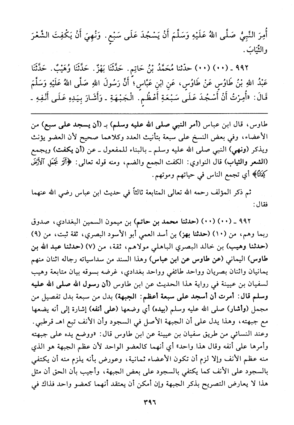 ٩٩٢ - (٠٠) (٠٠) حدَّثنا مُحَمَّدُ بْنُ حَاتِمٍ. حَدَّثنَا بَهْزٌ. حَدَّثنَا وُهَيبٌ. حَدَّثنَا عَبْدُ اللهِ بْنُ طَاوُسٍ عَنْ طَاوُسٍ، عَنِ ابْنِ عَبَّاسٍ؛ أَن رَسُولَ اللهِ صَلَّى اللهُ عَلَيهِ وَسَلَّمَ قَال: "أُمِرْتُ أَنْ أَسْجُدَ عَلَى سَبْعَةِ أَعْظُمٍ. الْجَبْهَةِ -وَأَشَارَ بِيَدِهِ عَلَى أَنْفِهِ-
