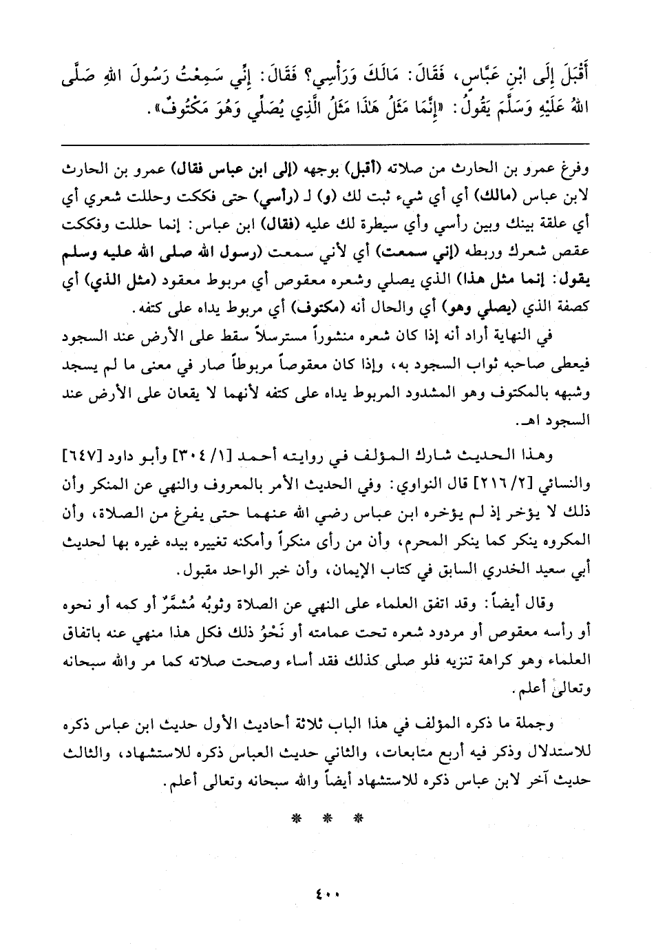 أَقْبَلَ إِلَى ابْنِ عَبَّاسٍ، فَقَال: مَا لَكَ وَرَأسِي؟ فَقَال: إِني سَمِعْتُ رَسُولَ اللهِ صَلَّى اللهُ عَلَيهِ وَسَلَّمَ يَقُولُ: "إِنَّمَا مَثَلُ هَذَا مَثَلُ الَّذِي يُصَلِّي وَهُوَ مَكتُوفٌ"