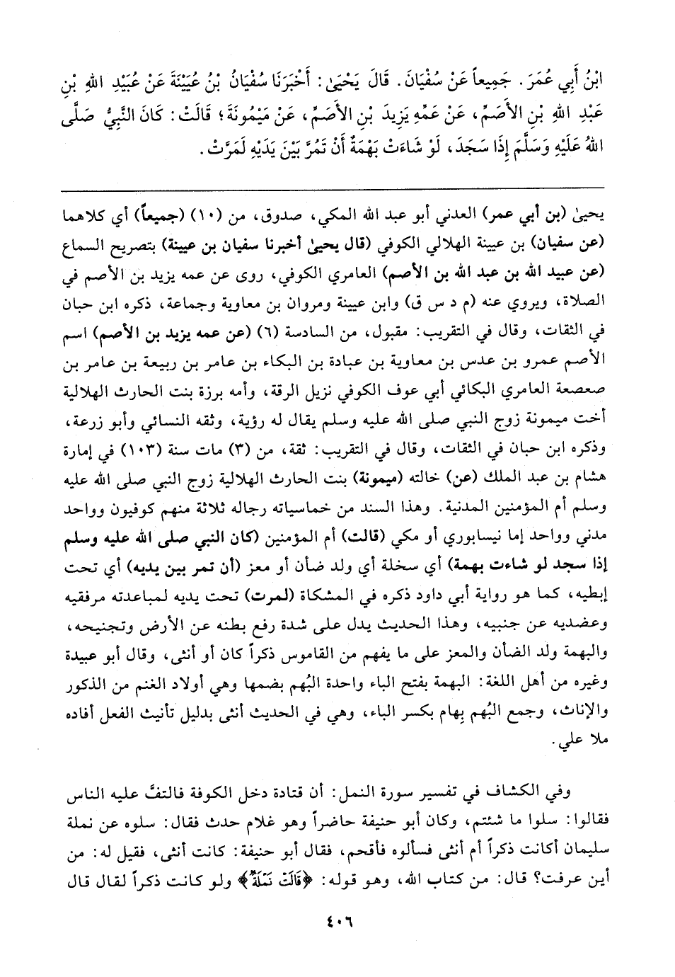 ابْنُ أَبِي عُمَرَ. جَمِيعًا عَنْ سُفْيَانَ. قَال يَحْيَى: أَخْبَرَنَا سُفْيَانُ بْنُ عُيَينَةَ عَنْ عُبَيدِ اللهِ بْنِ عَبْدِ اللهِ بْنِ الأَصَمِّ، عَنْ عَمِّهِ يَزِيدَ بْنِ الأصَمِّ، عَنْ مَيمُونَةَ؛ قَالتْ: كَانَ النَّبِيُّ صَلَّى اللهُ عَلَيهِ وَسَلَّمَ إِذَا سَجَدَ، لَوْ شَاءَتْ بَهْمَةٌ أَنْ تَمُرَّ بَينَ يَدَيهِ لَمَرَّتْ