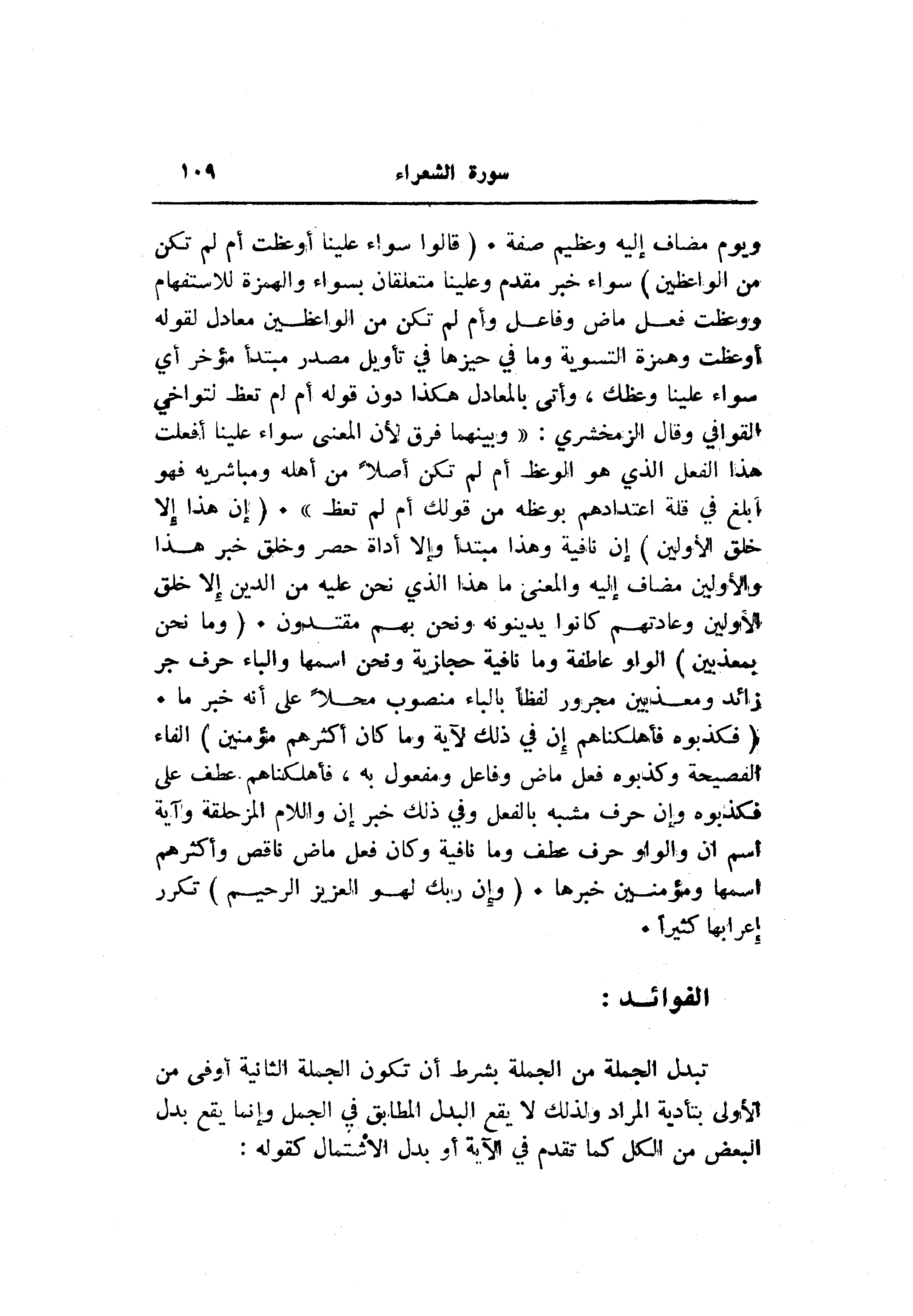 ويوم مضاف إليه وعظيم صفة. (قالُوا سَواءٌ عَلَيْنا أَوَعَظْتَ أَمْ لَمْ تَكُنْ مِنَ الْواعِظِينَ) سواء خبر مقدم وعلينا متعلقان بسواء والهمزة للاستفهام ووعظت فعل ماض وفاعل وأم لم تكن من الواعظين معادل لقوله أوعظت وهمزة التسوية وما في حيزها في تأويل مصدر مبتدأ مؤخر أي سواء علينا وعظك، وأتى بالمعادل هكذا دون قوله أم لم تعظ لتواخي القوافي وقال الزمخشري: «وبينهما فرق لأن المعنى سواء علينا أفعلت هذا الفعل الذي هو الوعظ أم لم تكن أصلا من أهله ومباشريه فهو أبلغ في قلة اعتدادهم بوعظه من قولك أم لم تعظ» . (إِنْ هذا إِلَّا خُلُقُ الْأَوَّلِينَ) إن نافية وهذا مبتدأ وإلا أداة حصر وخلق خبر هذا والأولين مضاف إليه والمعنى ما هذا الذي نحن عليه من الدين إلا خلق الأولين وعادتهم كانوا يدينونه ونحن بهم مقتدون. (وَما نَحْنُ بِمُعَذَّبِينَ) الواو عاطفة وما نافية حجازية ونحن اسمها والباء حرف جر زائد ومعذبين مجرور لفظا بالباء منصوب محلا على أنه خبر ما.