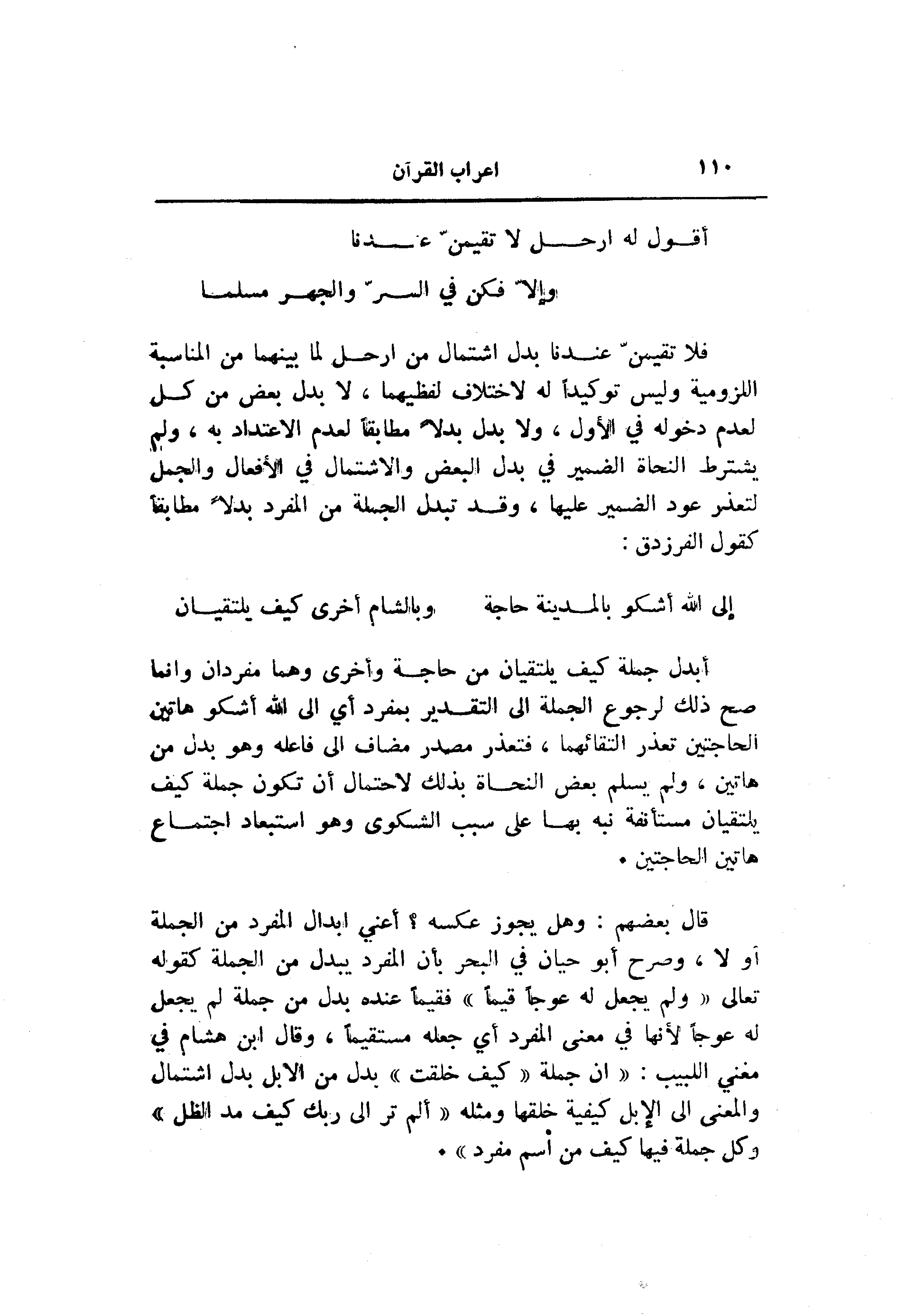 أبدل جملة كيف يلتقيان من حاجة وأخرى وهما مفردان وانما صح ذلك لرجوع الجملة الى التقدير بمفرد أي الى الله أشكو هاتين الحاجتين تعذر التقائهما، فتعذر مصدر مضاف الى فاعله وهو بدل من هاتين، ولم يسلم بعض النحاة بذلك لاحتمال أن تكون جملة كيف يلتقيان مستأنفة نبه بها على سبب الشكوى وهو استبعاد اجتماع هاتين الحاجتين.