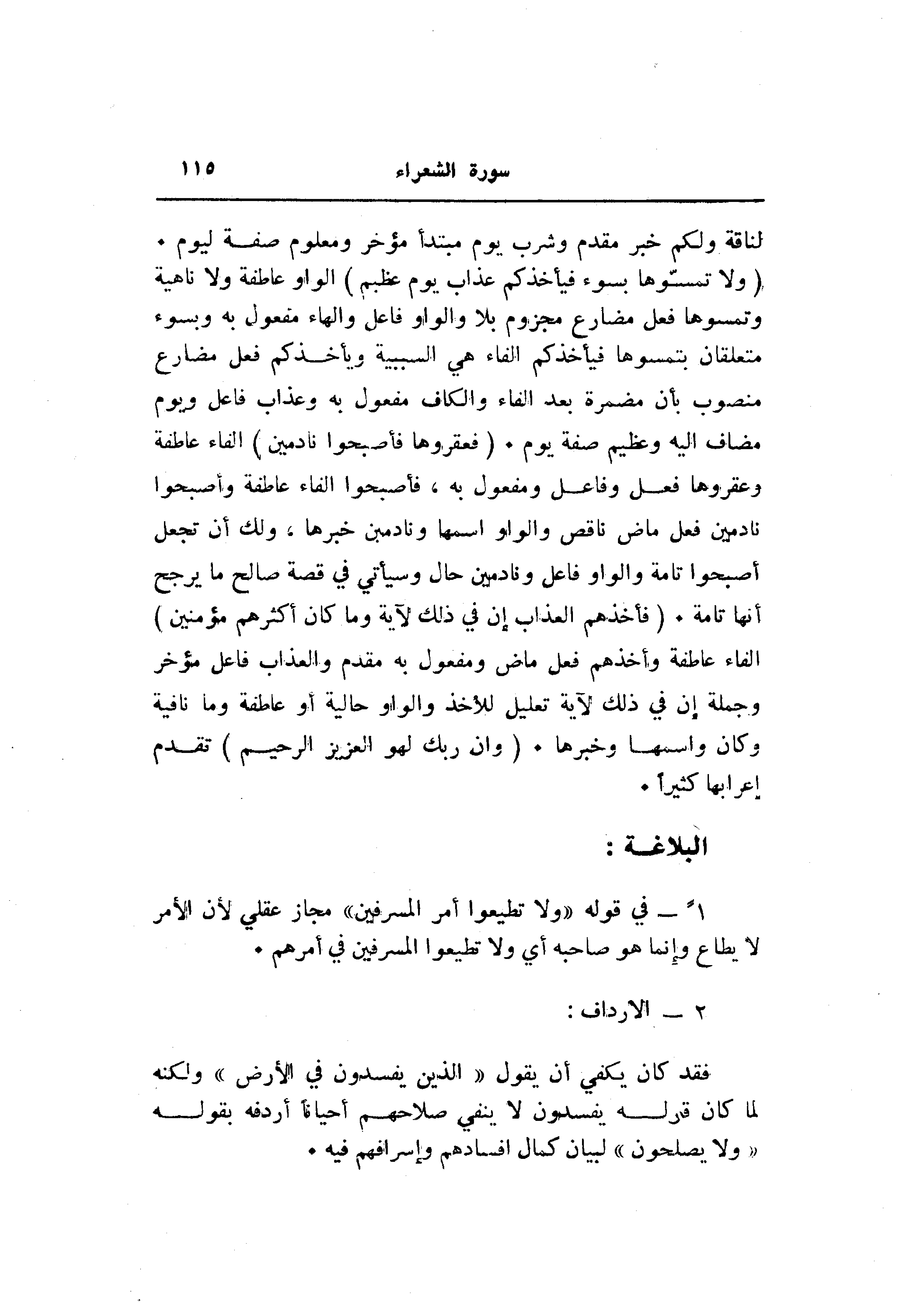 (وَلا تَمَسُّوها بِسُوءٍ فَيَأْخُذَكُمْ عَذابُ يَوْمٍ عَظِيمٍ) الواو عاطفة ولا ناهية وتمسوها فعل مضارع مجزوم بلا والواو فاعل والهاء مفعول به وبسوء متعلقان بتمسوها فيأخذكم الفاء هي السببية ويأخذكم فعل مضارع منصوب بأن مضمرة بعد الفاء والكاف مفعول به وعذاب فاعل ويوم مضاف اليه وعظيم صفة يوم. (فَعَقَرُوها فَأَصْبَحُوا نادِمِينَ) الفاء عاطفة وعقروها فعل وفاعل ومفعول به، فأصبحوا الفاء عاطفة وأصبحوا نادمين فعل ماض ناقص والواو اسمها ونادمين خبرها، ولك أن تجعل أصبحوا تامة والواو فاعل ونادمين حال وسيأتي في قصة صالح ما يرجح أنها تامة. (فَأَخَذَهُمُ الْعَذابُ إِنَّ فِي ذلِكَ لَآيَةً وَما كانَ أَكْثَرُهُمْ مُؤْمِنِينَ) الفاء عاطفة وأخذهم فعل ماض ومفعول به مقدم والعذاب فاعل مؤخر وجملة إن في ذلك لآية تعليل للأخذ والواو حالية أو عاطفة وما نافية وكان واسمها وخبرها. (وَإِنَّ رَبَّكَ لَهُوَ الْعَزِيزُ الرَّحِيمُ) تقدم إعرابها كثيرا.