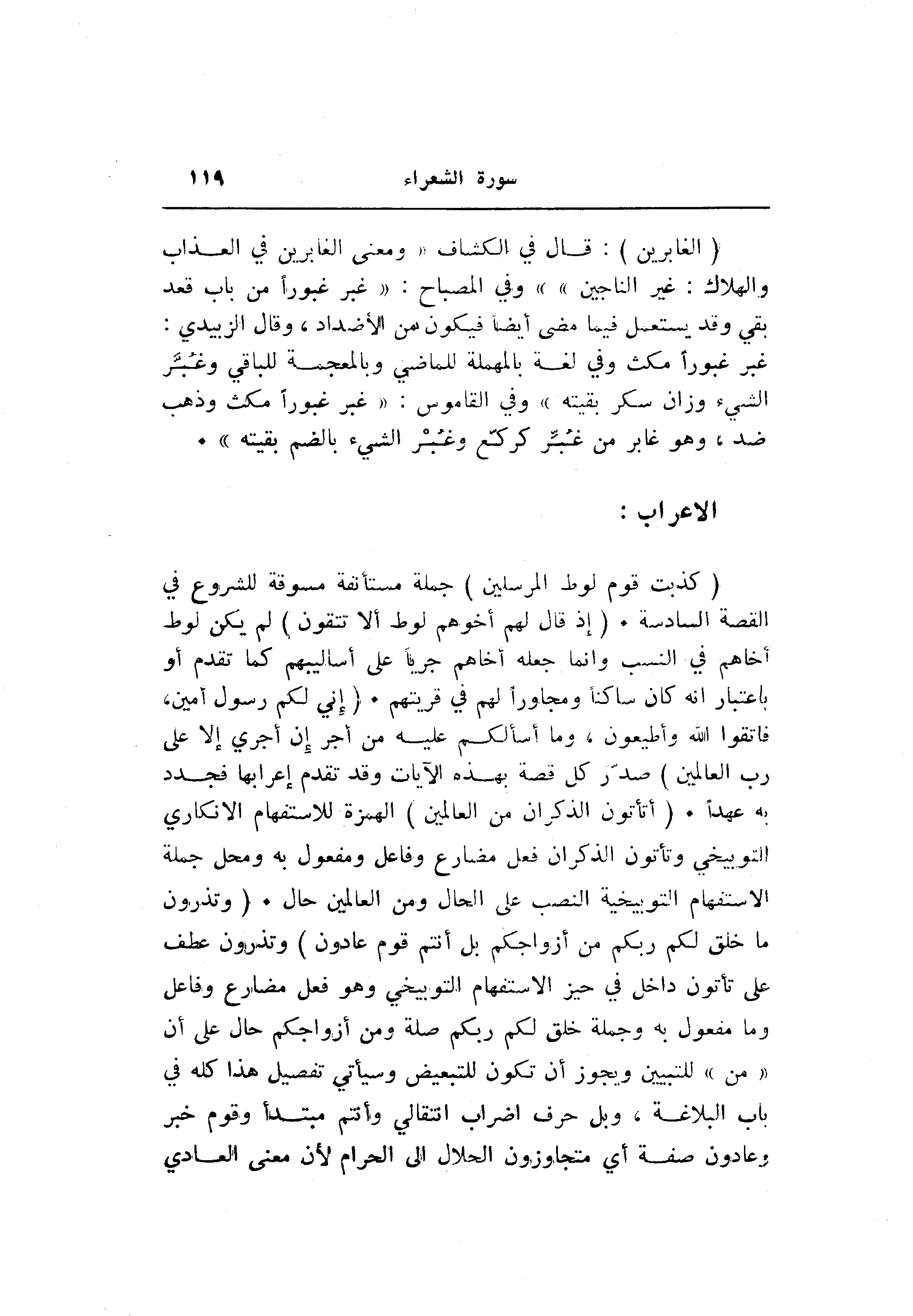 (كَذَّبَتْ قَوْمُ لُوطٍ الْمُرْسَلِينَ) جملة مستأنفة مسوقة للشروع في القصة السادسة. (إِذْ قالَ لَهُمْ أَخُوهُمْ لُوطٌ أَلا تَتَّقُونَ) لم يكن لوط أخاهم في النسب وانما جعله أخاهم جريا على أساليبهم كما تقدم أو باعتبار انه كان ساكنا ومجاورا لهم في قريتهم. (إِنِّي لَكُمْ رَسُولٌ أَمِينٌ، فَاتَّقُوا اللَّهَ وَأَطِيعُونِ، وَما أَسْئَلُكُمْ عَلَيْهِ مِنْ أَجْرٍ إِنْ أَجْرِيَ إِلَّا عَلى رَبِّ الْعالَمِينَ) صدّر كل قصة بهذه الآيات وقد تقدم إعرابها فجدد به عهدا. (أَتَأْتُونَ الذُّكْرانَ مِنَ الْعالَمِينَ) الهمزة للاستفهام الانكاري التوبيخي وتأتون الذكران فعل مضارع وفاعل ومفعول به ومحل جملة الاستفهام التوبيخية النصب على الحال ومن العالمين حال. (وَتَذَرُونَ ما خَلَقَ لَكُمْ رَبُّكُمْ مِنْ أَزْواجِكُمْ بَلْ أَنْتُمْ قَوْمٌ عادُونَ) وتذرون عطف على تأتون داخل في حيز الاستفهام التوبيخي وهو فعل مضارع وفاعل وما مفعول به وجملة خلق لكم ربكم صلة ومن أزواجكم حال على أن «من» للتبيين ويجوز أن تكون للتبعيض وسيأتي تفصيل هذا كله في باب البلاغة، وبل حرف إضراب انتقالي وأنتم مبتدأ وقوم خبر وعادون صفة أي متجاوزون الحلال الى الحرام لأن معنى العادي