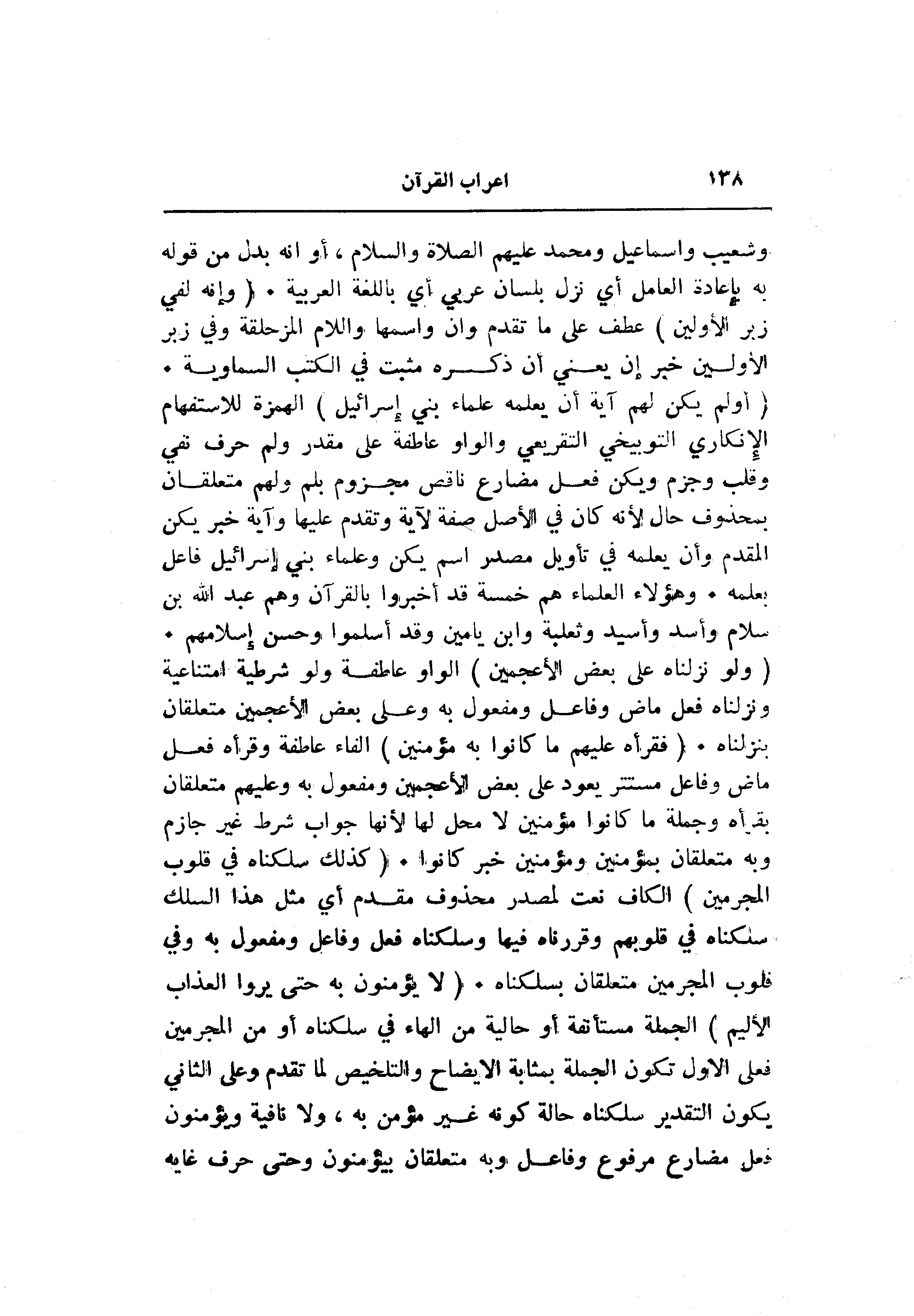 (أَوَلَمْ يَكُنْ لَهُمْ آيَةً أَنْ يَعْلَمَهُ عُلَماءُ بَنِي إِسْرائِيلَ) الهمزة للاستفهام الإنكاري التوبيخي التقريعي والواو عاطفة على مقدر ولم حرف نفي وقلب وجزم ويكن فعل مضارع ناقص مجزوم بلم ولهم متعلقان بمحذوف حال لأنه كان في الأصل صفة لآية وتقدم عليها وآية خبر يكن المقدم وأن يعلمه في تأويل مصدر اسم يكن وعلماء بني إسرائيل فاعل بعلمه. وهؤلاء العلماء هم خمسة قد أخبروا بالقرآن وهم عبد الله بن سلام وأسد وأسيد وثعلبة وابن يامين وقد أسلموا وحسن إسلامهم.