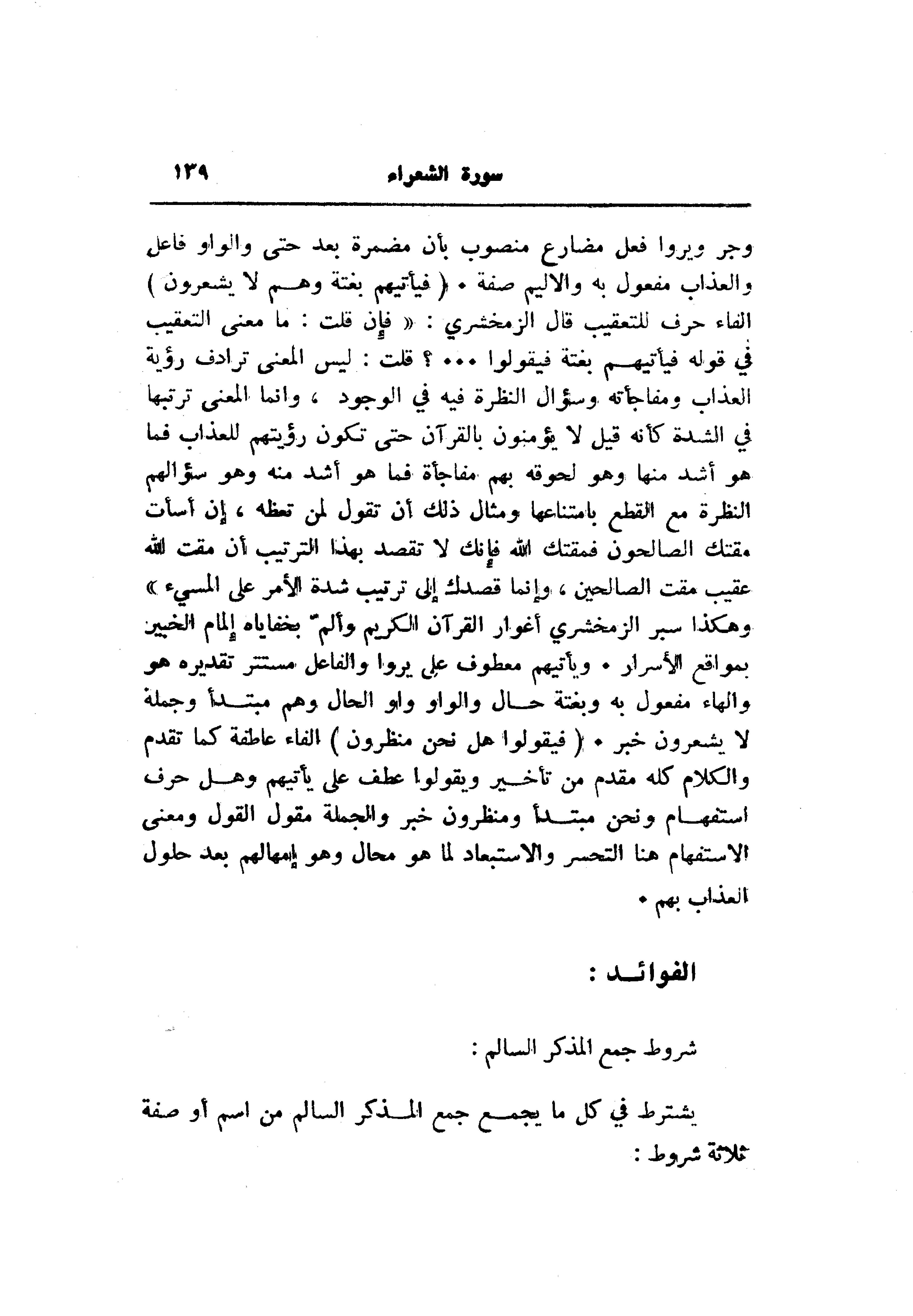 وجر ويروا فعل مضارع منصوب بأن مضمرة بعد حتى والواو فاعل والعذاب مفعول به والأليم صفة. (فَيَأْتِيَهُمْ بَغْتَةً وَهُمْ لا يَشْعُرُونَ) الفاء حرف للتعقيب قال الزمخشري: «فإن قلت: ما معنى التعقيب في قوله فيأتيهم بغتة فيقولوا ... ؟ قلت: ليس المعنى ترادف رؤية العذاب ومفاجأته وسؤال النظرة فيه في الوجود، وانما المعنى ترتبها في الشدة كأنه قيل لا يؤمنون بالقرآن حتى تكون رؤيتهم للعذاب فما هو أشد منها وهو لحوقه بهم مفاجأة فما هو أشد منه وهو سؤالهم النظرة مع القطع بامتناعها ومثال ذلك أن تقول لمن تعظه، إن أسأت مقتك الصالحون فمقتك الله فإنك لا تقصد بهذا الترتيب أن مقت الله عقيب مقت الصالحين، وإنما قصدك إلى ترتيب شدة الأمر على المسيء» وهكذا سبر الزمخشري أغوار القرآن الكريم وألمّ بخفاياه إلمام الخبير بمواقع الأسرار. ويأتيهم معطوف على يروا والفاعل مستتر تقديره هو والهاء مفعول به وبغتة حال والواو واو الحال وهم مبتدأ وجملة لا يشعرون خبر. (فَيَقُولُوا هَلْ نَحْنُ مُنْظَرُونَ) الفاء عاطفة كما تقدم والكلام كله مقدم من تأخير ويقولوا عطف على يأتيهم وهل حرف استفهام ونحن مبتدأ ومنظرون خبر والجملة مقول القول ومعنى الاستفهام هنا التحسر والاستبعاد لما هو محال وهو إمهالهم بعد حلول العذاب بهم.