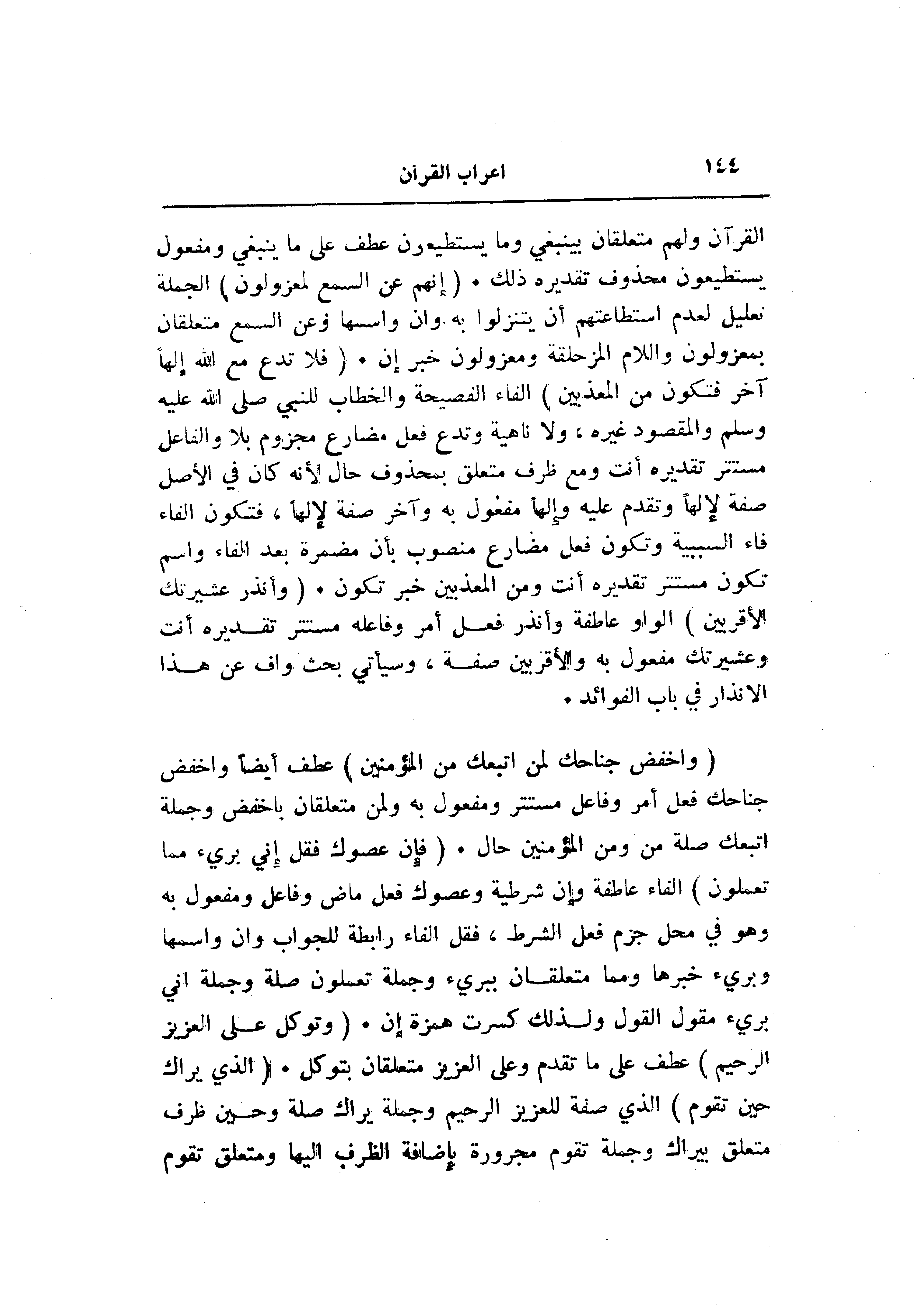القرآن ولهم متعلقان بينبغي وما يستطيعون عطف على ما ينبغي ومفعول يستطيعون محذوف تقديره ذلك. (إِنَّهُمْ عَنِ السَّمْعِ لَمَعْزُولُونَ) الجملة تعليل لعدم استطاعتهم أن يتنزلوا به وان واسمها وعن السمع متعلقان بمعزولون واللام المزحلقة ومعزولون خبر إن. (فَلا تَدْعُ مَعَ اللَّهِ إِلهاً آخَرَ فَتَكُونَ مِنَ الْمُعَذَّبِينَ) الفاء الفصيحة والخطاب للنبي صلى الله عليه وسلم والمقصود غيره، ولا ناهية وتدع فعل مضارع مجزوم بلا والفاعل مستتر تقديره أنت ومع ظرف متعلق بمحذوف حال لأنه كان في الأصل صفة لإلها وتقدم عليه وإلها مفعول به وآخر صفة لإلها، فتكون الفاء فاء السببية وتكون فعل مضارع منصوب بأن مضمرة بعد الفاء واسم تكون مستتر تقديره أنت ومن المعذبين خبر تكون. (وَأَنْذِرْ عَشِيرَتَكَ الْأَقْرَبِينَ) الواو عاطفة وأنذر فعل أمر وفاعله مستتر تقديره أنت وعشيرتك مفعول به والأقربين صفة، وسيأتي بحث واف عن هذا الانذار في باب الفوائد.