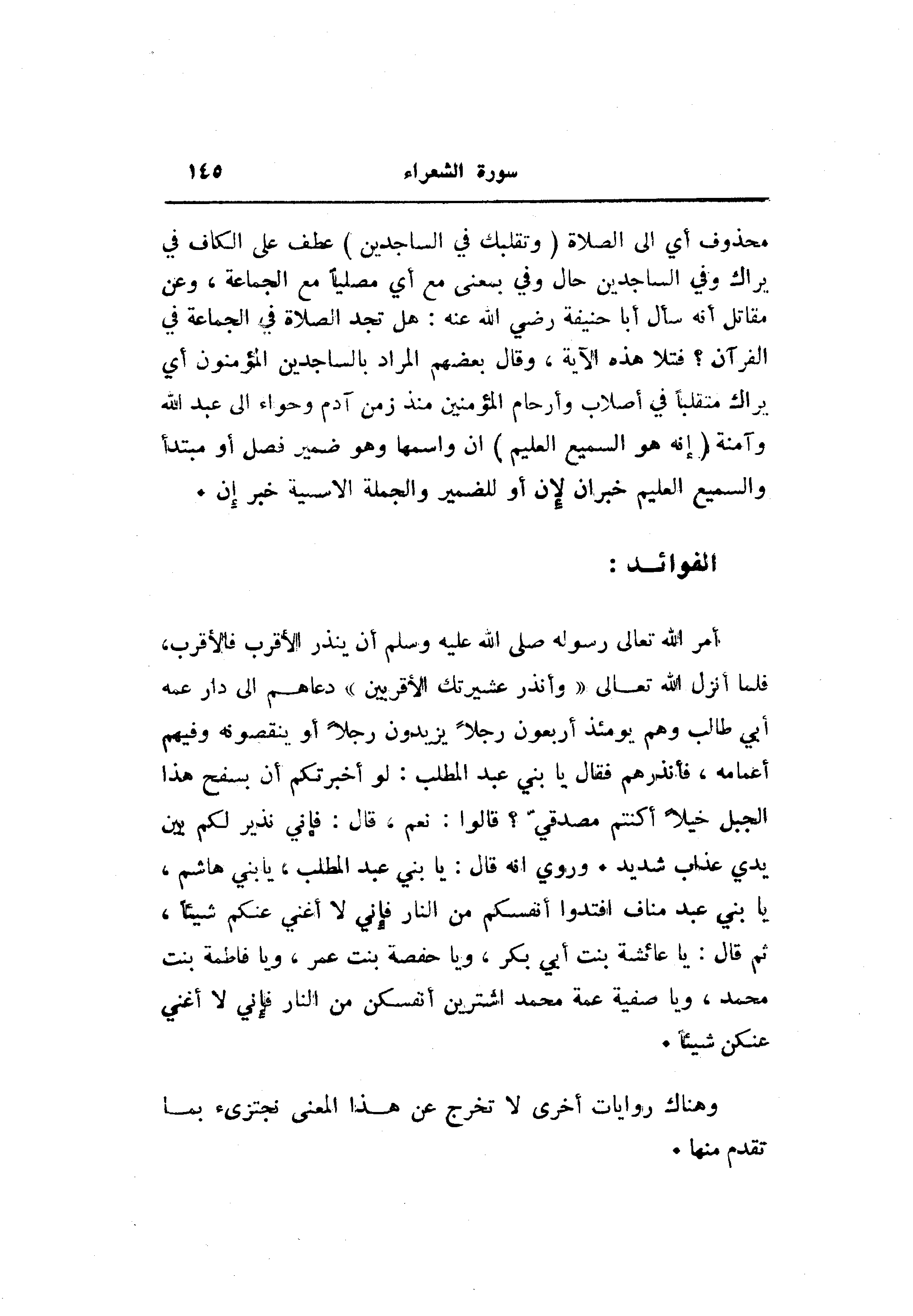 أمر الله تعالى رسوله صلى الله عليه وسلم أن ينذر الأقرب فالأقرب، فلما أنزل الله تعالى «وأنذر عشيرتك الأقربين» دعاهم الى دار عمه أبي طالب وهم يومئذ أربعون رجلا يزيدون رجلا أو ينقصونه وفيهم أعمامه، فأنذرهم فقال يا بني عبد المطلب: لو أخبرتكم أن بسفح هذا الجبل خيلا أكنتم مصدقيّ؟ قالوا: نعم، قال: فإني نذير لكم بين يدي عذاب شديد. وروي انه قال: يا بني عبد المطلب، يا بني هاشم، يا بني عبد مناف افتدوا أنفسكم من النار فإني لا أغني عنكم شيئا، ثم قال: يا عائشة بنت أبي بكر، ويا حفصة بنت عمر، ويا فاطمة بنت محمد، ويا صفية عمة محمد اشترين أنفسكن من النار فإني لا أغني عنكن شيئا.