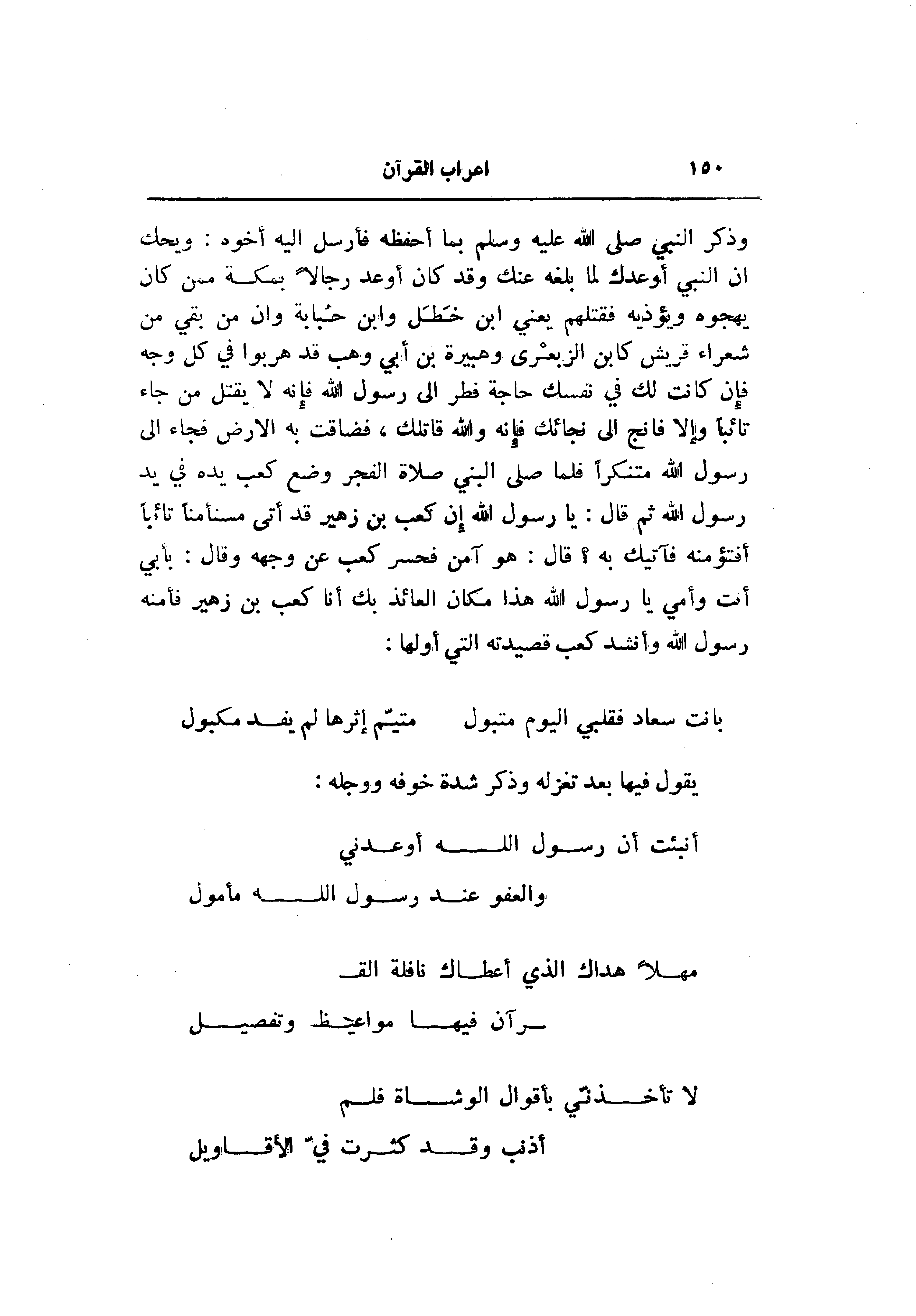 وذكر النبي صلى الله عليه وسلم بما أحفظه فأرسل اليه أخوه: ويحك ان النبي أوعدك لما بلغه عنك وقد كان أوعد رجالا بمكة ممن كان يهجوه ويؤذيه فقتلهم يعني ابن خطل وابن حبابة وان من بقي من شعراء قريش كابن الزبعرى وهبيرة بن أبي وهب قد هربوا في كل وجه فإن كانت لك في نفسك حاجة فطر الى رسول الله فإنه لا يقتل من جاء تائبا وإلا فانج الى نجائك فإنه والله قاتلك، فضاقت به الأرض فجاء الى رسول الله متنكرا فما صلى البني صلاة الفجر وضع كعب يده في يد رسول الله ثم قال: يا رسول الله إن كعب بن زهير قد أتى مسنأمنا تائبا أفتؤمنه فآتيك به؟ قال: هو آمن فحسر كعب عن وجهه وقال: بأبي أنت وأمي يا رسول الله هذا مكان العائذ بك أنا كعب بن زهير فأمنه رسول الله وأنشد كعب قصيدته التي أولها: