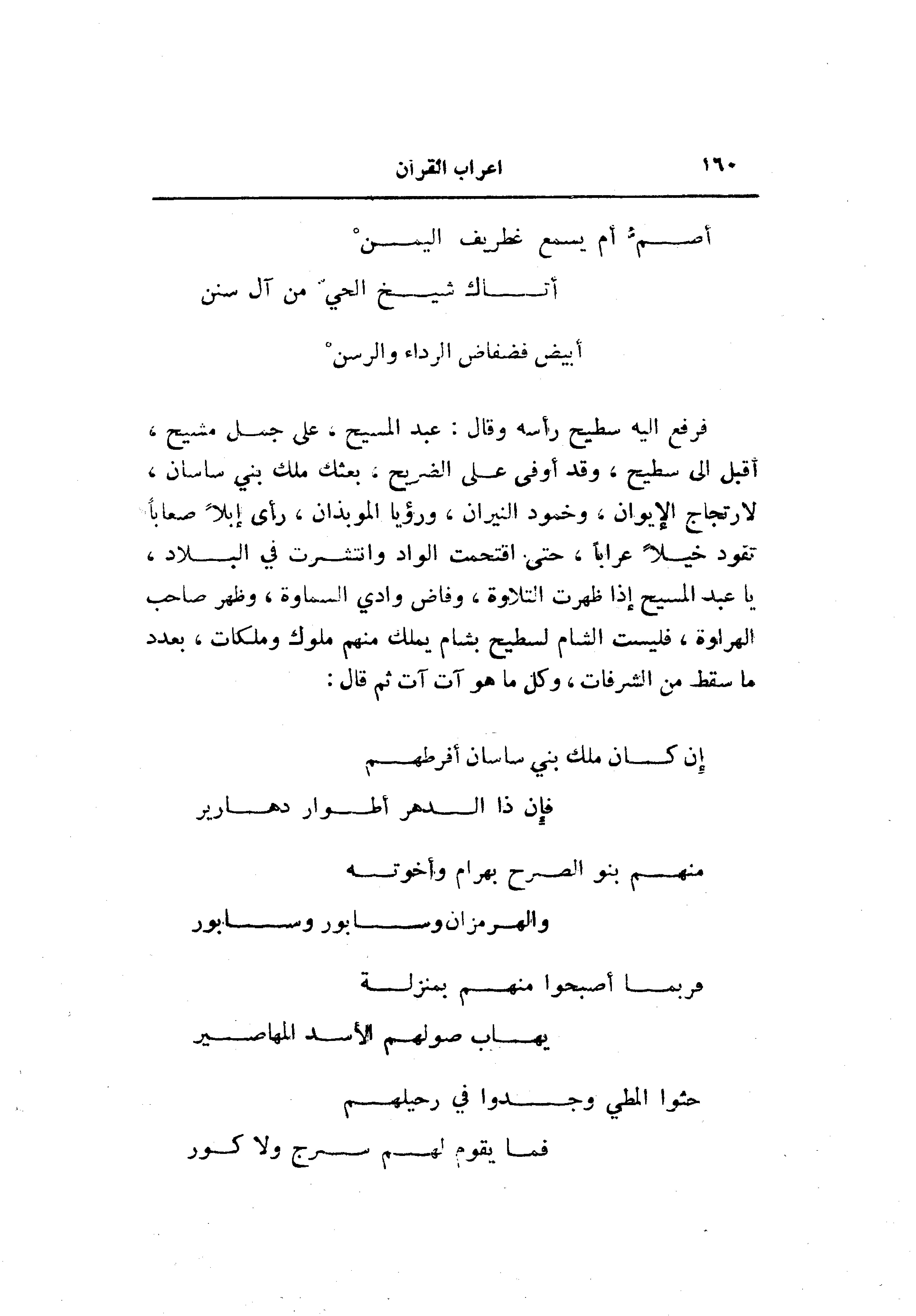 أبيض فضفاض الرداء والرسن فرفع اليه سطيح رأسه وقال: عبد المسيح، على جمل مشيح، أقبل الى سطيح، وقد أوفى على الضريح، بعثك ملك بني ساسان، لارتجاج الإيوان، وخمود النيران، ورؤيا الموبذان، رأى إبلا صعابا تقود خيلا عرابا، حتى اقتحمت الواد وانتشرت في البلاد، يا عبد المسيح إذا ظهرت التلاوة، وفاض وادي السماوة، وظهر صاحب الهراوة، فليست الشام لسطيح بشام يملك منهم ملوك وملكات، بعدد ما سقط من الشرفات، وكل ما هو آت آت ثم قال: