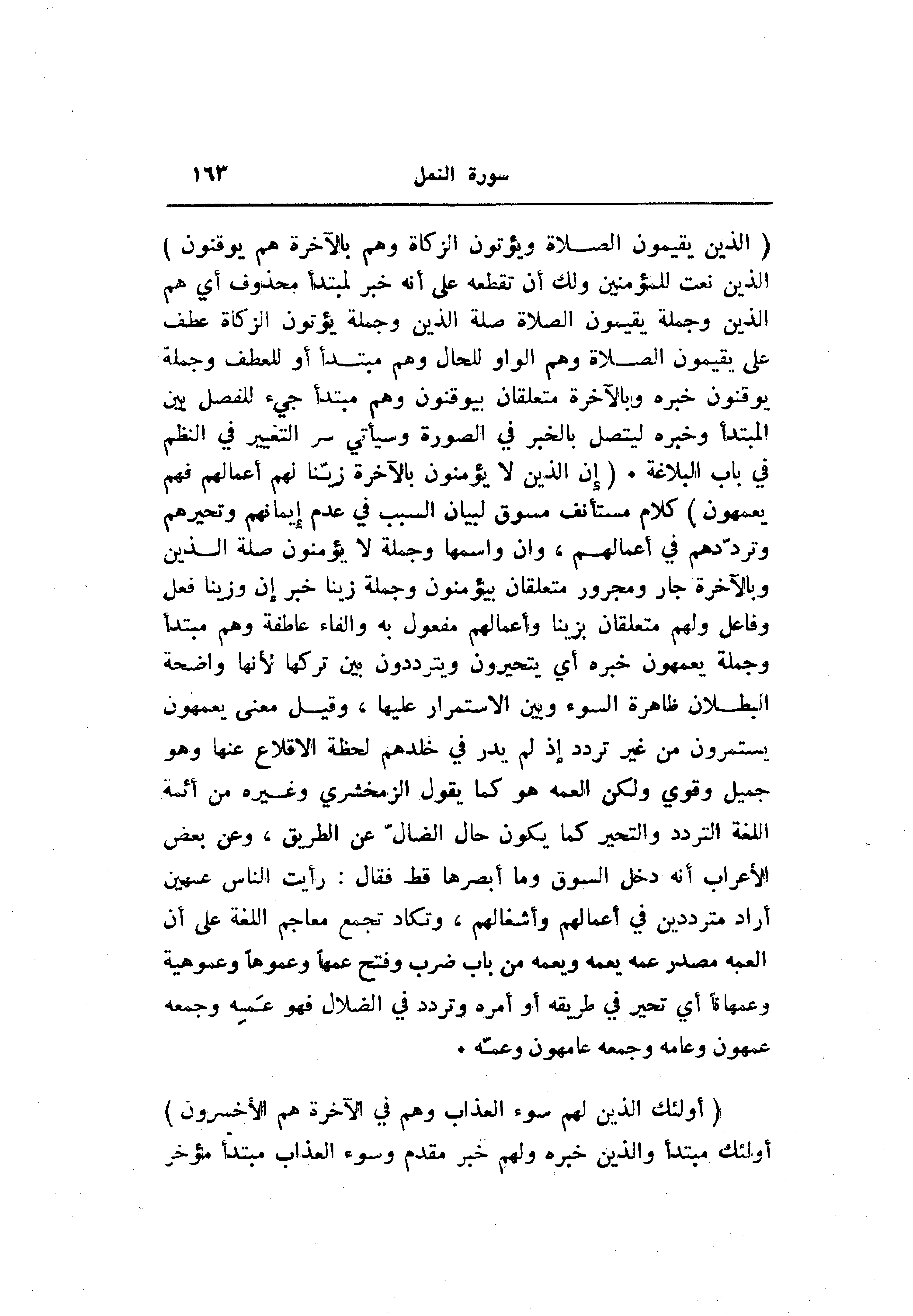 (الَّذِينَ يُقِيمُونَ الصَّلاةَ وَيُؤْتُونَ الزَّكاةَ وَهُمْ بِالْآخِرَةِ هُمْ يُوقِنُونَ) الذين نعت للمؤمنين ولك أن تقطعه على أنه خبر لمبتدأ محذوف أي هم الذين وجملة يقيمون الصلاة صلة الذين وجملة يؤتون الزكاة عطف على يقيمون الصلاة وهم الواو للحال وهم مبتدأ أو للعطف وجملة يوقنون خبره وبالآخرة متعلقان بيوقنون وهم مبتدأ جيء للفصل بين المبتدأ وخبره ليتصل بالخبر في الصورة وسيأتي سر التغيير في النظم في باب البلاغة. (إِنَّ الَّذِينَ لا يُؤْمِنُونَ بِالْآخِرَةِ زَيَّنَّا لَهُمْ أَعْمالَهُمْ فَهُمْ يَعْمَهُونَ) كلام مستأنف مسوق لبيان السبب في عدم إيمانهم وتحيرهم وتردّدهم في أعمالهم، وان واسمها وجملة لا يؤمنون صلة الذين وبالآخرة جار ومجرور متعلقان بيؤمنون وجملة زينا خبر إن وزينا فعل وفاعل ولهم متعلقان بزينا وأعمالهم مفعول به والفاء عاطفة وهم مبتدأ وجملة يعمهون خبره أي يتحيرون ويترددون بين تركها لأنها واضحة البطلان ظاهرة السوء وبين الاستمرار عليها، وقيل معنى يعمهون يستمرون من غير تردد إذ لم يدر في خلدهم لحظة الإقلاع عنها وهو جميل وقوي ولكن العمه هو كما يقول الزمخشري وغيره من أئمة اللغة التردد والتحير كما يكون حال الضالّ عن الطريق، وعن بعض الأعراب أنه دخل السوق وما أبصرها قط فقال: رأيت الناس عمهين أراد مترددين في أعمالهم وأشغالهم، وتكاد تجمع معاجم اللغة على أن العمه مصدر عمه يعمه ويعمه من باب ضرب وفتح عمها وعموها وعموهية وعمهانا أي تحير في طريقه أو أمره وتردد في الضلال فهو عمه وجمعه عمهون وعامه وجمعه عامهون وعمّه.