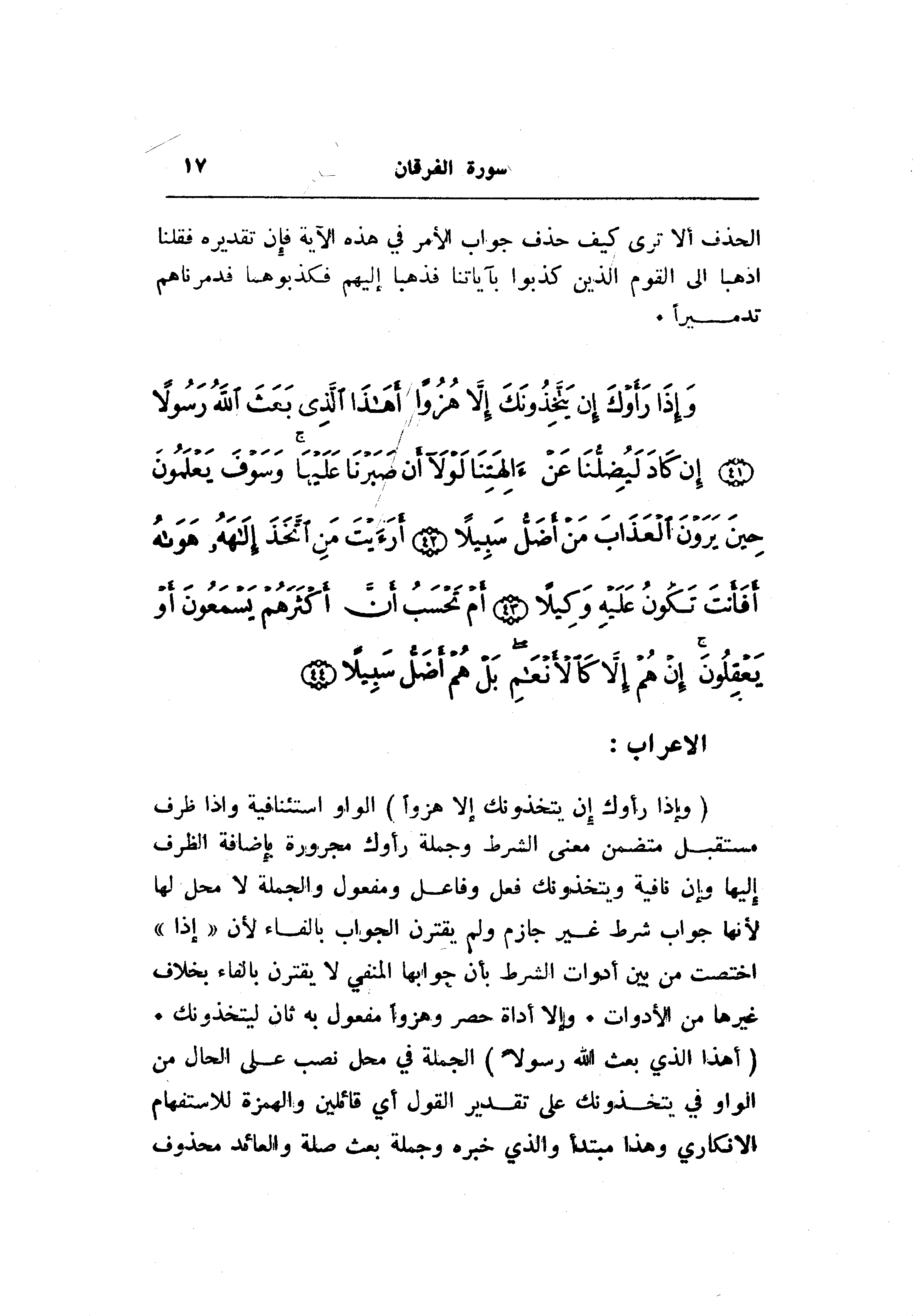 (وَإِذا رَأَوْكَ إِنْ يَتَّخِذُونَكَ إِلَّا هُزُواً) الواو استئنافية وإذا ظرف مستقبل متضمن معنى الشرط وجملة رأوك مجرورة بإضافة الظرف إليها وإن نافية ويتخذونك فعل وفاعل ومفعول والجملة لا محل لها لأنها جواب شرط غير جازم ولم يقترن الجواب بالفاء لأن «إذا» اختصت من بين أدوات الشرط بأن جوابها المنفي لا يقترن بالفاء بخلاف غيرها من الأدوات. وإلا أداة حصر وهزوا مفعول به ثان ليتخذونك.
