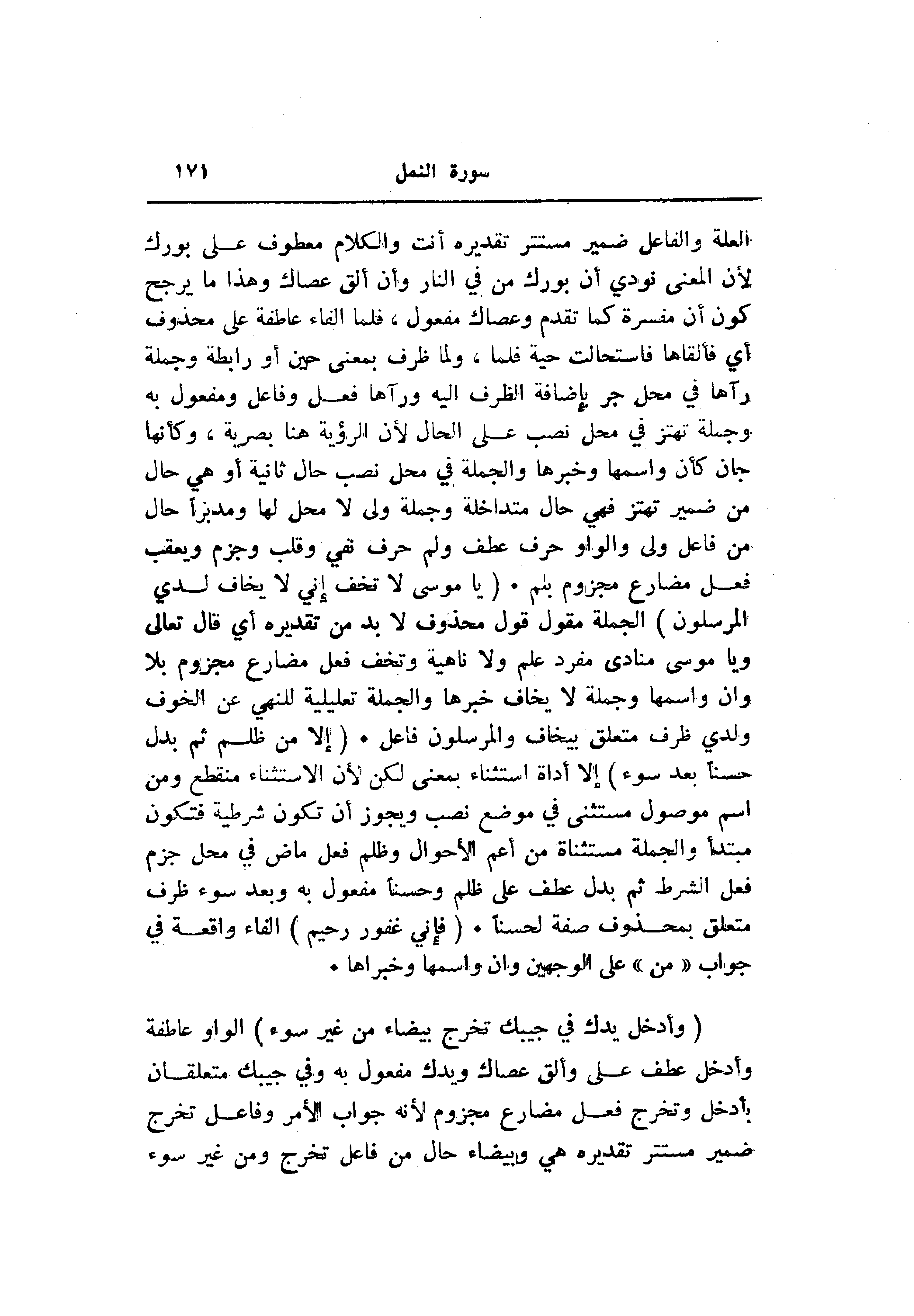 العلة والفاعل ضمير مستتر تقديره أنت والكلام معطوف على بورك لأن المعنى نودي أن بورك من في النار وأن ألق عصاك وهذا ما يرجح كون أن مفسرة كما تقدم وعصاك مفعول، فلما الفاء عاطفة على محذوف أي فألقاها فاستحالت حية فلما، ولما ظرف بمعنى حين أو رابطة وجملة رآها في محل جر بإضافة الظرف اليه ورآها فعل وفاعل ومفعول به وجملة تهتز في محل نصب على الحال لأن الرؤية هنا بصرية، وكأنها جان كأن واسمها وخبرها والجملة في محل نصب حال ثانية أو هي حال من ضمير تهتز فهي حال متداخلة وجملة ولى لا محل لها ومدبرا حال من فاعل ولى والواو حرف عطف ولم حرف نفي وقلب وجزم ويعقب فعل مضارع مجزوم بلم. (يا مُوسى لا تَخَفْ إِنِّي لا يَخافُ لَدَيَّ الْمُرْسَلُونَ) الجملة مقول قول محذوف لا بد من تقديره أي قال تعالى ويا موسى منادى مفرد علم ولا ناهية وتخف فعل مضارع مجزوم بلا وان واسمها وجملة لا يخاف خبرها والجملة تعليلية للنهي عن الخوف ولدي ظرف متعلق بيخاف والمرسلون فاعل. (إِلَّا مَنْ ظَلَمَ ثُمَّ بَدَّلَ حُسْناً بَعْدَ سُوءٍ) إلا أداة استثناء بمعنى لكن لأن الاستثناء منقطع ومن اسم موصول مستثنى في موضع نصب ويجوز أن تكون شرطية فتكون مبتدأ والجملة مستثناة من أعم الأحوال وظلم فعل ماض في محل جزم فعل الشرط ثم بدل عطف على ظلم وحسنا مفعول به وبعد سوء ظرف متعلق بمحذوف صفة لحسنا. (فَإِنِّي غَفُورٌ رَحِيمٌ) الفاء واقعة في جواب «من» على الوجهين وان واسمها وخبراها.