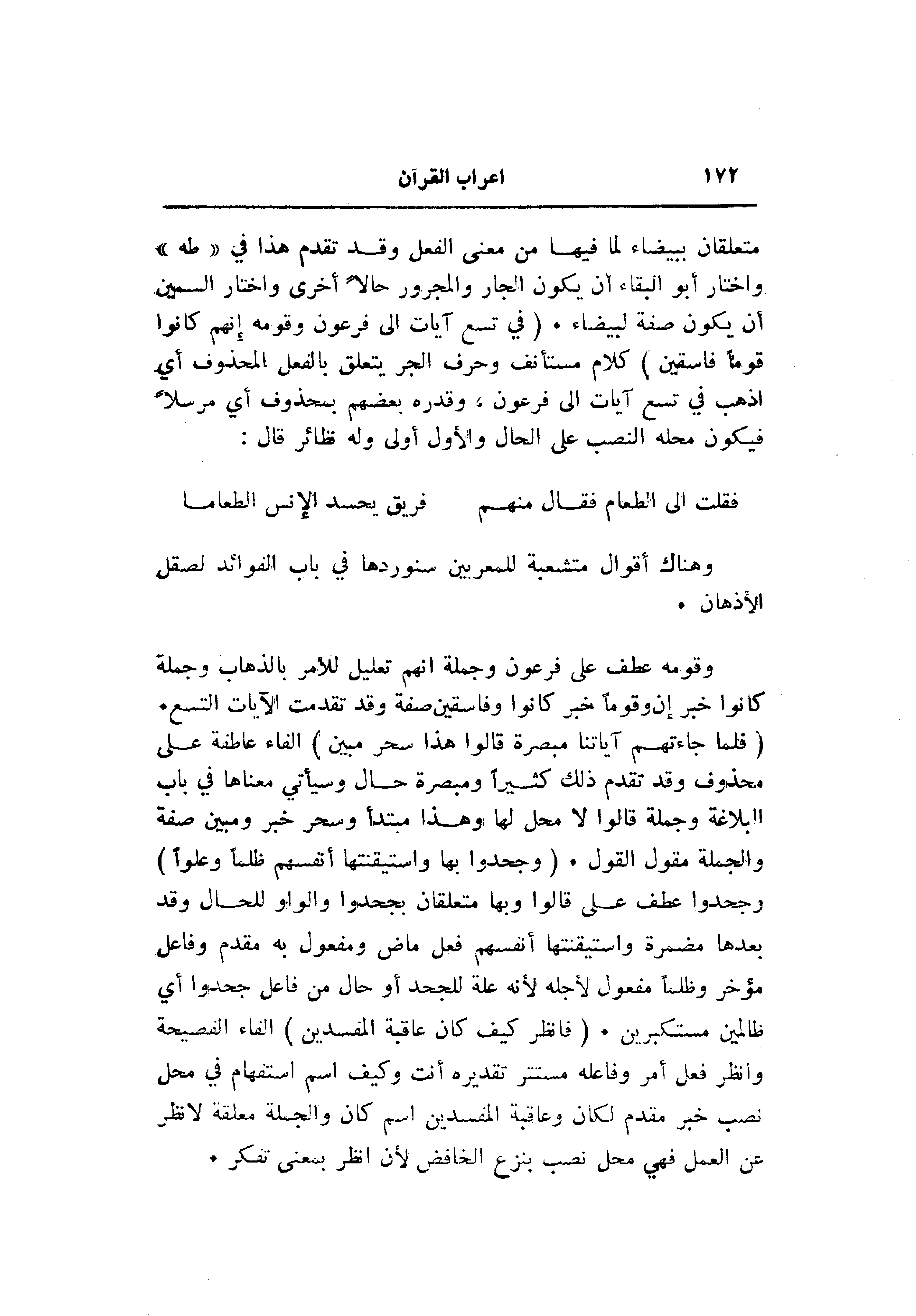 (فَلَمَّا جاءَتْهُمْ آياتُنا مُبْصِرَةً قالُوا هذا سِحْرٌ مُبِينٌ) الفاء عاطفة على محذوف وقد تقدم ذلك كثيرا ومبصرة حال وسيأتي معناها في باب البلاغة وجملة قالوا لا محل لها وهذا مبتدأ وسحر خبر ومبين صفة والجملة مقول القول. (وَجَحَدُوا بِها وَاسْتَيْقَنَتْها أَنْفُسُهُمْ ظُلْماً وَعُلُوًّا) وجحدوا عطف على قالوا وبها متعلقان بجحدوا والواو للحال وقد بعدها مضمرة واستيقنتها أنفسهم فعل ماض ومفعول به مقدم وفاعل مؤخر وظلما مفعول لأجله لأنه علة للجحد أو حال من فاعل جحدوا أي ظالمين مستكبرين. (فَانْظُرْ كَيْفَ كانَ عاقِبَةُ الْمُفْسِدِينَ) الفاء الفصيحة وأنظر فعل أمر وفاعله مستتر تقديره أنت وكيف اسم استفهام في محل نصب خبر مقدم لكان وعاقبة المفسدين اسم كان والجملة معلقة لا نظر عن العمل فهي محل نصب بنزع الخافض لأن انظر بمعنى تفكر.