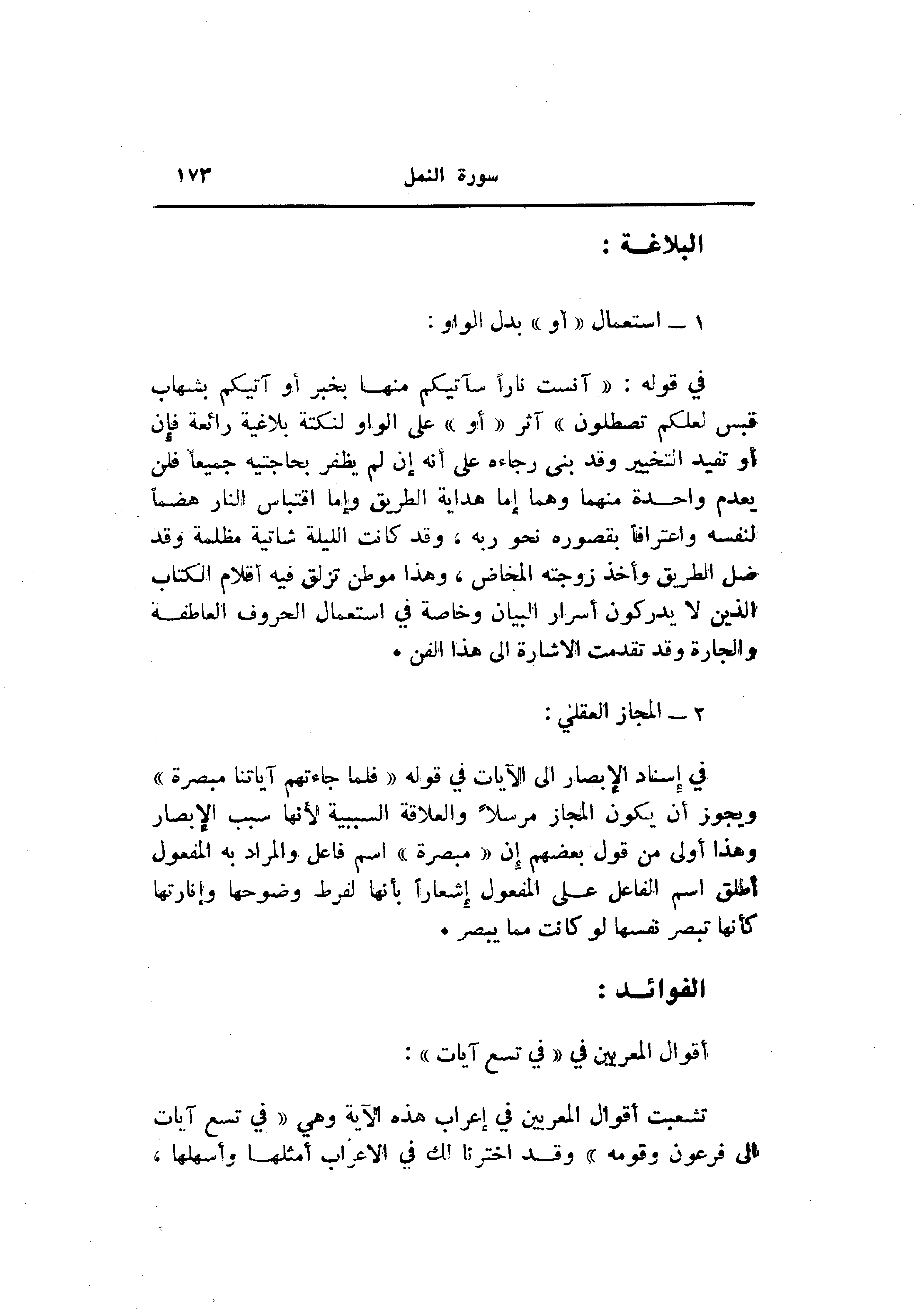 في قوله: «آنست نارا سآتيكم منها بخبر أو آتيكم بشهاب قبس لعلكم تصطلون» آثر «أو» على الواو لنكتة بلاغية رائعة فإن أو تفيد التخيير وقد بنى رجاءه على أنه إن لم يظفر بحاجتيه جميعا فلن يعدم واحدة منهما وهما إما هداية الطريق وإما اقتباس النار هضما لنفسه واعترافا بقصوره نحو ربه، وقد كانت الليلة شاتية مظلمة وقد ضل الطريق وأخذ زوجته المخاض، وهذا موطن تزلق فيه أقلام الكتاب الذين لا يدركون أسرار البيان وخاصة في استعمال الحروف العاطفة والجارة وقد تقدمت الاشارة الى هذا الفن.
