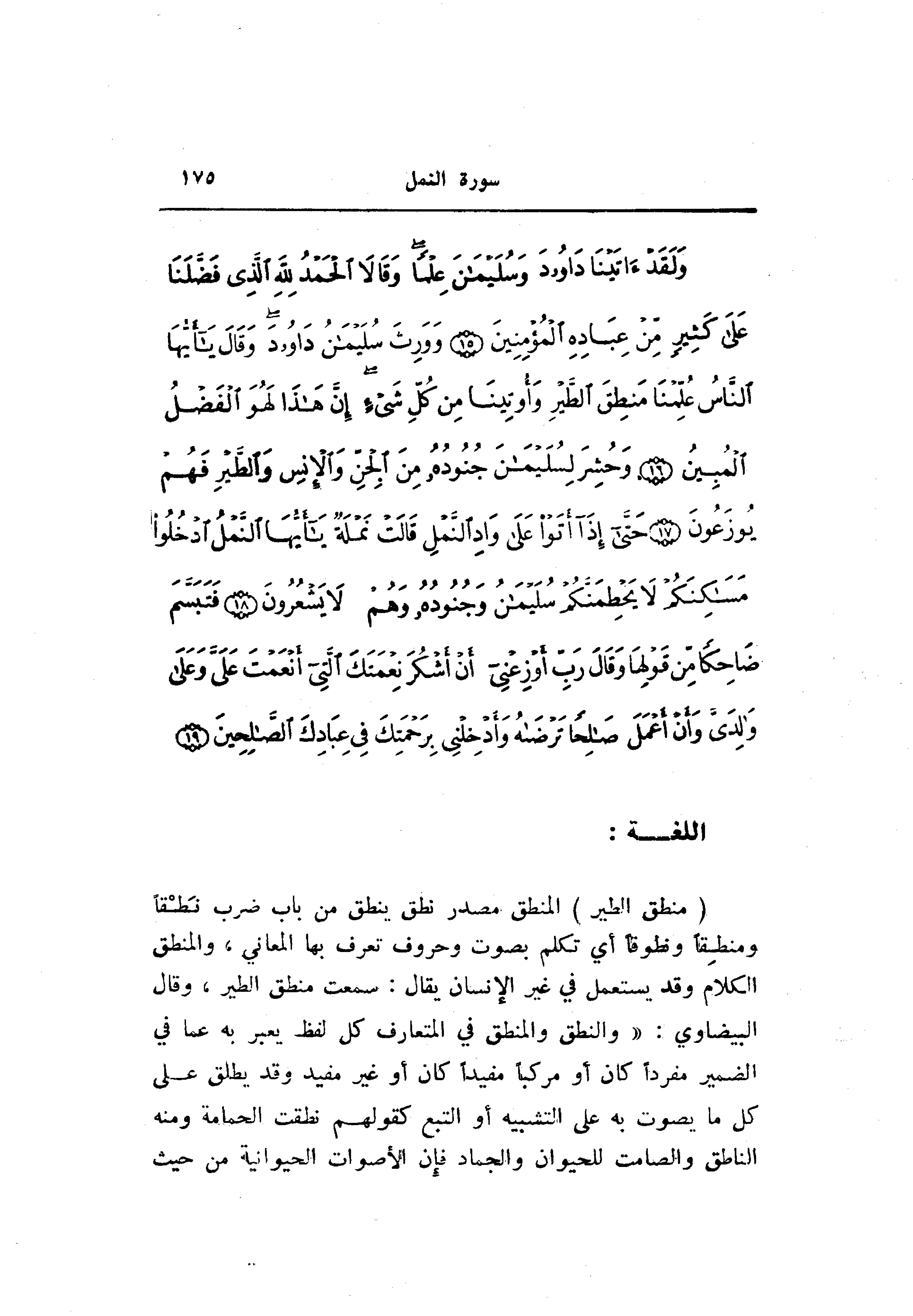 (مَنْطِقَ الطَّيْرِ) المنطق مصدر نطق ينطق من باب ضرب نطقا ومنطقا ونطوقا أي تكلم بصوت وحروف تعرف بها المعاني، والمنطق الكلام وقد يستعمل في غير الإنسان يقال: سمعت منطق الطير، وقال البيضاوي: «والنطق والمنطق في المتعارف كل لفظ يعبر به عما في الضمير مفردا كان أو مركبا مفيدا كان أو غير مفيد وقد يطلق على كل ما يصوت به على التشبيه أو التبع كقولهم نطقت الحمامة ومنه الناطق والصامت للحيوان والجماد فإن الأصوات الحيوانية من حيث