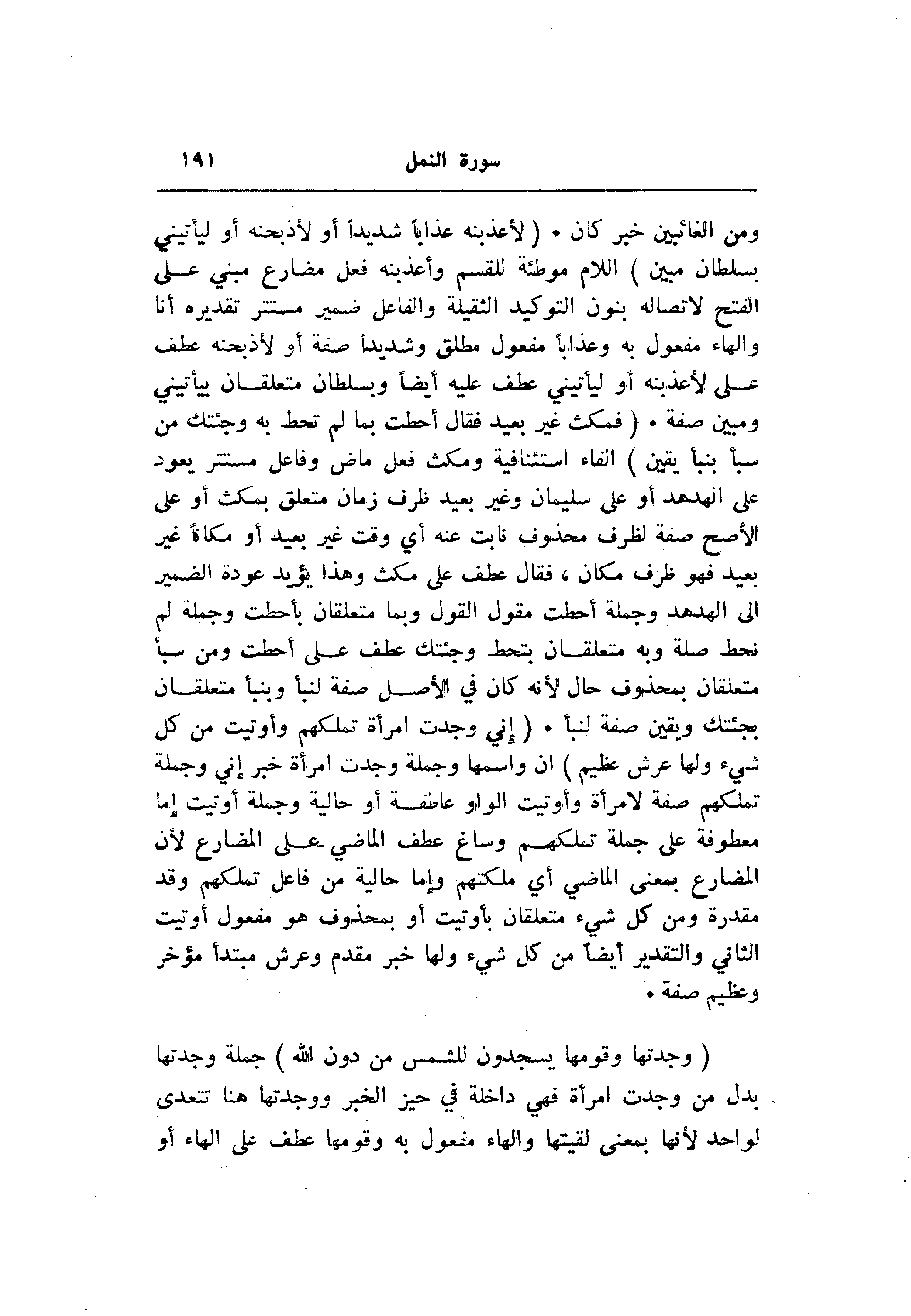 ومن الغائبين خبر كان. (لَأُعَذِّبَنَّهُ عَذاباً شَدِيداً أَوْ لَأَذْبَحَنَّهُ أَوْ لَيَأْتِيَنِّي بِسُلْطانٍ مُبِينٍ) اللام موطئة للقسم وأعذبنه فعل مضارع مبني على الفتح لاتصاله بنون التوكيد الثقيلة والفاعل ضمير مستتر تقديره أنا والهاء مفعول به وعذابا مفعول مطلق وشديدا صفة أو لأذبحنه عطف على لأعذبنه أو ليأتيني عطف عليه أيضا وبسلطان متعلقان بيأتيني ومبين صفة. (فَمَكَثَ غَيْرَ بَعِيدٍ فَقالَ أَحَطْتُ بِما لَمْ تُحِطْ بِهِ وَجِئْتُكَ مِنْ سَبَإٍ بِنَبَإٍ يَقِينٍ) الفاء استئنافية ومكث فعل ماض وفاعل مستتر يعود على الهدهد أو على سليمان وغير بعيد ظرف زمان متعلق بمكث أو على الأصح صفة لظرف محذوف نابت عنه أي وقت غير بعيد أو مكانا غير بعيد فهو ظرف مكان، فقال عطف على مكث وهذا يؤيد عودة الضمير الى الهدهد وجملة أحطت مقول القول وبما متعلقان بأحطت وجملة لم نحط صلة وبه متعلقان بتحط وجئتك عطف على أحطت ومن سبأ متعلقان بمحذوف حال لأنه كان في الأصل صفة لنبأ وبنبإ متعلقان بجئتك ويقين صفة لنبأ. (إِنِّي وَجَدْتُ امْرَأَةً تَمْلِكُهُمْ وَأُوتِيَتْ مِنْ كُلِّ شَيْءٍ وَلَها عَرْشٌ عَظِيمٌ) ان واسمها وجملة وجدت امرأة خبر إني وجملة تملكهم صفة لامرأة وأوتيت الواو عاطفة أو حالية وجملة أوتيت إما معطوفة على جملة تملكهم وساغ عطف الماضي على المضارع لأن المضارع بمعنى الماضي أي ملكتهم وإما حالية من فاعل تملكهم وقد مقدرة ومن كل شيء متعلقان بأوتيت أو بمحذوف هو مفعول أوتيت الثاني والتقدير أيضا من كل شيء ولها خبر مقدم وعرش مبتدأ مؤخر وعظيم صفة.