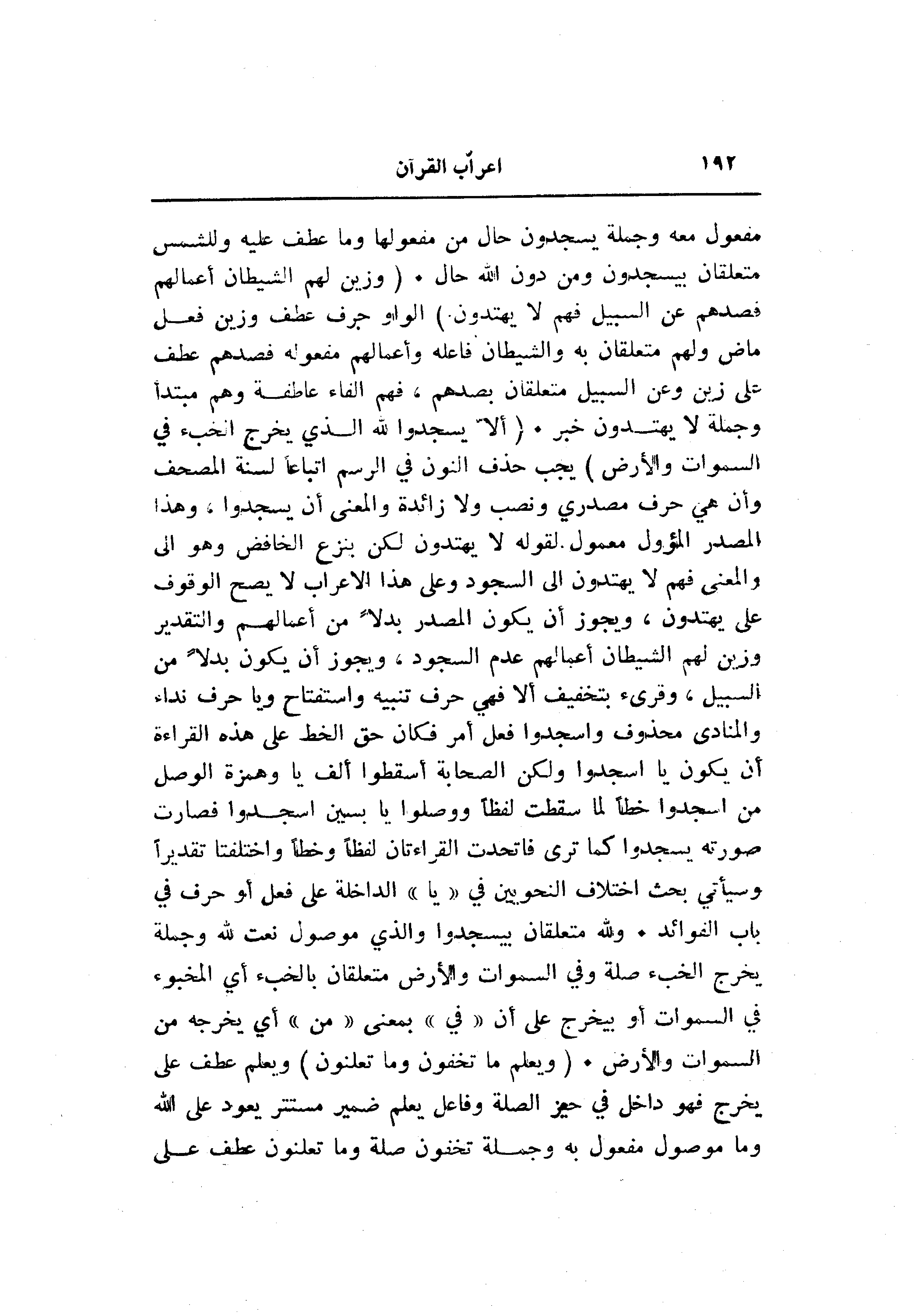 مفعول معه وجملة يسجدون حال من مفعولها وما عطف عليه وللشمس متعلقان بيسجدون ومن دون الله حال. (وَزَيَّنَ لَهُمُ الشَّيْطانُ أَعْمالَهُمْ فَصَدَّهُمْ عَنِ السَّبِيلِ فَهُمْ لا يَهْتَدُونَ) الواو حرف عطف وزين فعل ماض ولهم متعلقان به والشيطان فاعله وأعمالهم مفعوله فصدهم عطف على زين وعن السبيل متعلقان بصدهم، فهم الفاء عاطفة وهم مبتدأ وجملة لا يهتدون خبر. (أَلَّا يَسْجُدُوا لِلَّهِ الَّذِي يُخْرِجُ الْخَبْءَ فِي السَّماواتِ وَالْأَرْضِ) يجب حذف النون في الرسم اتباعا لسنة المصحف وأن هي حرف مصدري ونصب ولا زائدة والمعنى أن يسجدوا، وهذا المصدر المؤول معمول لقوله لا يهتدون لكن بنزع الخافض وهو الى والمعنى فهم لا يهتدون الى السجود وعلى هذا الإعراب لا يصح الوقوف على يهتدون، ويجوز أن يكون المصدر بدلا من أعمالهم والتقدير وزين لهم الشيطان أعمالهم عدم السجود، ويجوز أن يكون بدلا من السبيل، وقرئ بتخفيف ألا فهي حرف تنبيه واستفتاح ويا حرف نداء والمنادى محذوف واسجدوا فعل أمر فكان حق الخط على هذه القراءة أن يكون يا اسجدوا ولكن الصحابة أسقطوا ألف يا وهمزة الوصل من اسجدوا خطا لما سقطت لفظا ووصلوا يا بسين اسجدوا فصارت صورته يسجدوا كما ترى فاتحدت القراءتان لفظا وخطا واختلفتا تقديرا وسيأتي بحث اختلاف النحويين في «يا» الداخلة على فعل أو حرف في باب الفوائد. ولله متعلقان بيسجدوا والذي موصول نعت لله وجملة يخرج الخبء صلة وفي السموات والأرض متعلقان بالخبء أي المخبوء في السموات أو بيخرج على أن «في» بمعنى «من» أي يخرجه من السموات والأرض. (وَيَعْلَمُ ما تُخْفُونَ وَما تُعْلِنُونَ) ويعلم عطف على يخرج فهو داخل في حيز الصلة وفاعل يعلم ضمير مستتر يعود على الله وما موصول مفعول به وجملة تخفون صلة وما تعلنون عطف على
