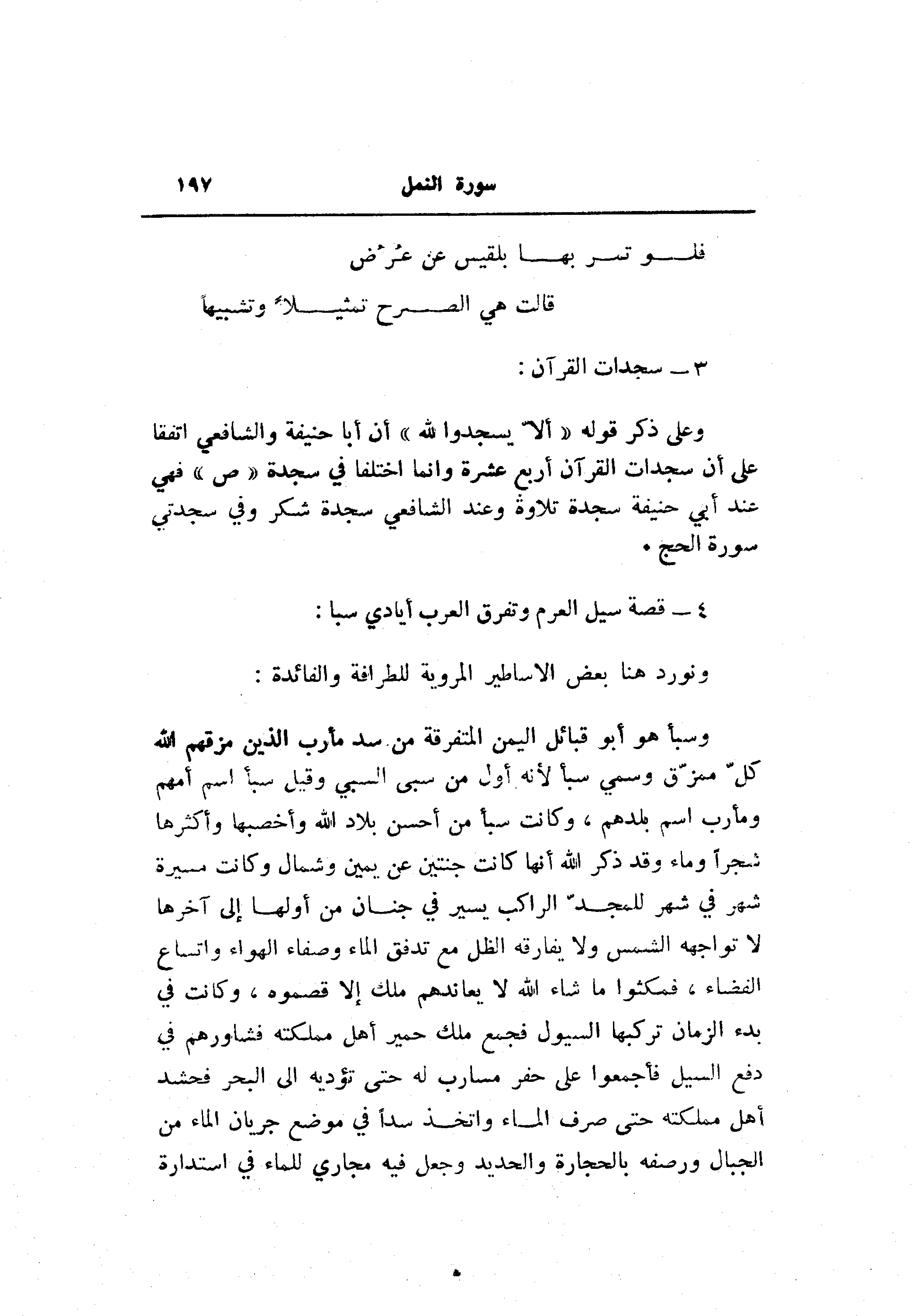 وسبأ هو أبو قبائل اليمن المتفرقة من سد مأرب الذين مزقهم الله كلّ ممزّق وسمي سبأ لأنه أول من سبى السبي وقيل سبأ اسم أمهم ومأرب اسم بلدهم، وكانت سبأ من أحسن بلاد الله وأخصبها وأكثرها شجرا وماء وقد ذكر الله أنها كانت جنتين عن يمين وشمال وكانت مسيرة شهر في شهر للمجدّ الراكب يسير في جنان من أولها إلى آخرها لا تواجهه الشمس ولا يفارقه الظل مع تدفق الماء وصفاء الهواء واتساع الفضاء، فمكثوا ما شاء الله لا يعاندهم ملك إلا قصموه، وكانت في بدء الزمان تركبها السيول فجمع ملك حمير أهل مملكته فشاورهم في دفع السيل فأجمعوا على حفر مسارب له حتى تؤديه الى البحر فحشد أهل مملكته حتى صرف الماء واتخذ سدا في موضع جريان الماء من الجبال ورصفه بالحجارة والحديد وجعل فيه مجاري للماء في استدارة