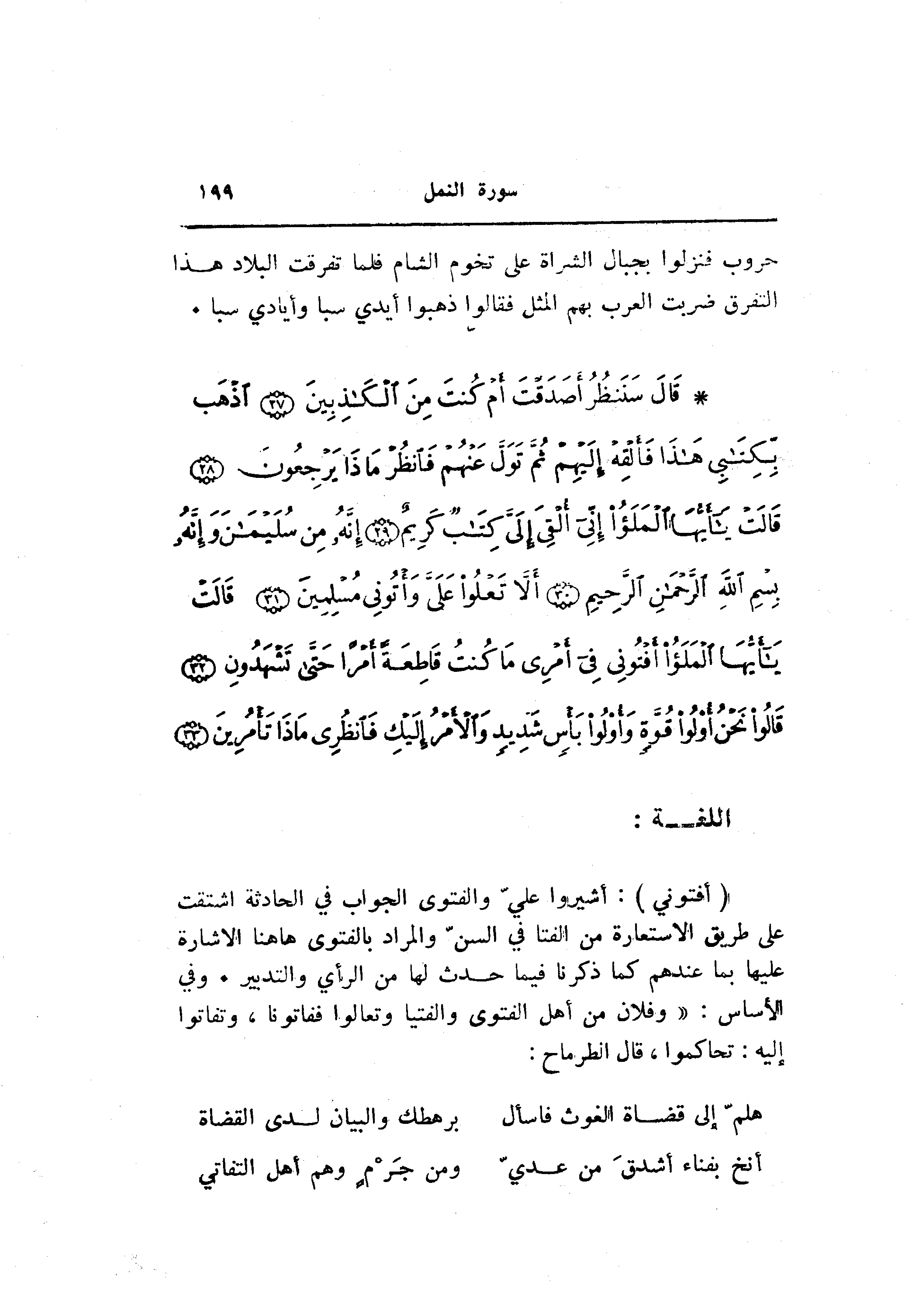 (أَفْتُونِي) : أشيروا عليّ والفتوى الجواب في الحادثة اشتقت على طريق الاستعارة من الفتا في السنّ والمراد بالفتوى هاهنا الاشارة عليها بما عندهم كما ذكرنا فيما حدث لها من الرأي والتدبير. وفي الأساس: «وفلان من أهل الفتوى والفتيا وتعالوا ففاتونا، وتفاتوا إليه: تحاكموا، قال الطرماح: