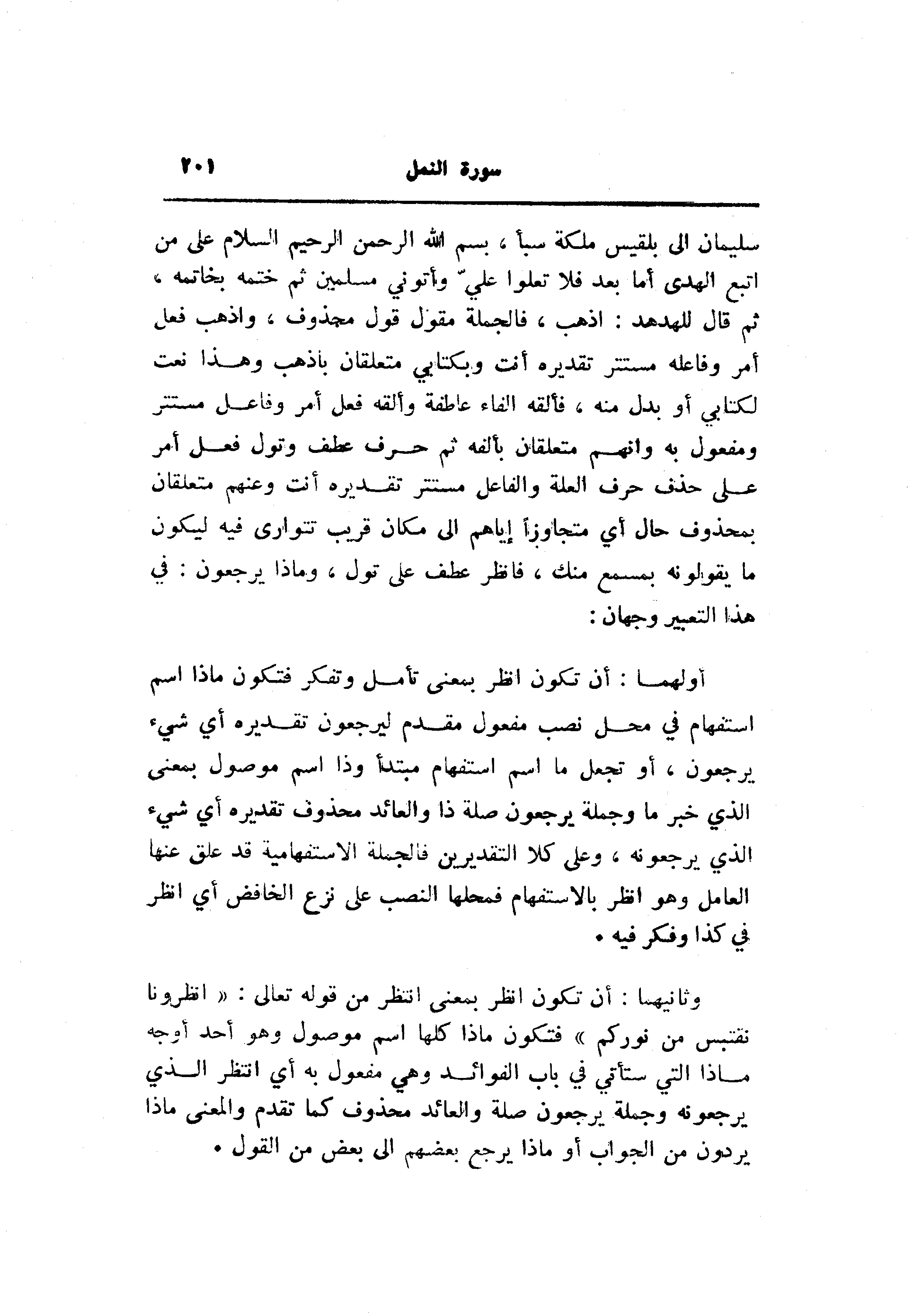 سليمان الى بلقيس ملكة سبأ، بسم الله الرحمن الرحيم السلام على من اتبع الهدى أما بعد فلا تعلوا عليّ وأتوني مسلمين ثم ختمه بخاتمه، ثم قال للهدهد: اذهب، فالجملة مقول قول محذوف، واذهب فعل أمر وفاعله مستتر تقديره أنت وبكتابي متعلقان باذهب وهذا نعت لكتابي أو بدل منه، فألقه الفاء عاطفة وألقه فعل أمر وفاعل مستتر ومفعول به وأنهم متعلقان بألفه ثم حرف عطف وتول فعل أمر على حذف حرف العلة والفاعل مستتر تقديره أنت وعنهم متعلقان بمحذوف حال أي متجاوزا إياهم الى مكان قريب تتوارى فيه ليكون ما يقولونه بمسمع منك، فانظر عطف على تول، وماذا يرجعون: في هذا التعبير وجهان: