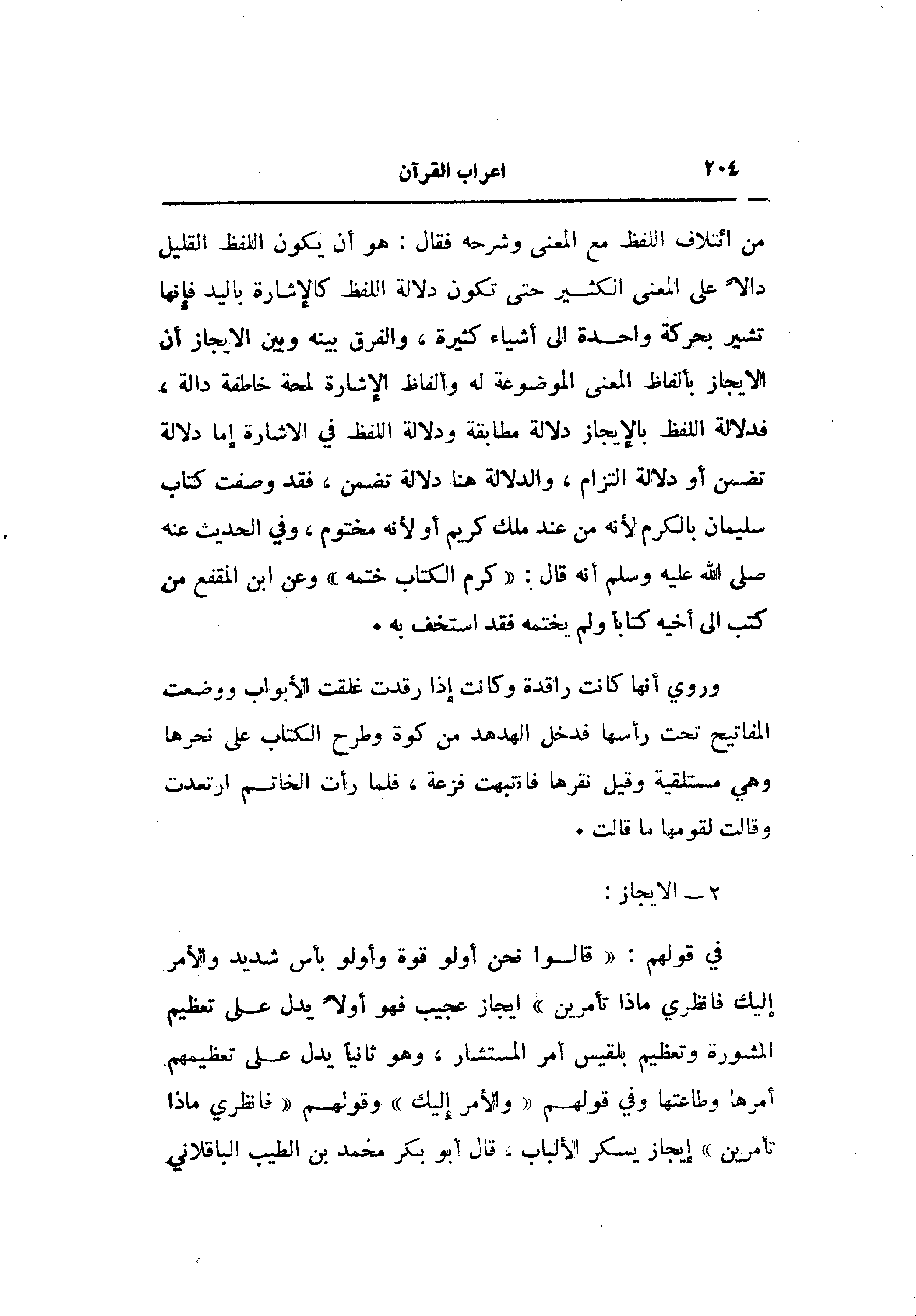من ائتلاف اللفظ مع المعنى وشرحه فقال: هو أن يكون اللفظ القليل دالا على المعنى الكثير حتى تكون دلالة اللفظ كالإشارة باليد فإنها تشير بحركة واحدة الى أشياء كثيرة، والفرق بينه وبين الإيجاز أن الإيجاز بألفاظ المعنى الموضوعة له وألفاظ الإشارة لمحة خاطفة دالة، فدلالة اللفظ بالإيجاز دلالة مطابقة ودلالة اللفظ في الاشارة إما دلالة تضمن أو دلالة التزام، والدلالة هنا دلالة تضمن، فقد وصفت كتاب سليمان بالكرم لأنه من عند ملك كريم أو لأنه مختوم، وفي الحديث عنه صلى الله عليه وسلم أنه قال: «كرم الكتاب ختمه» وعن ابن المقفع من كتب الى أخيه كتابا ولم يختمه فقد استخف به.