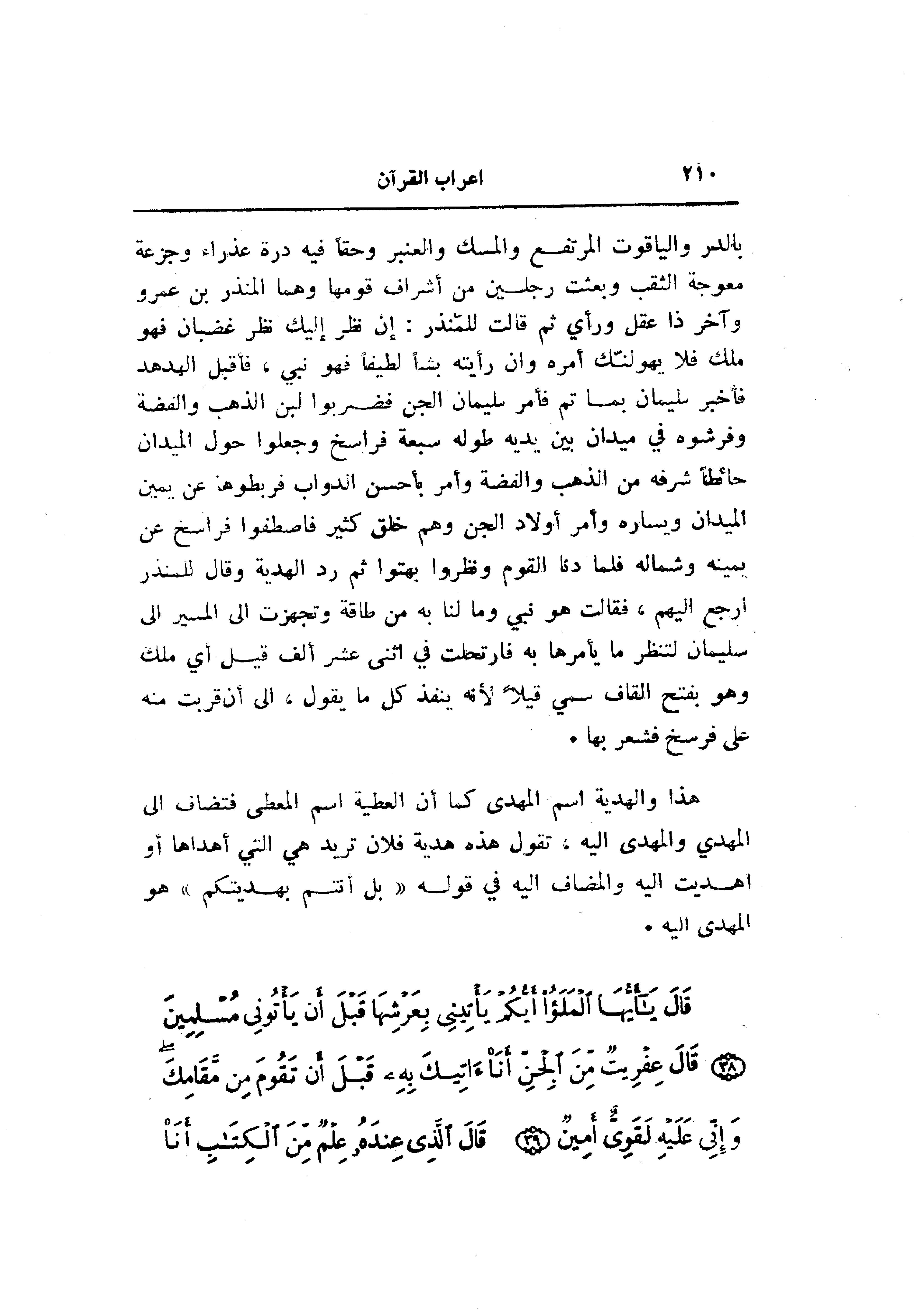 بالدر والياقوت المرتفع والمسك والعنبر وحقا فيه درة عذراء وجزعة معوجة الثقب وبعثت رجلين من أشراف قومها وهما المنذر بن عمرو وآخر ذا عقل ورأي ثم قالت للمنذر: إن نظر إليك نظر غضبان فهو ملك فلا يهولنّك أمره وان رأيته بشا لطيفا فهو نبي، فأقبل الهدهد فأخبر سليمان بما تم فأمر سليمان الجن فضربوا لبن الذهب والفضة وفرشوه في ميدان بين يديه طوله سبعة فراسخ وجعلوا حول الميدان حائطا شرفه من الذهب والفضة وأمر بأحسن الدواب فربطوها عن يمين الميدان ويساره وأمر أولاد الجن وهم خلق كثير فاصطفوا فراسخ عن يمينه وشماله فلما دنا القوم ونظروا بهتوا ثم رد الهدية وقال للمنذر ارجع إليهم، فقالت هو نبي وما لنا به من طاقة وتجهزت الى المسير الى سليمان لتنظر ما يأمرها به فارتحلت في اثنى عشر ألف قيل أي ملك وهو بفتح القاف سمي قيلا لأنه ينفد كل ما يقول، الى أن قربت منه على فرسخ فشعر بها.