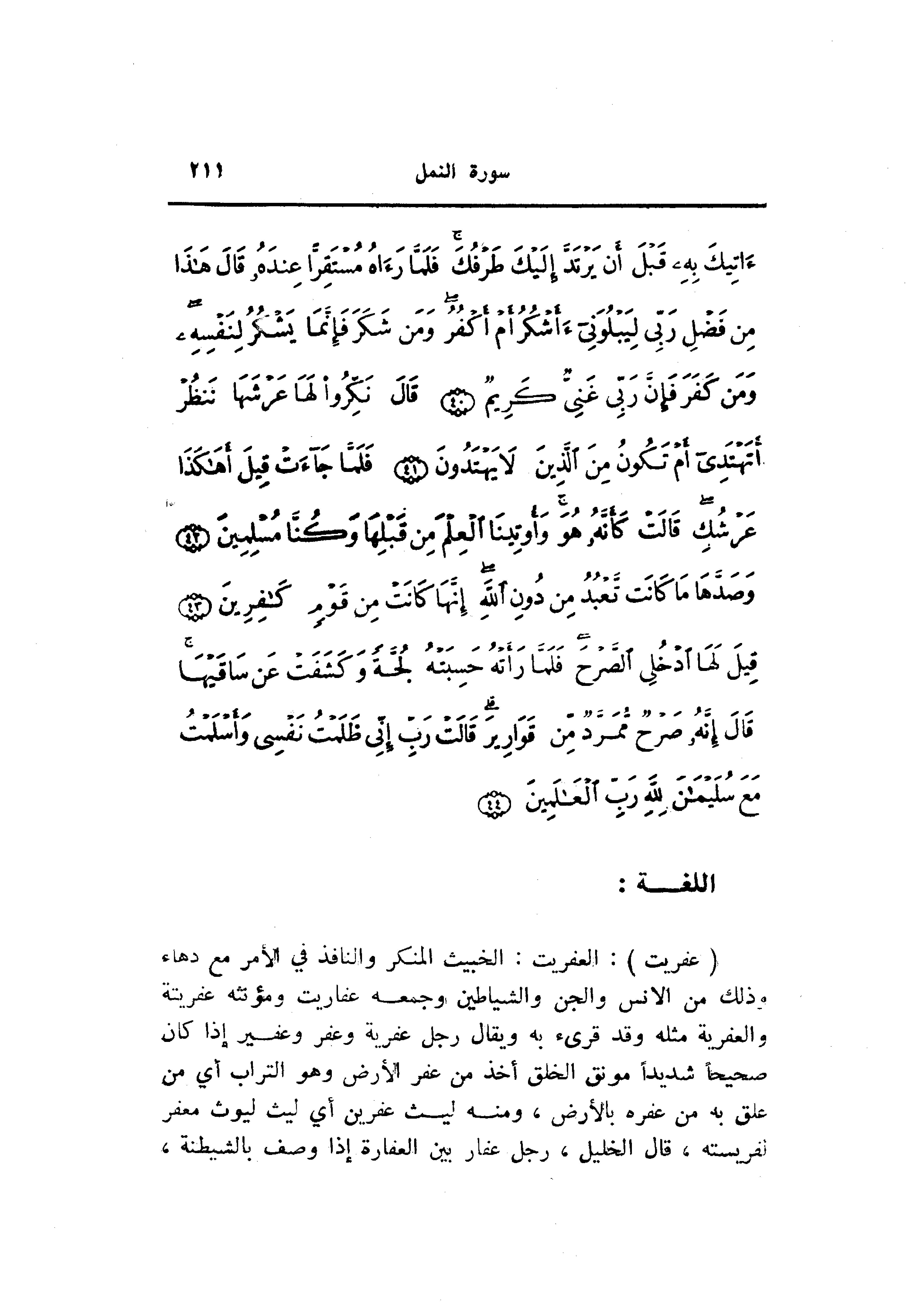 (عِفْرِيتٌ) : العفريت: الخبيث المنكر والنافذ في الأمر مع دهاء وذلك من الانس والجن والشياطين وجمعه عفاريت ومؤنثه عفريتة والعفرية مثله وقد قرئ به ويقال رجل عفرية وعفر وعفير إذا كان صحيحا شديدا مونق الخلق أخذ من عفر الأرض وهو التراب أي من علق به من عفره بالأرض، ومنه ليث عفرين أي ليث ليوث معفر لفريسته، قال الخليل، رجل عفار بين العفارة إذا وصف بالشيطنة،