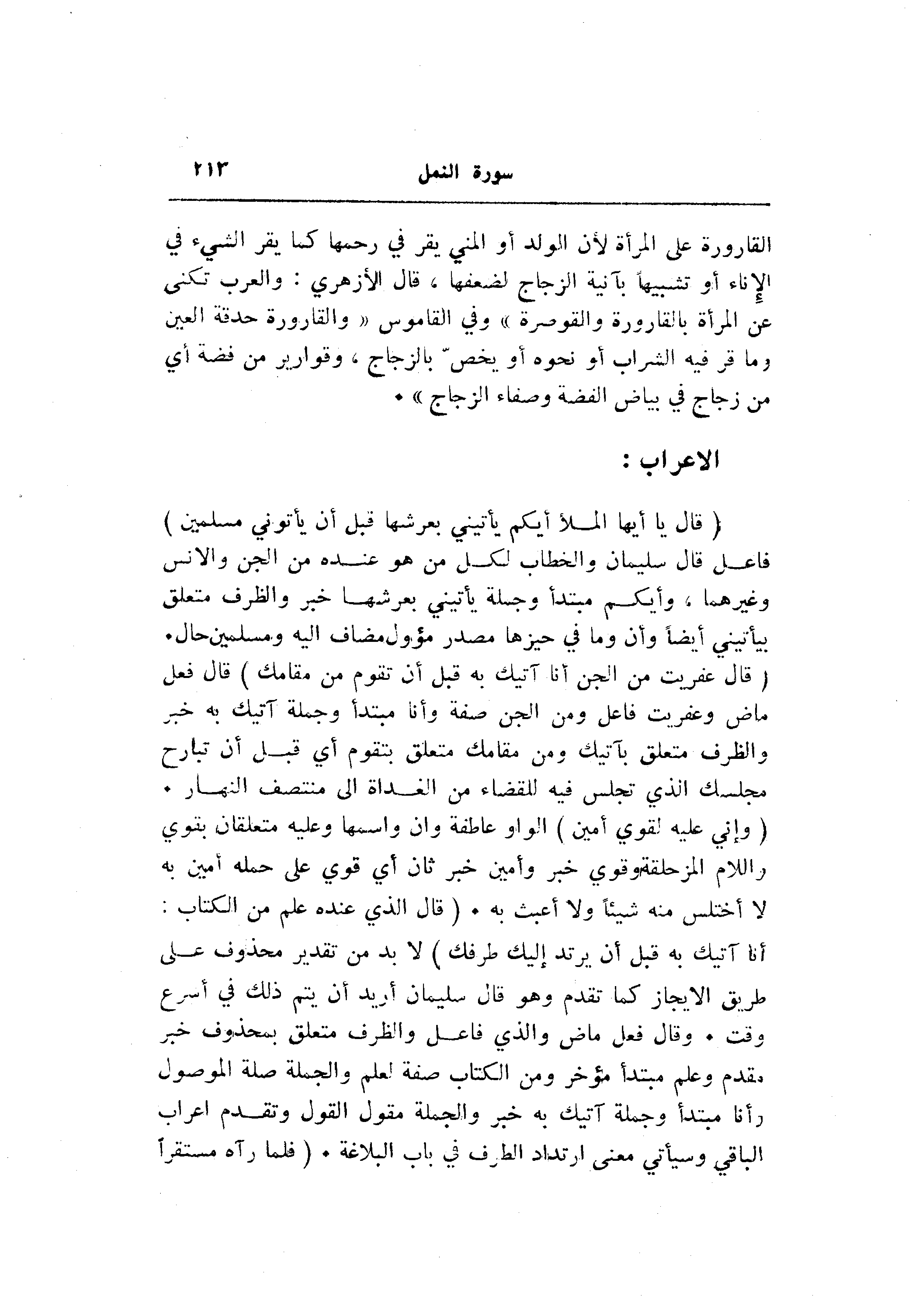 (وَإِنِّي عَلَيْهِ لَقَوِيٌّ أَمِينٌ) الواو عاطفة وان واسمها وعليه متعلقان بقوي واللام المزحلقة وقوي خبر وأمين خبر ثان أي قوي على حمله أمين به لا أختلس منه شيئا ولا أعبث به. (قالَ الَّذِي عِنْدَهُ عِلْمٌ مِنَ الْكِتابِ: أَنَا آتِيكَ بِهِ قَبْلَ أَنْ يَرْتَدَّ إِلَيْكَ طَرْفُكَ) لا بد من تقدير محذوف على طريق الإيجاز كما تقدم وهو قال سليمان أريد أن يتم ذلك في أسرع وقت. وقال فعل ماض والذي فاعل والظرف متعلق بمحذوف خبر مقدم وعلم مبتدأ مؤخر ومن الكتاب صفة لعلم والجملة صلة الموصول وأنا مبتدأ وجملة آتيك به خبر والجملة مقول القول وتقدم اعراب الباقي وسيأتي معنى ارتداد الطرف في باب البلاغة. (فَلَمَّا رَآهُ مُسْتَقِرًّا