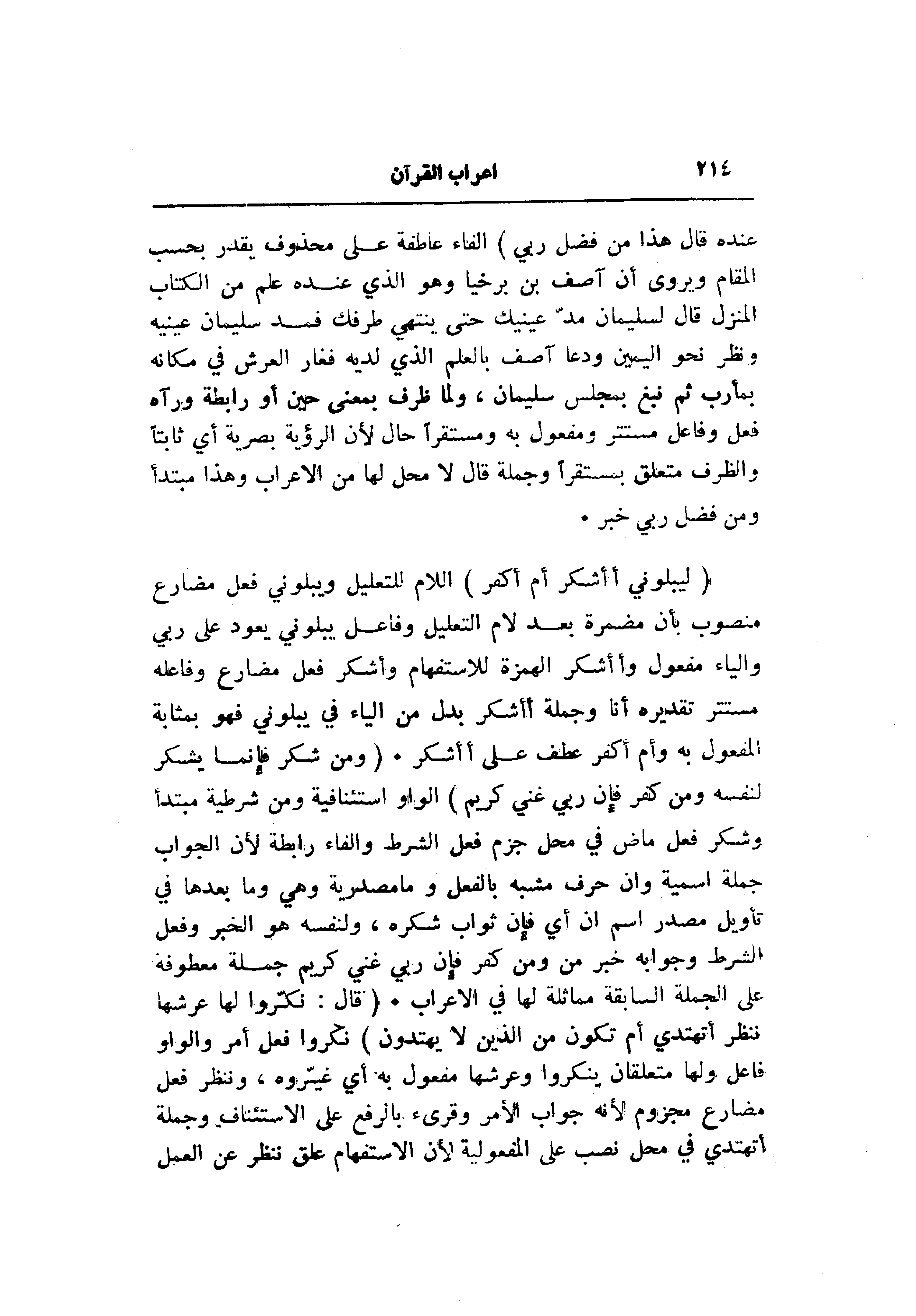 (لِيَبْلُوَنِي أَأَشْكُرُ أَمْ أَكْفُرُ) اللام للتعليل ويبلوني فعل مضارع منصوب بأن مضمرة بعد لام التعليل وفاعل يبلوني يعود على ربي والياء مفعول وأ أشكر الهمزة للاستفهام وأشكر فعل مضارع وفاعله مستتر تقديره أنا وجملة أأشكر بدل من الياء في يبلوني فهو بمثابة المفعول به وأم أكفر عطف على أأشكر. (وَمَنْ شَكَرَ فَإِنَّما يَشْكُرُ لِنَفْسِهِ وَمَنْ كَفَرَ فَإِنَّ رَبِّي غَنِيٌّ كَرِيمٌ) الواو استئنافية ومن شرطية مبتدأ وشكر فعل ماض في محل جزم فعل الشرط والفاء رابطة لأن الجواب جملة اسمية وان حرف مشبه بالفعل وما مصدرية وهي وما بعدها في تأويل مصدر اسم ان أي فإن ثواب شكره، ولنفسه هو الخبر وفعل الشرط وجوابه خبر من ومن كفر فإن ربي غني كريم جملة معطوفة على الجملة السابقة مماثلة لها في الاعراب. (قالَ: نَكِّرُوا لَها عَرْشَها نَنْظُرْ أَتَهْتَدِي أَمْ تَكُونُ مِنَ الَّذِينَ لا يَهْتَدُونَ) نكروا فعل أمر والواو فاعل ولها متعلقان ينكروا وعرشها مفعول به أي غيّروه، وننظر فعل مضارع مجزوم لأنه جواب الأمر وقرئ بالرفع على الاستئناف وجملة أتهتدي في محل نصب على المفعولية لأن الاستفهام علق ننظر عن العمل