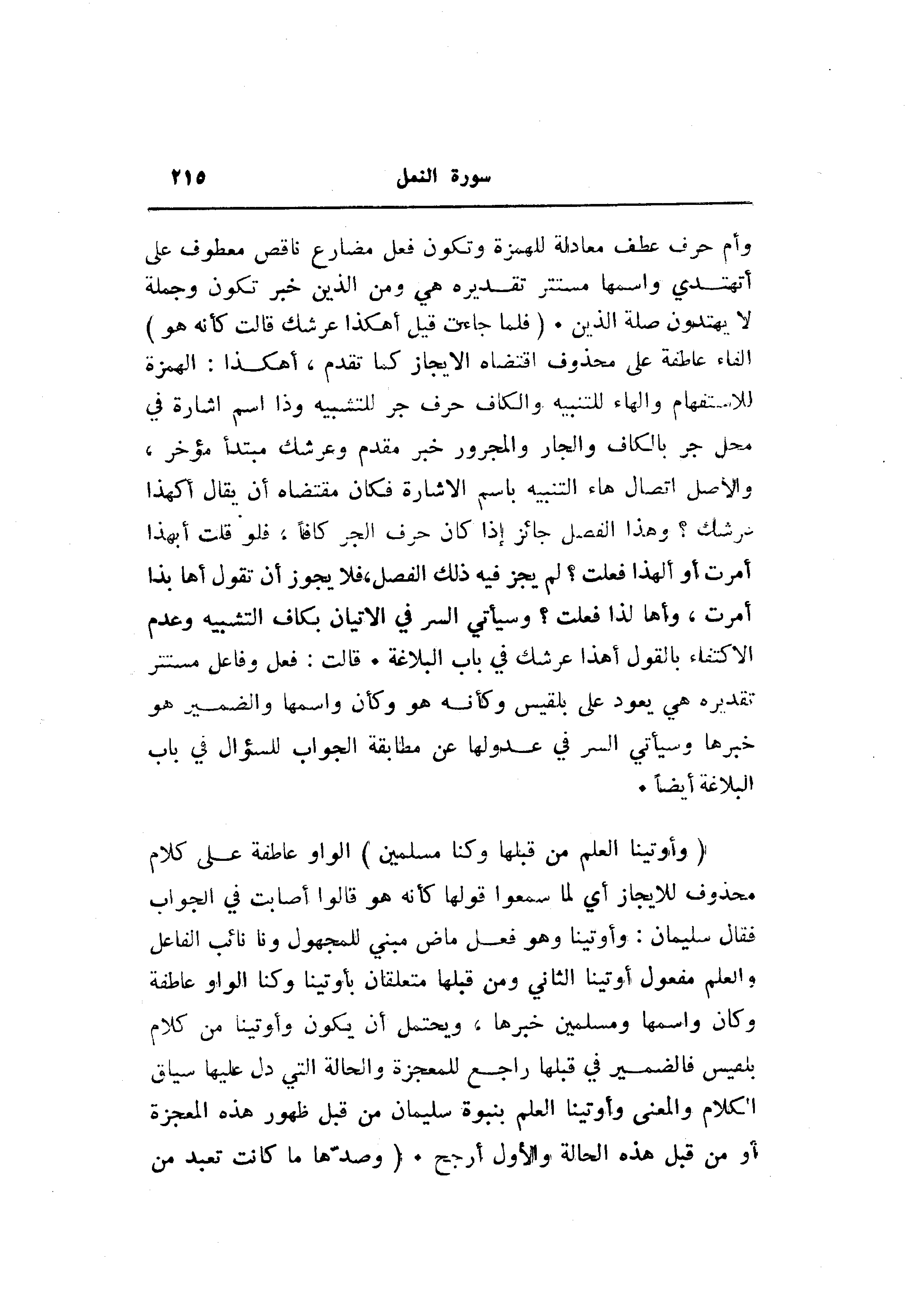 وأم حرف عطف معادلة للهمزة وتكون فعل مضارع ناقص معطوف على أتهتدي واسمها مستتر تقديره هي ومن الذين خبر تكون وجملة لا يهتدون صلة الذين. (فَلَمَّا جاءَتْ قِيلَ أَهكَذا عَرْشُكِ قالَتْ كَأَنَّهُ هُوَ) الفاء عاطفة على محذوف اقتضاه الإيجاز كما تقدم، أهكذا: الهمزة للاستفهام والهاء للتنبيه والكاف حرف جر للتشبيه وذا اسم اشارة في محل جر بالكاف والجار والمجرور خبر مقدم وعرشك مبتدأ مؤخر، والأصل اتصال هاء التنبيه باسم الاشارة فكان مقتضاه أن يقال أكهذا عرشك؟ وهذا الفصل جائز إذا كان حرف الجر كافا، فلو قلت أبهذا أمرت أو ألهذا فعلت؟ لم يجز فيه ذلك الفصل، فلا يجوز أن تقول أها بذا أمرت، وأ ها لذا فعلت؟ وسيأتي السر في الإتيان بكاف التشبيه وعدم الاكتفاء بالقول أهذا عرشك في باب البلاغة. قالت: فعل وفاعل مستتر تقديره هي يعود على بلقيس وكأنه هو وكأن واسمها والضمير هو خبرها وسيأتي السر في عدولها عن مطابقة الجواب للسؤال في باب البلاغة أيضا.