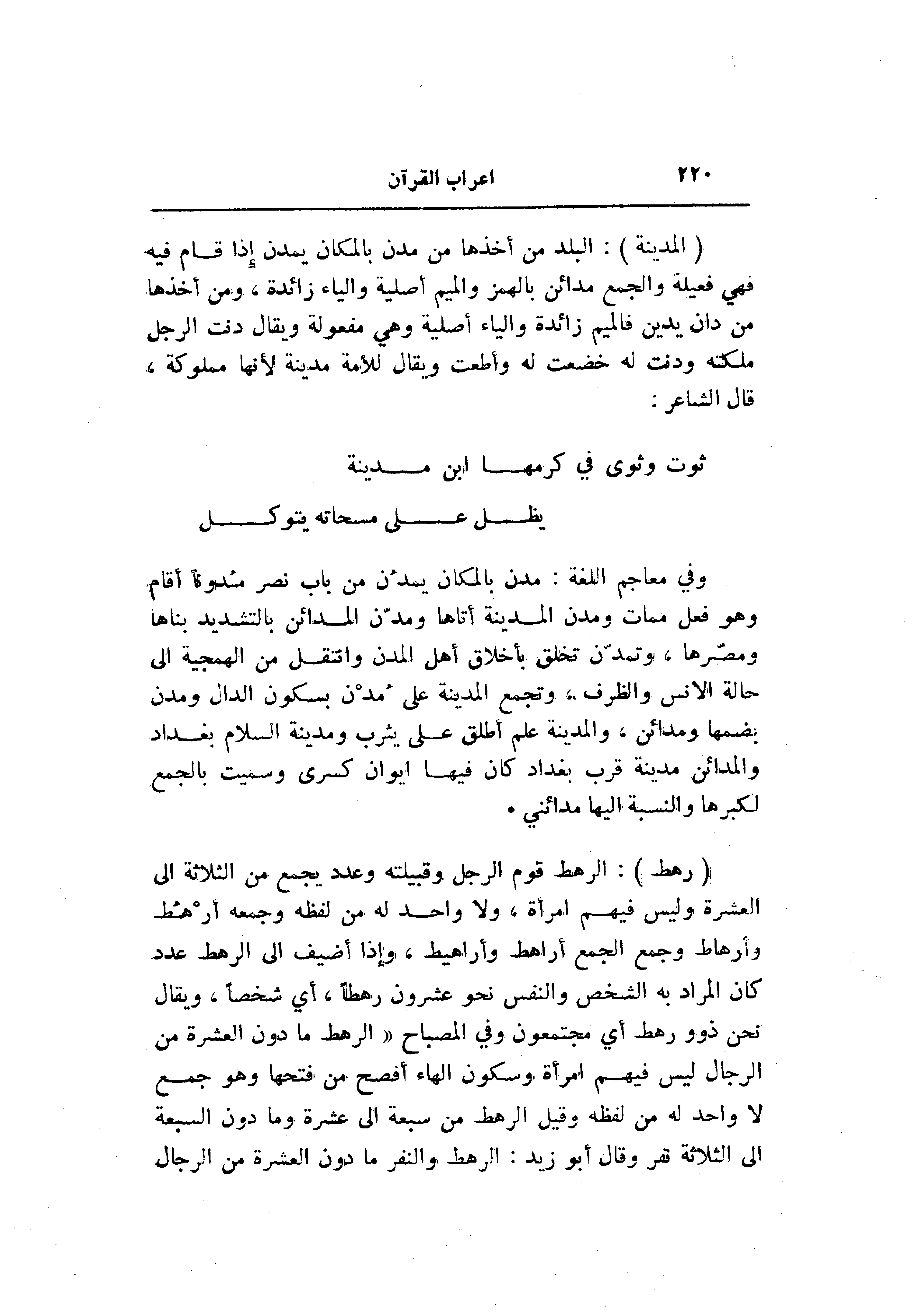 (الْمَدِينَةِ) : البلد من أخذها من مدن بالمكان يمدن إذا قام فيه فهي فعلية والجمع مدائن بالهمز والميم أصلية والياء زائدة، ومن أخذها من دان يدين فالميم زائدة والياء أصلية وهي مفعولة ويقال دنت الرجل ملكته ودنت له خضعت له وأطعت ويقال للأمة مدينة لأنها مملوكة، قال الشاعر: