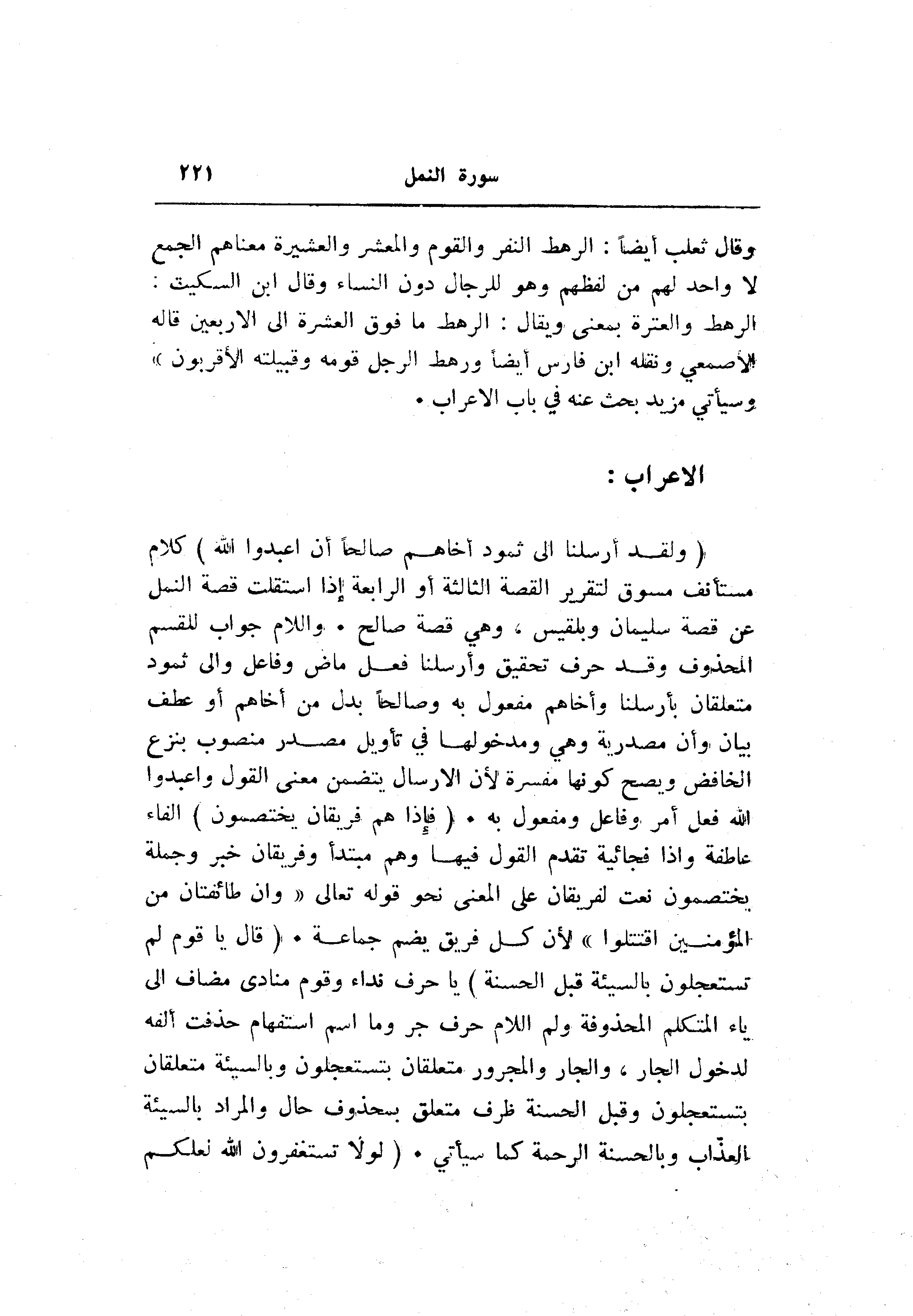 (وَلَقَدْ أَرْسَلْنا إِلى ثَمُودَ أَخاهُمْ صالِحاً أَنِ اعْبُدُوا اللَّهَ) كلام مستأنف مسوق لتقرير القصة الثالثة أو الرابعة إذا استقلت قصة النمل عن قصة سليمان وبلقيس، وهي قصة صالح. واللام جواب للقسم المحذوف وقد حرف تحقيق وأرسلنا فعل ماض وفاعل والى ثمود متعلقان بأرسلنا وأخاهم مفعول به وصالحا بدل من أخاهم أو عطف بيان وأن مصدرية وهي ومدخولها في تأويل مصدر منصوب بنزع الخافض ويصح كونها مفسرة لأن الإرسال يتضمن معنى القول واعبدوا الله فعل أمر وفاعل ومفعول به. (فَإِذا هُمْ فَرِيقانِ يَخْتَصِمُونَ) الفاء عاطفة وإذا فجائية تقدم القول فيها وهم مبتدأ وفريقان خبر وجملة يختصمون نعت لفريقان على المعنى نحو قوله تعالى «وان طائفتان من المؤمنين اقتتلوا» لأن كل فريق يضم جماعة. (قالَ يا قَوْمِ لِمَ تَسْتَعْجِلُونَ بِالسَّيِّئَةِ قَبْلَ الْحَسَنَةِ) يا حرف نداء وقوم منادى مضاف الى ياء المتكلم المحذوفة ولم اللام حرف جر وما اسم استفهام حذفت ألفه لدخول الجار، والجار والمجرور متعلقان بتستعجلون وبالسيئة متعلقان بتستعجلون وقبل الحسنة ظرف متعلق بمحذوف حال والمراد بالسيئة العذاب وبالحسنة الرحمة كما سيأتي. (لَوْلا تَسْتَغْفِرُونَ اللَّهَ لَعَلَّكُمْ