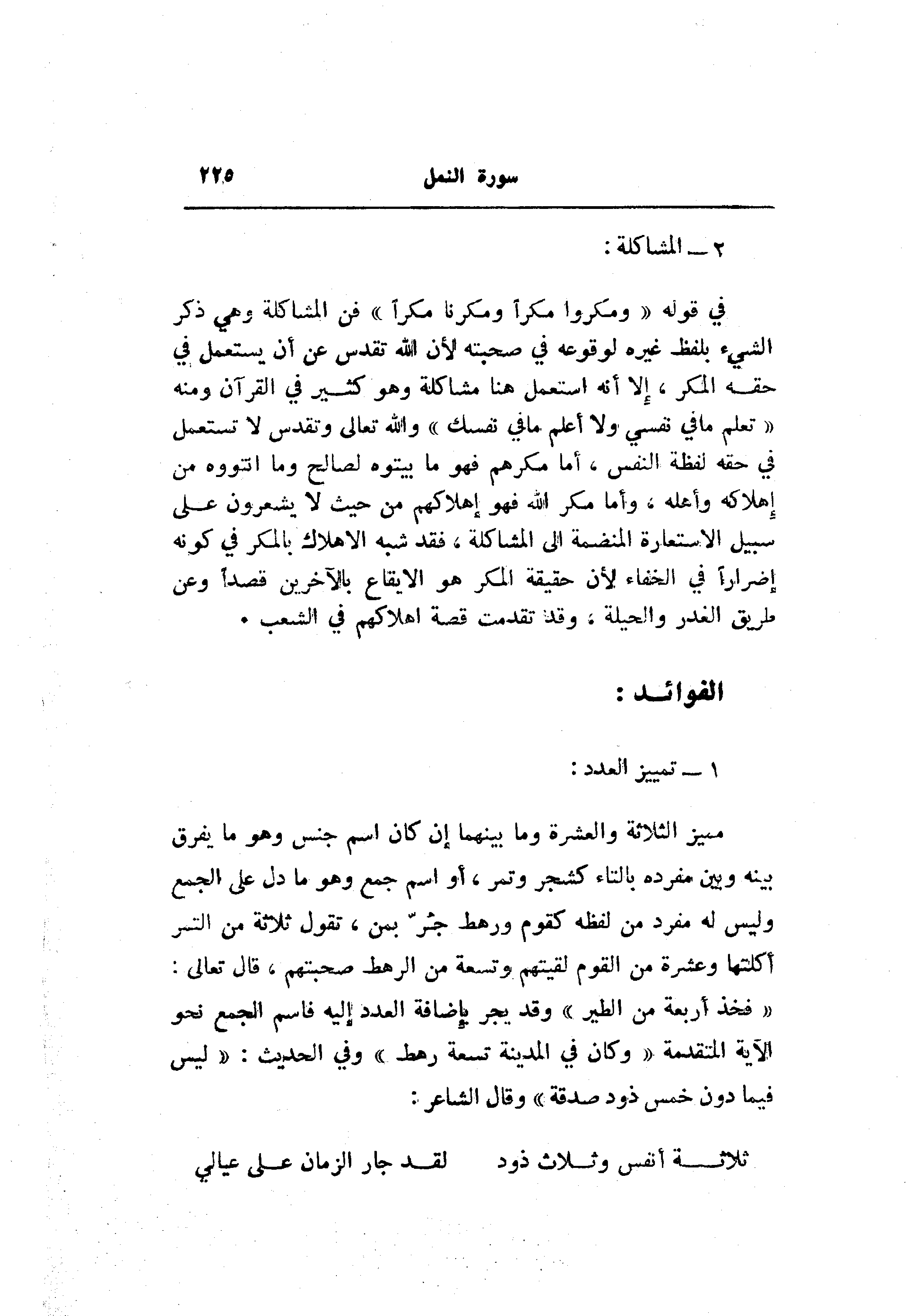 في قوله «ومكروا مكرا ومكرنا مكرا» فن المشاكلة وهي ذكر الشيء بلفظ غيره لوقوعه في صحبته لأن الله تقدس عن أن يستعمل في حقه المكر، إلا أنه استعمل هنا مشاكلة وهو كثير في القرآن ومنه «تعلم ما في نفسي ولا أعلم ما في نفسك» والله تعالى وتقدس لا تستعمل في حقه لفظة النفس، أما مكرهم فهو ما بيتوه لصالح وما انتووه من إهلاكه وأهله، وأما مكر الله فهو إهلاكهم من حيث لا يشعرون على سبيل الاستعارة المنضمة الى المشاكلة، فقد شبه الإهلاك بالمكر في كونه إضرارا في الخفاء لأن حقيقة المكر هو الإيقاع بالآخرين قصدا وعن طريق الغدر والحيلة، وقد تقدمت قصة إهلاكهم في الشعب.