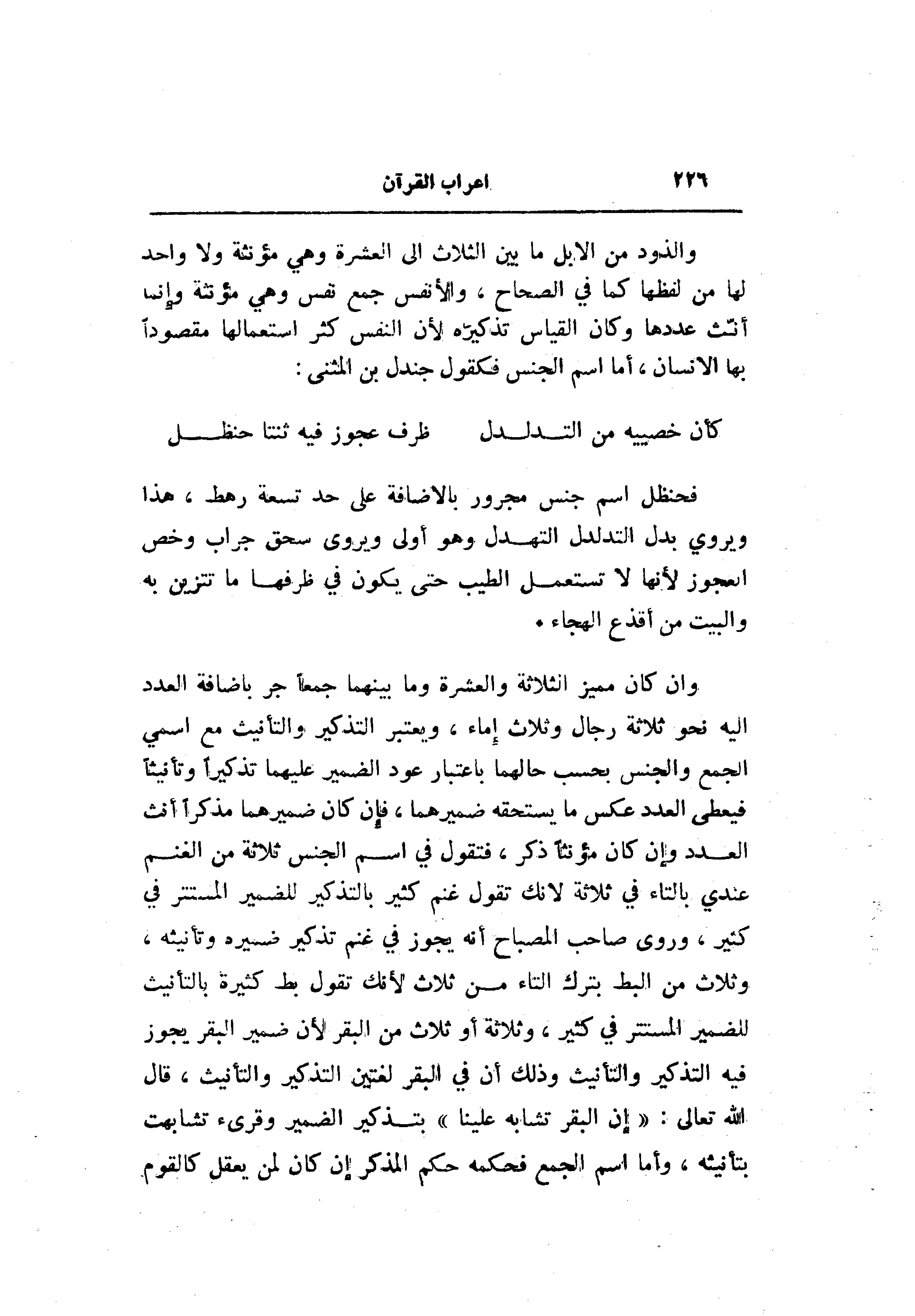 وان كان مميز الثلاثة والعشرة وما بينهما جمعا جر باضافة العدد اليه نحو ثلاثة رجال وثلاث إماء، ويعتبر التذكير والتأنيث مع اسمي الجمع والجنس بحسب حالهما باعتبار عود الضمير عليهما تذكيرا وتأنيثا فيعطى العدد عكس ما يستحقه ضميرهما، فإن كان ضميرهما مذكرا أنث العدد وإن كان مؤنثا ذكر، فتقول في اسم الجنس ثلاثة من الغنم عندي بالتاء في ثلاثة لانك تقول غنم كثير بالتذكير للضمير المستتر في كثير، وروى صاحب المصباح أنه يجوز في غنم تذكير ضميره وتأنيثه، وثلاث من البط بترك التاء من ثلاث لأنك تقول بط كثيرة بالتأنيث للضمير المستتر في كثير، وثلاثة أو ثلاث من البقر لأن ضمير البقر يجوز فيه التذكير والتأنيث وذلك أن في البقر لغتين التذكير والتأنيث، قال الله تعالى: «إن البقر تشابه علينا» بتذكير الضمير وقرئ تشابهت بتأنيثه، وأما اسم الجمع فحكمه حكم المذكر إن كان لمن يعقل كالقوم