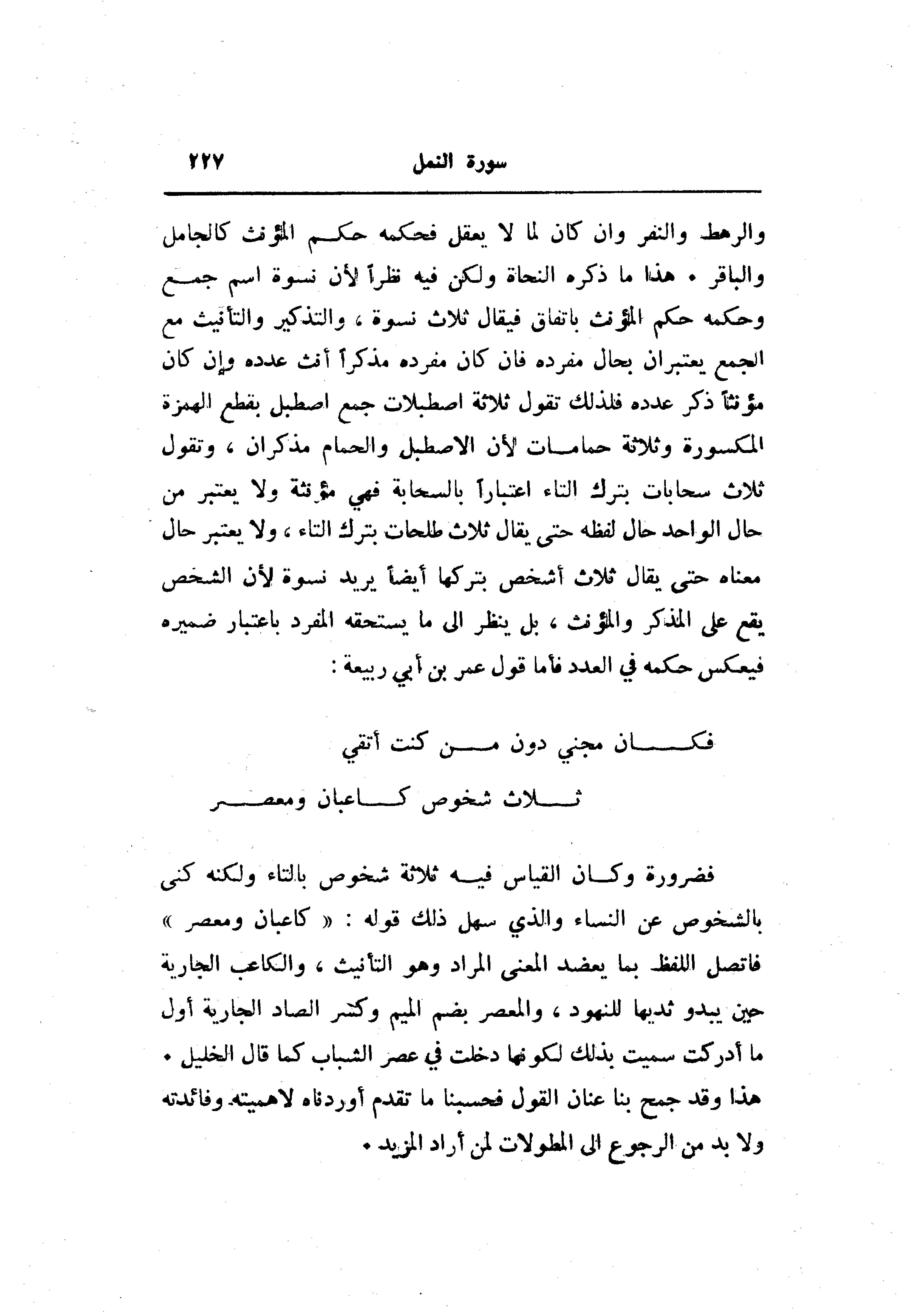 والرهط والنفر وان كان لما لا يعقل فحكمه حكم المؤنث كالجامل والباقر. هذا ما ذكره النحاة ولكن فيه نظرا لأن نسوة اسم جمع وحكمه حكم المؤنث باتفاق فيقال ثلاث نسوة، والتذكير والتأنيث مع الجمع يعتبران بحال مفرده فان كان مفرده مذكرا أنث عدده وإن كان مؤنثا ذكر عدده فلذلك تقول ثلاثة اصطبلات جمع إصطبل بقطع الهمزة المكسورة وثلاثة حمامات لأن الاصطبل والحمام مذكران، وتقول ثلاث سحابات بترك التاء اعتبارا بالسحابة فهي مؤنثة ولا يعتبر من حال الواحد حال لفظه حتى يقال ثلاث طلحات بترك التاء، ولا يعتبر حال معناه حتى يقال ثلاث أشخص بتركها أيضا يريد نسوة لأن الشخص يقع على المذكر والمؤنث، بل ينظر الى ما يستحقه المفرد باعتبار ضميره فيعكس حكمه في العدد فأما قول عمر بن أبي ربيعة: