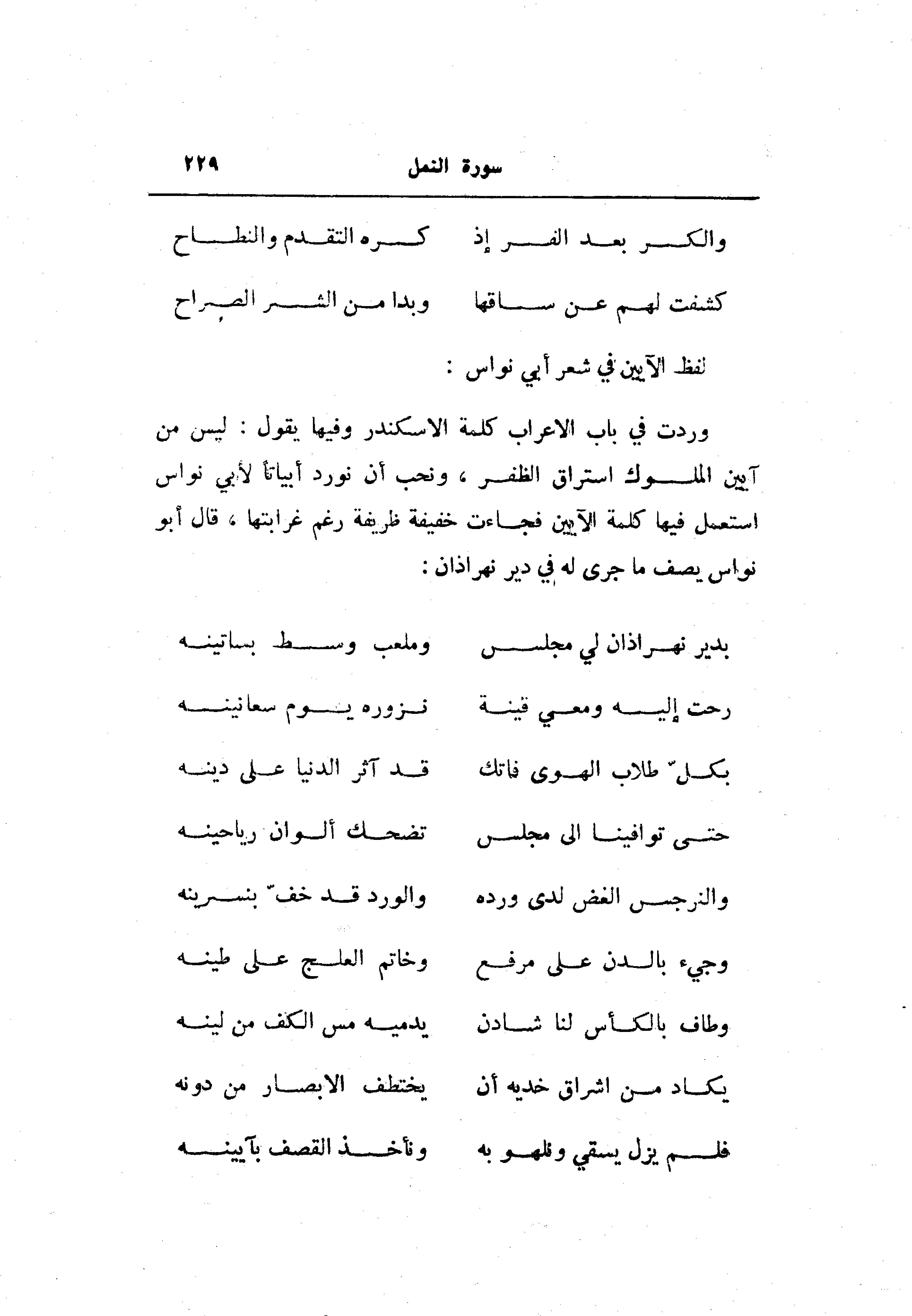 وردت في باب الإعراب كلمة الإسكندر وفيها يقول: ليس من آيين الملوك استراق الظفر، ونحب أن نورد أبياتا لأبي نواس استعمل فيها كلمة الآيين فجاءت خفيفة ظريفة رغم غرابتها، قال أبو نواس يصف ما جرى له في دير نهراذان:
