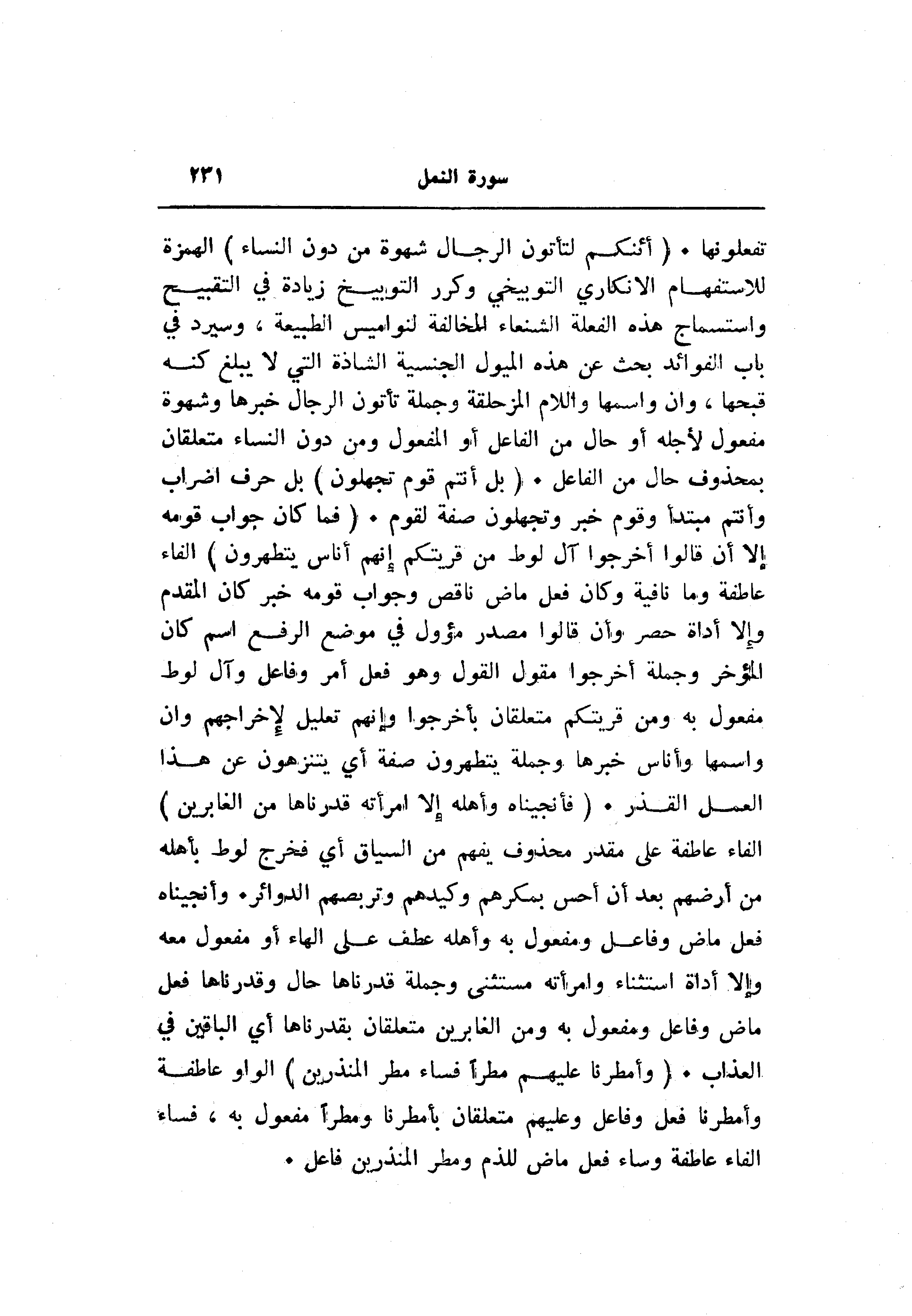 تفعلونها. (أَإِنَّكُمْ لَتَأْتُونَ الرِّجالَ شَهْوَةً مِنْ دُونِ النِّساءِ) الهمزة للاستفهام الانكاري التوبيخي وكرر التوبيخ زيادة في التقبيح واستسماج هذه الفعلة الشنعاء المخالفة لنواميس الطبيعة، وسيرد في باب الفوائد بحث عن هذه الميول الجنسية الشاذة التي لا يبلغ كنه قبحها، وان واسمها واللام المزحلقة وجملة تأتون الرجال خبرها وشهوة مفعول لأجله أو حال من الفاعل أو المفعول ومن دون النساء متعلقان بمحذوف حال من الفاعل. (بَلْ أَنْتُمْ قَوْمٌ تَجْهَلُونَ) بل حرف إضراب وأنتم مبتدأ وقوم خبر وتجهلون صفة لقوم. (فَما كانَ جَوابَ قَوْمِهِ إِلَّا أَنْ قالُوا أَخْرِجُوا آلَ لُوطٍ مِنْ قَرْيَتِكُمْ إِنَّهُمْ أُناسٌ يَتَطَهَّرُونَ) الفاء عاطفة وما نافية وكان فعل ماض ناقص وجواب قومه خبر كان المقدم وإلا أداة حصر وأن قالوا مصدر مؤول في موضع الرفع اسم كان المؤخر وجملة أخرجوا مقول القول وهو فعل أمر وفاعل وآل لوط مفعول به ومن قريتكم متعلقان بأخرجوا وإنهم تعليل لإخراجهم وان واسمها وأناس خبرها وجملة يتطهرون صفة أي يتنزهون عن هذا العمل القذر. (فَأَنْجَيْناهُ وَأَهْلَهُ إِلَّا امْرَأَتَهُ قَدَّرْناها مِنَ الْغابِرِينَ) الفاء عاطفة على مقدر محذوف يفهم من السياق أي فخرج لوط بأهله من أرضهم بعد أن أحس بمكرهم وكيدهم وتربصهم الدوائر. وأنجيناه فعل ماض وفاعل ومفعول به وأهله عطف على الهاء أو مفعول معه وإلا أداة استثناء وامرأته مستثنى وجملة قدرناها حال وقدرناها فعل ماض وفاعل ومفعول به ومن الغابرين متعلقان بقدرناها أي الباقين في العذاب. (وَأَمْطَرْنا عَلَيْهِمْ مَطَراً فَساءَ مَطَرُ الْمُنْذَرِينَ) الواو عاطفة وأمطرنا فعل وفاعل وعليهم متعلقان بأمطرنا ومطرا مفعول به، فساء الفاء عاطفة وساء فعل ماض للذم ومطر المنذرين فاعل.