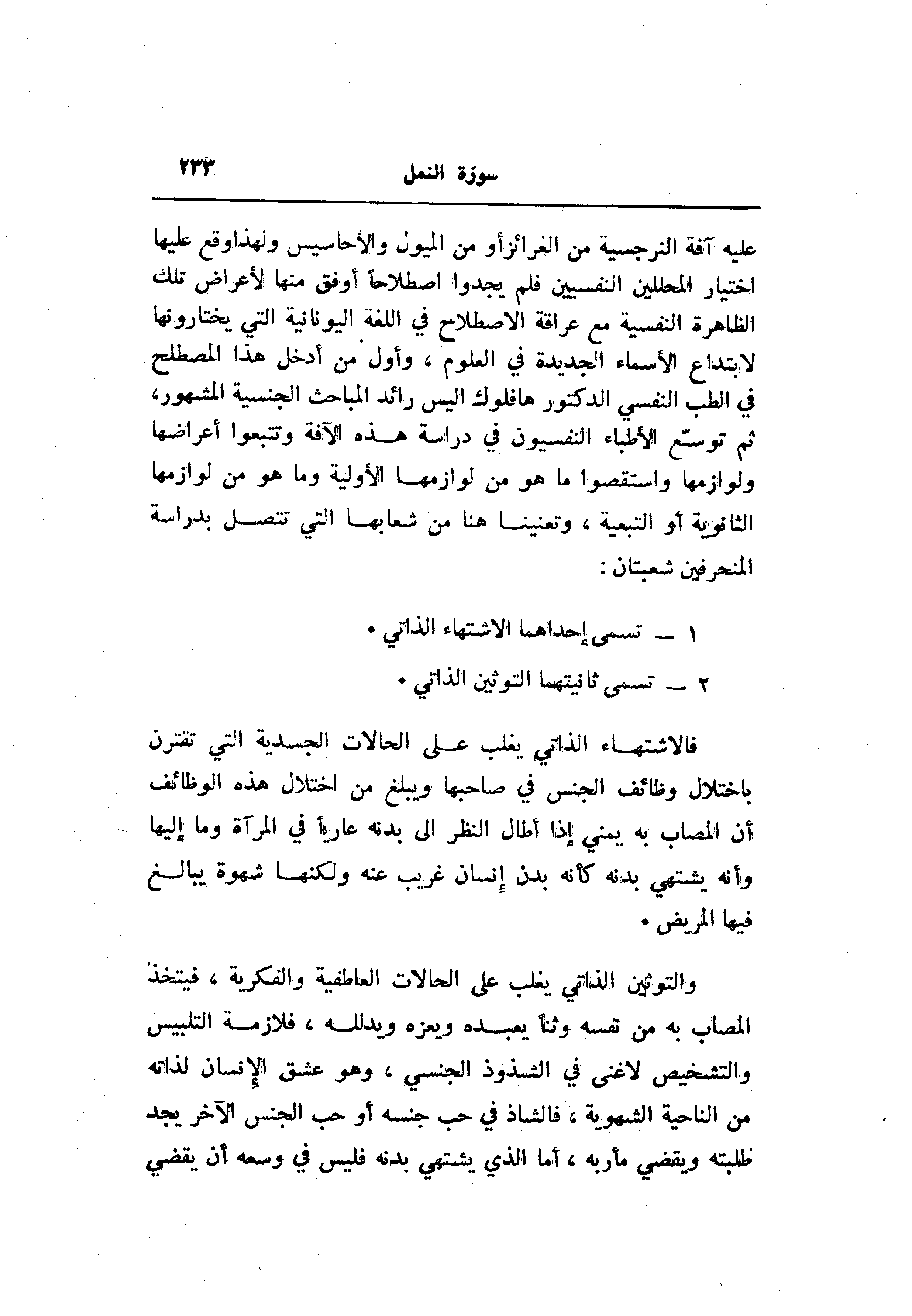 عليه آفة النرجسية من الغرائز أو من الميول والأحاسيس ولهذا وقع عليها اختيار المحللين النفسيين فلم يجدوا اصطلاحا أوفق منها لأعراض تلك الظاهرة النفسية مع عراقة الاصطلاح في اللغة اليونانية التي يختارونها لابتداع الأسماء الجديدة في العلوم، وأول من أدخل هذا المصطلح في الطب النفسي الدكتور هافلوك أليس رائد المباحث الجنسية المشهور، ثم توسّع الأطباء النفسيون في دراسة هذه الآفة وتتبعوا أعراضها ولوازمها واستقصوا ما هو من لوازمها الأولية وما هو من لوازمها الثانوية أو التبعية، وتعنينا هنا من شعابها التي تتصل بدراسة المنحرفين شعبتان: