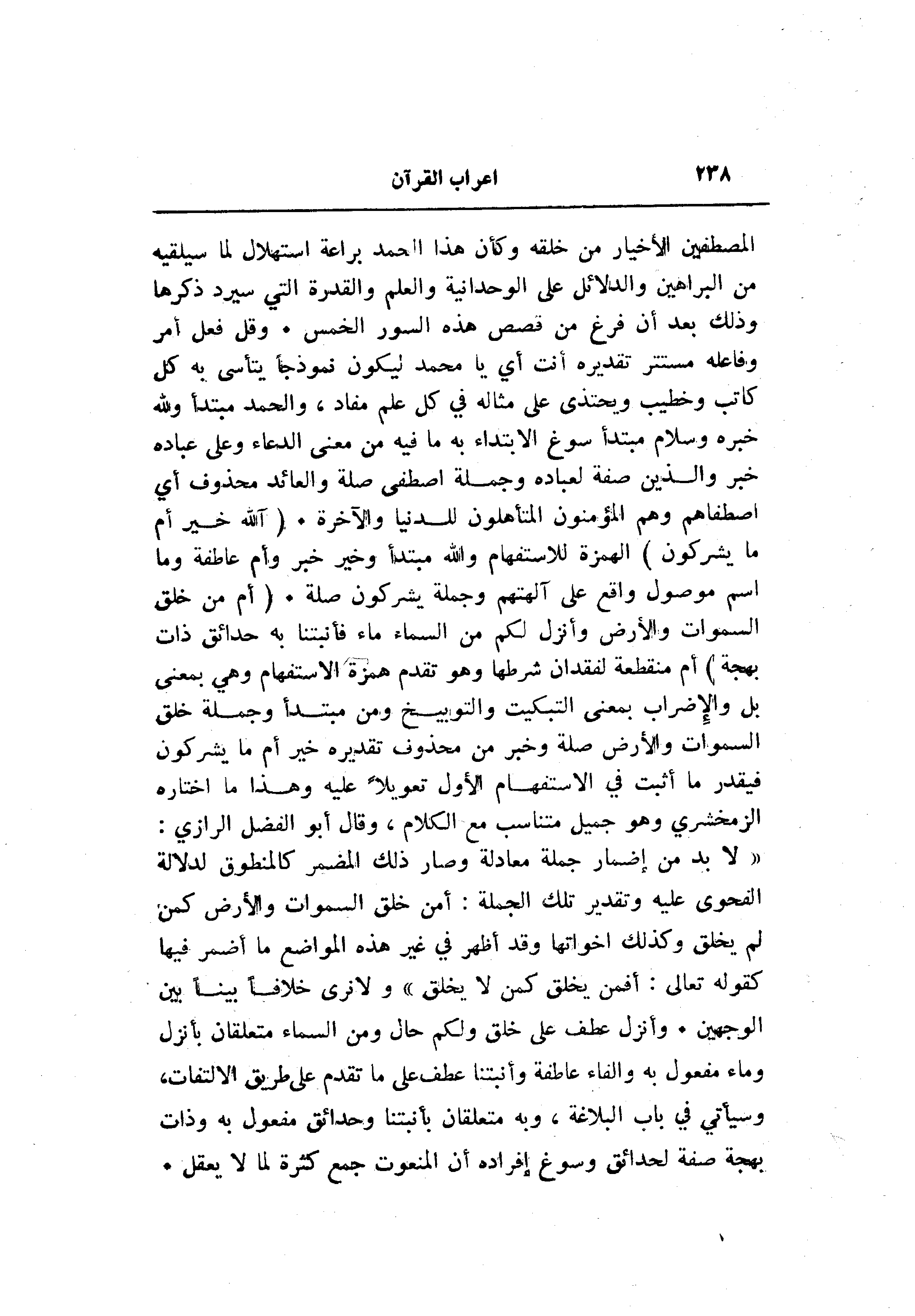 المصطفين الأخيار من خلقه وكأن هذا الحمد براعة استهلال لما سيلقيه من البراهين والدلائل على الوحدانية والعلم والقدرة التي سيرد ذكرها وذلك بعد أن فرغ من قصص هذه السور الخمس. وقل فعل أمر وفاعله مستتر تقديره أنت أي يا محمد ليكون نموذجا يتأسى به كل كاتب وخطيب ويحتذى على مثاله في كل علم مفاد، والحمد مبتدأ ولله خبره وسلام مبتدأ سوغ الابتداء به ما فيه من معنى الدعاء وعلى عباده خبر والذين صفة لعباده وجملة اصطفى صلة والعائد محذوف أي اصطفاهم وهم المؤمنون المتأهلون للدنيا والآخرة. (آللَّهُ خَيْرٌ أَمَّا يُشْرِكُونَ) الهمزة للاستفهام والله مبتدأ وخير خبر وأم عاطفة وما اسم موصول واقع على آلهتهم وجملة يشركون صلة. (أَمَّنْ خَلَقَ السَّماواتِ وَالْأَرْضَ وَأَنْزَلَ لَكُمْ مِنَ السَّماءِ ماءً فَأَنْبَتْنا بِهِ حَدائِقَ ذاتَ بَهْجَةٍ) أم منقطعة لفقدان شرطها وهو تقدم همزة الاستفهام وهي بمعنى بل والإضراب بمعنى التبكيت والتوبيخ ومن مبتدأ وجملة خلق السموات والأرض صلة وخبر من محذوف تقديره خير أم ما يشركون فيقدر ما أثبت في الاستفهام الأول تعويلا عليه وهذا ما اختاره الزمخشري وهو جميل متناسب مع الكلام، وقال أبو الفضل الرازي: