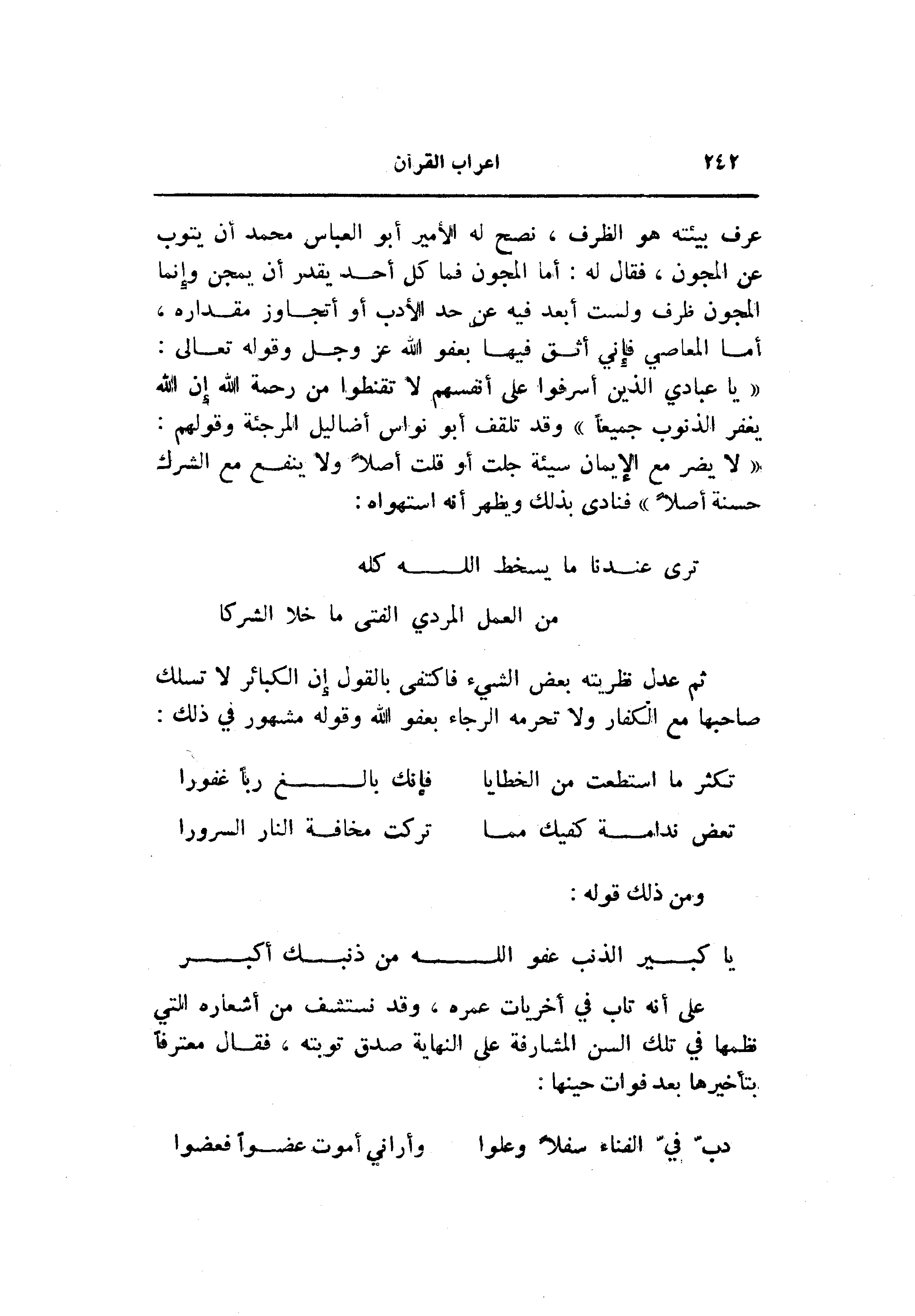 «يا عبادي الذين أسرفوا على أنفسهم لا تقنطوا من رحمة الله إن الله يغفر الذنوب جميعا» وقد تلقف أبو نواس أضاليل المرجئة وقولهم: