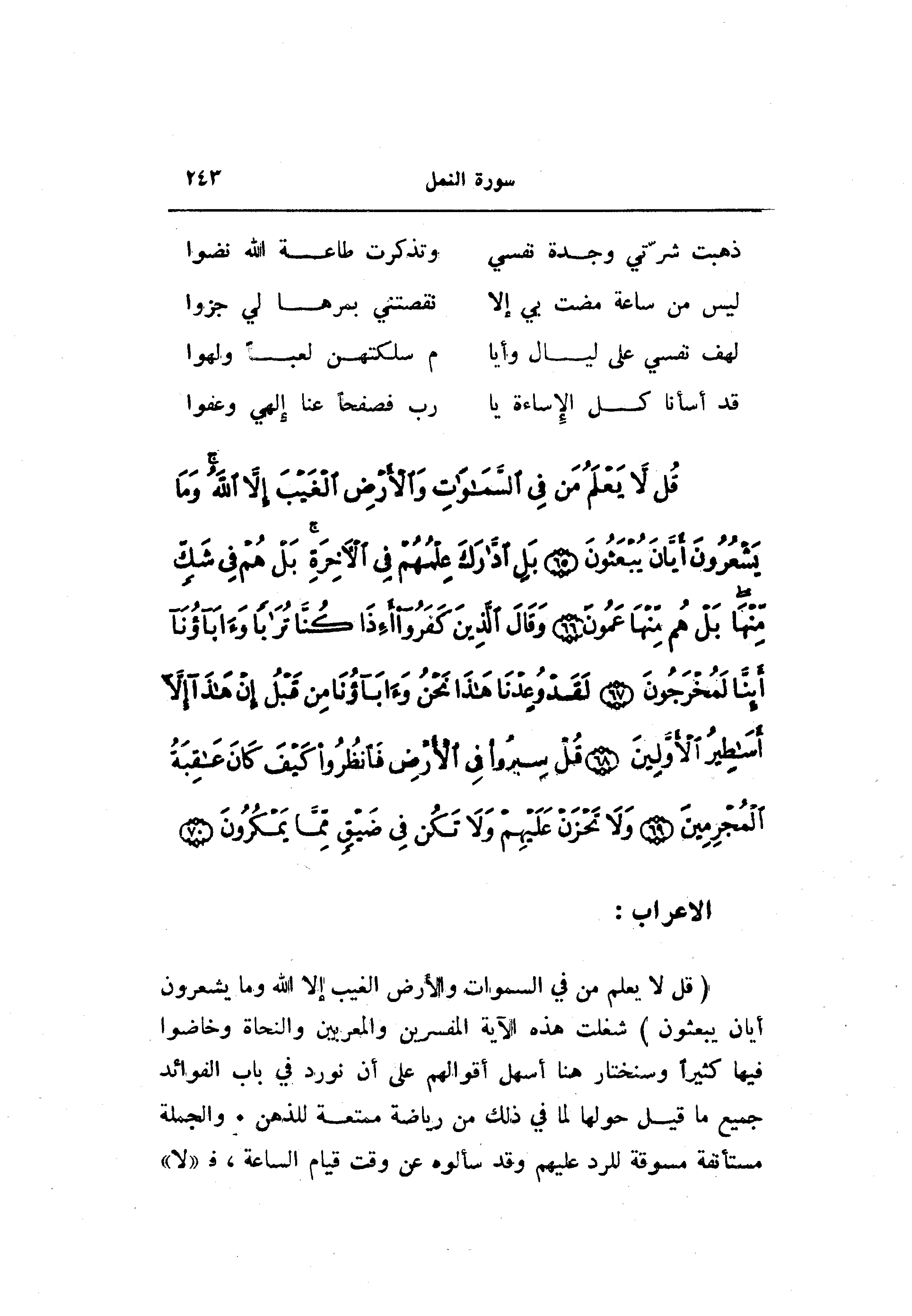 (قُلْ لا يَعْلَمُ مَنْ فِي السَّماواتِ وَالْأَرْضِ الْغَيْبَ إِلَّا اللَّهُ وَما يَشْعُرُونَ أَيَّانَ يُبْعَثُونَ) شغلت هذه الآية المفسرين والمعربين والنحاة وخاضوا فيها كثيرا وسنختار هنا أسهل أقوالهم على أن نورد في باب الفوائد جميع ما قيل حولها لما في ذلك من رياضة ممتعة للذهن. والجملة مستأنفة مسوقة للرد عليهم وقد سألوه عن وقت قيام الساعة، ف «لا»