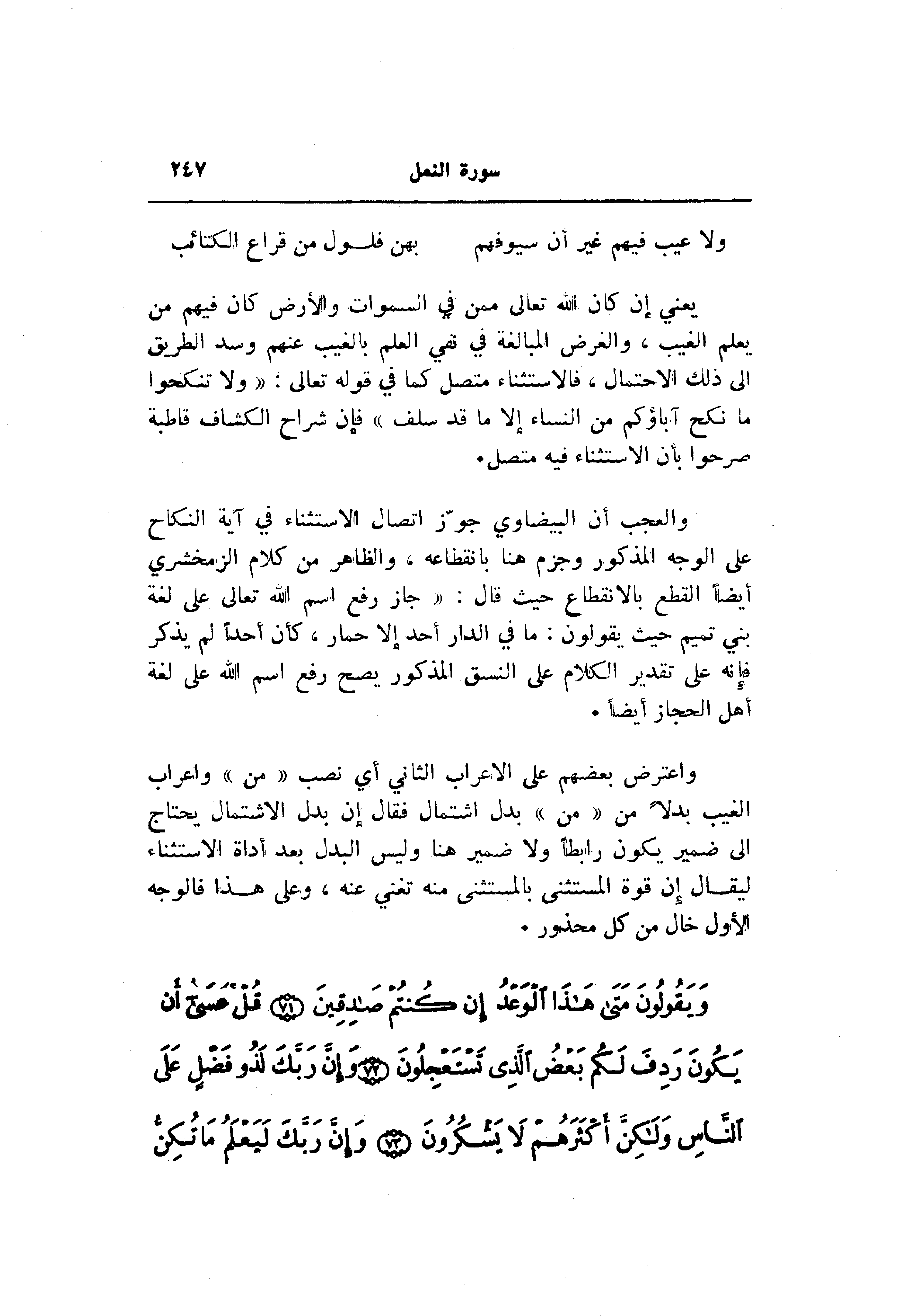 واعترض بعضهم على الاعراب الثاني أي نصب «من» واعراب الغيب بدلا من «من» بدل اشتمال فقال إن بدل الاشتمال يحتاج الى ضمير يكون رابطا ولا ضمير هنا وليس البدل بعد أداة الاستثناء ليقال إن قوة المستثنى بالمستثنى منه تغني عنه، وعلى هذا فالوجه الأول خال من كل محذور.